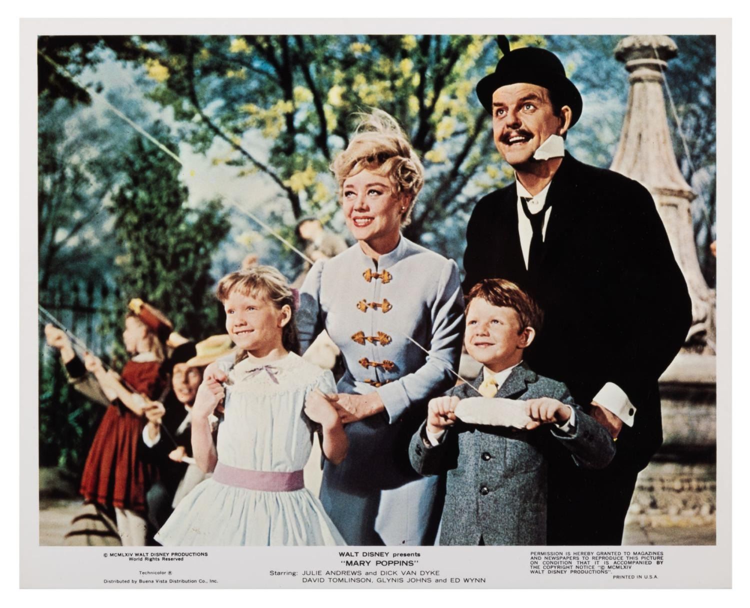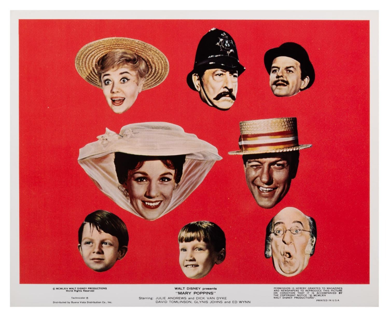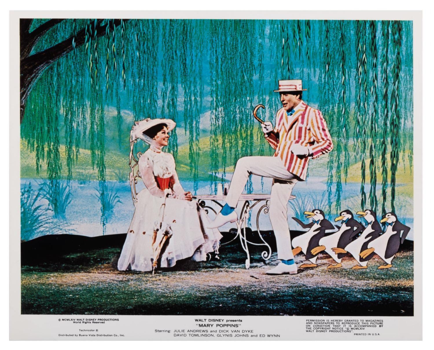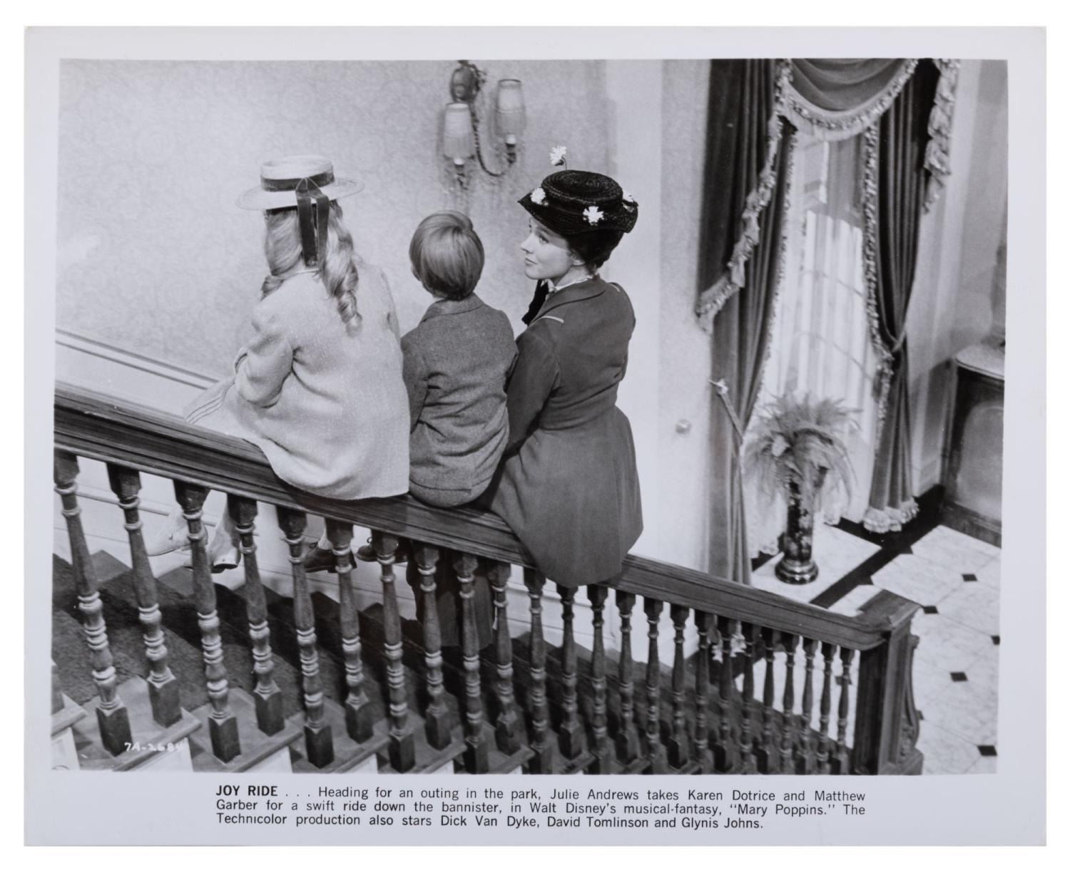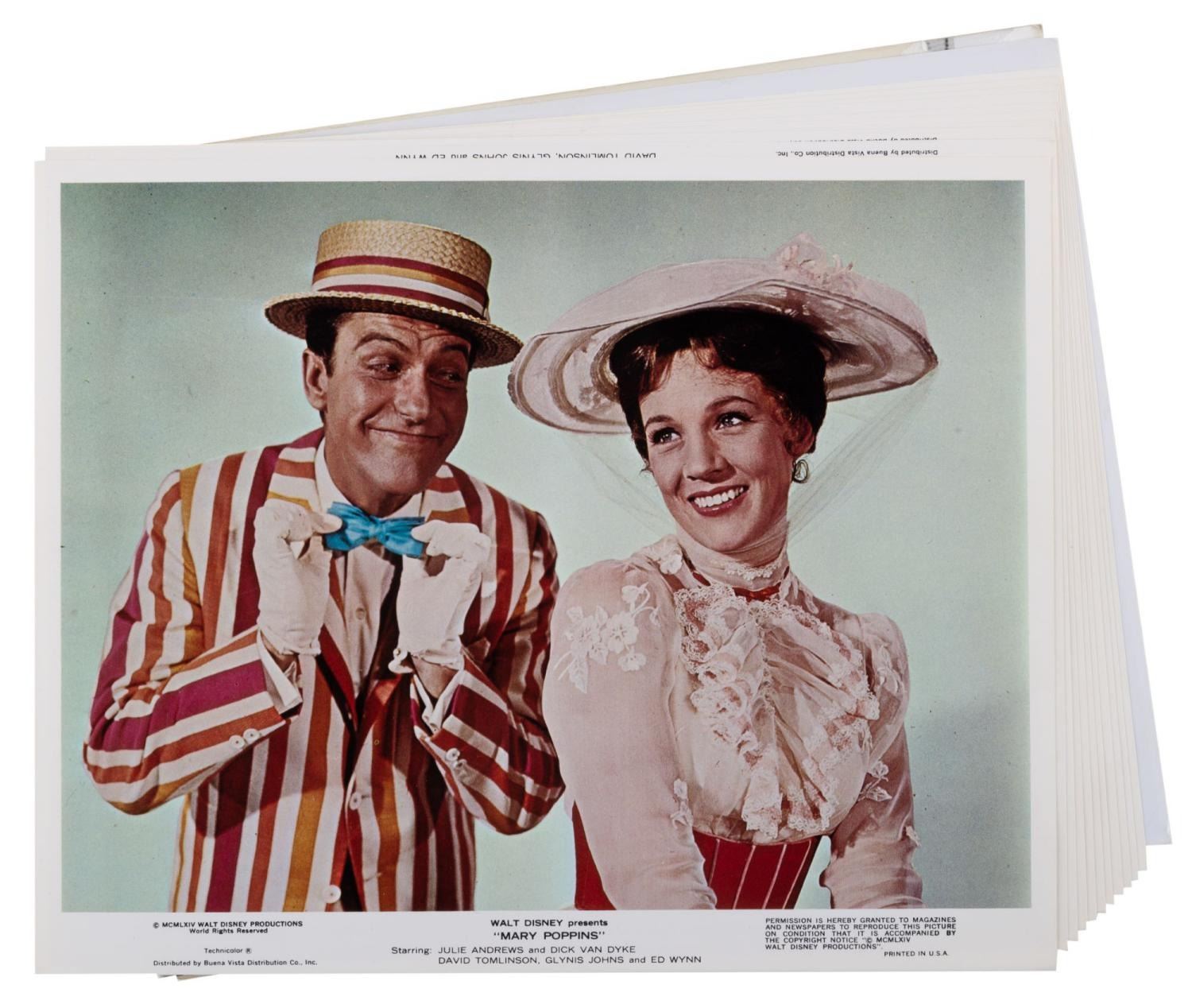 (Disney, 1964) A collection of 13 publicity stills for Walt Disney's award-winning "Mary Poppins." Eleven photos are in color, and two are black and white. Measuring 8" x 10", the photos are in fair to very good condition with light edge wear to 12 of the photos and heavy edge wear, discoloration, cracked emulsion, and paper loss to one.