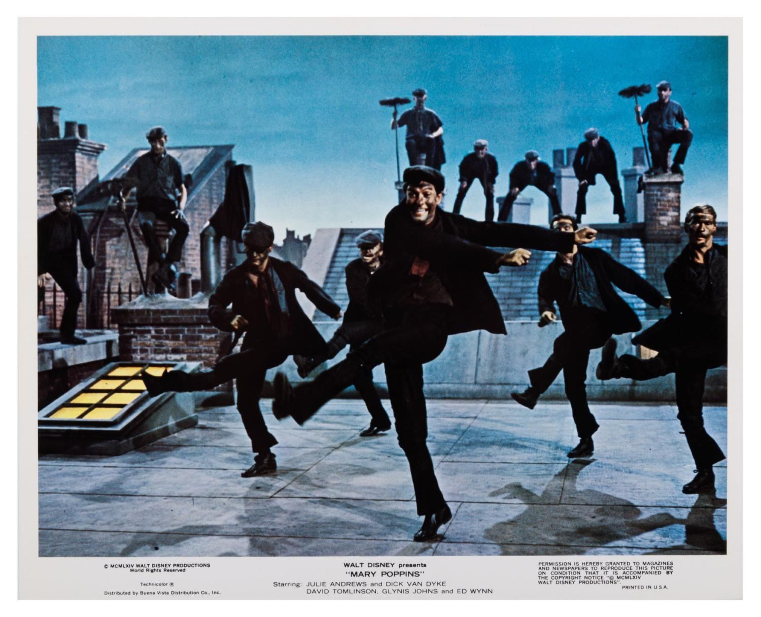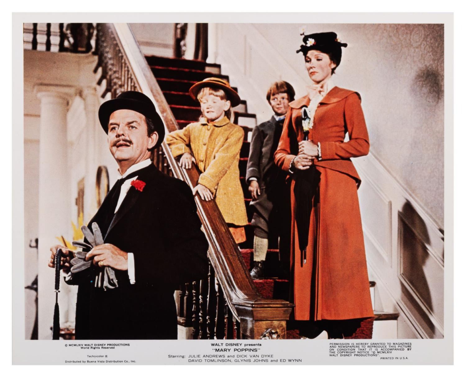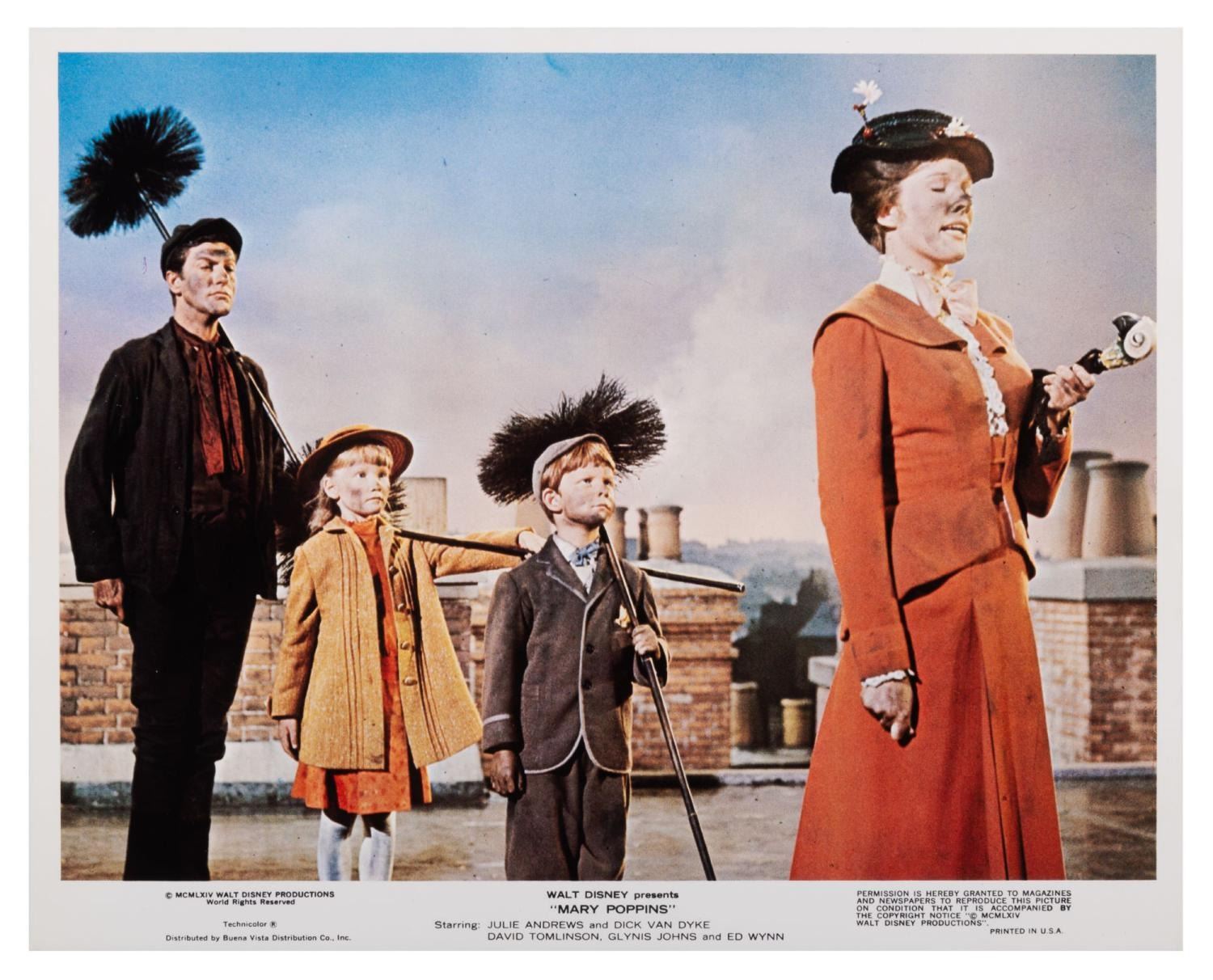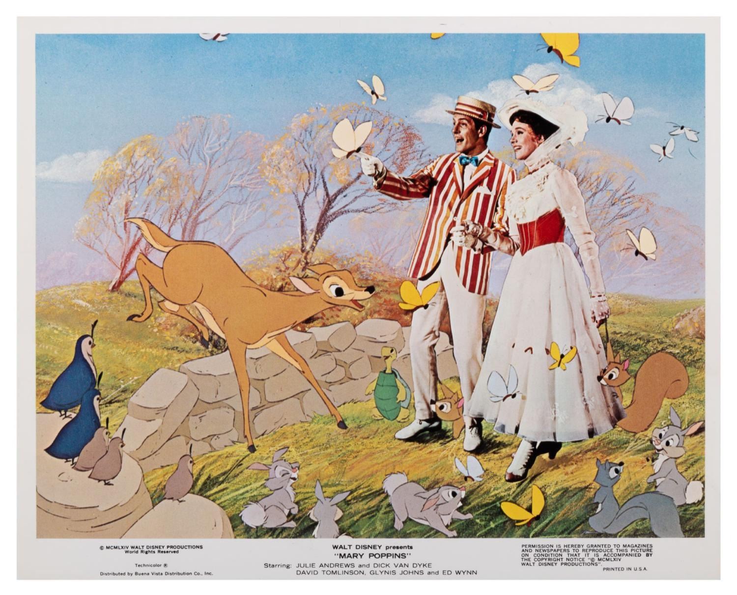 (Disney, 1964) A collection of 13 publicity stills for Walt Disney's award-winning "Mary Poppins." Eleven photos are in color, and two are black and white. Measuring 8" x 10", the photos are in fair to very good condition with light edge wear to 12 of the photos and heavy edge wear, discoloration, cracked emulsion, and paper loss to one.