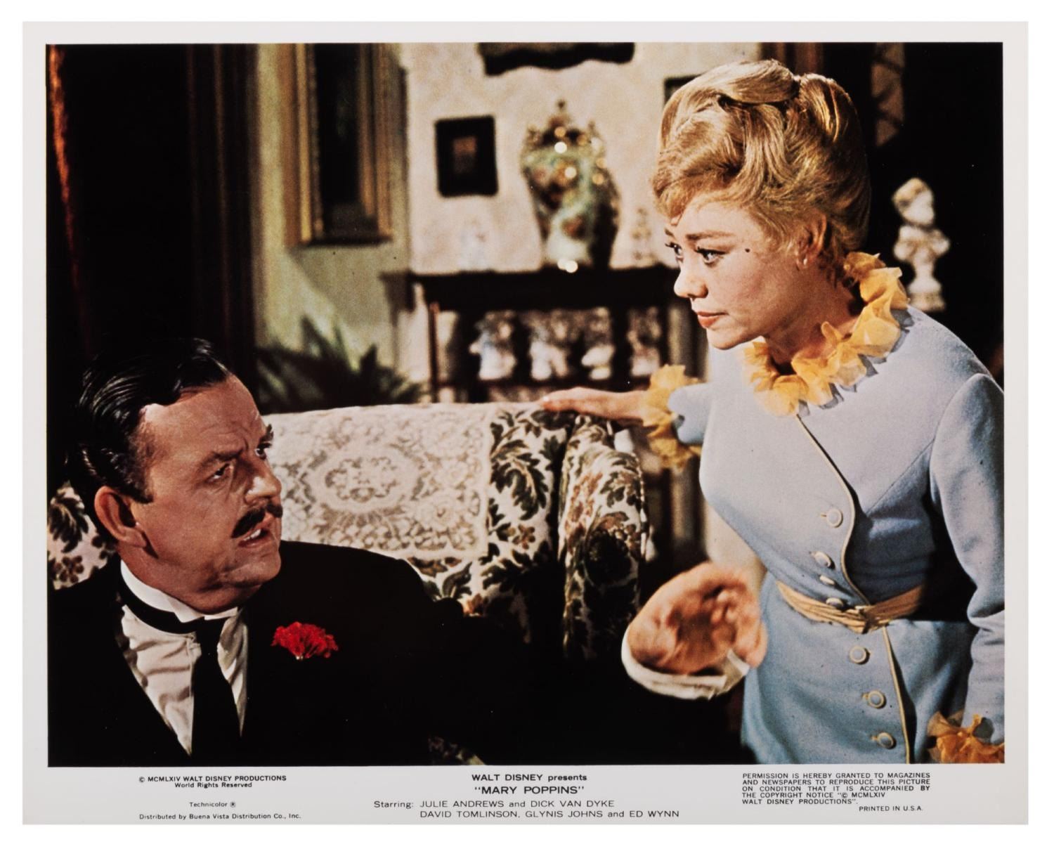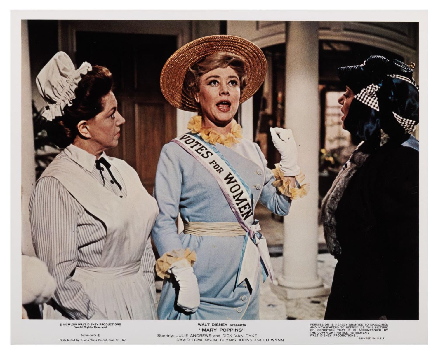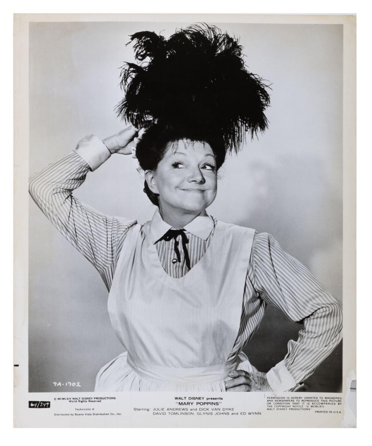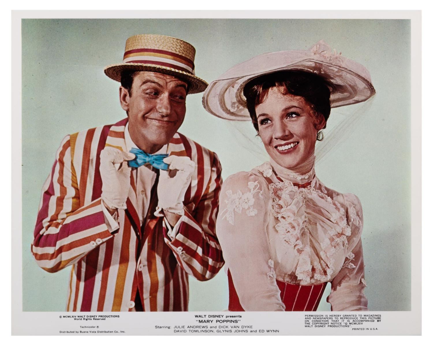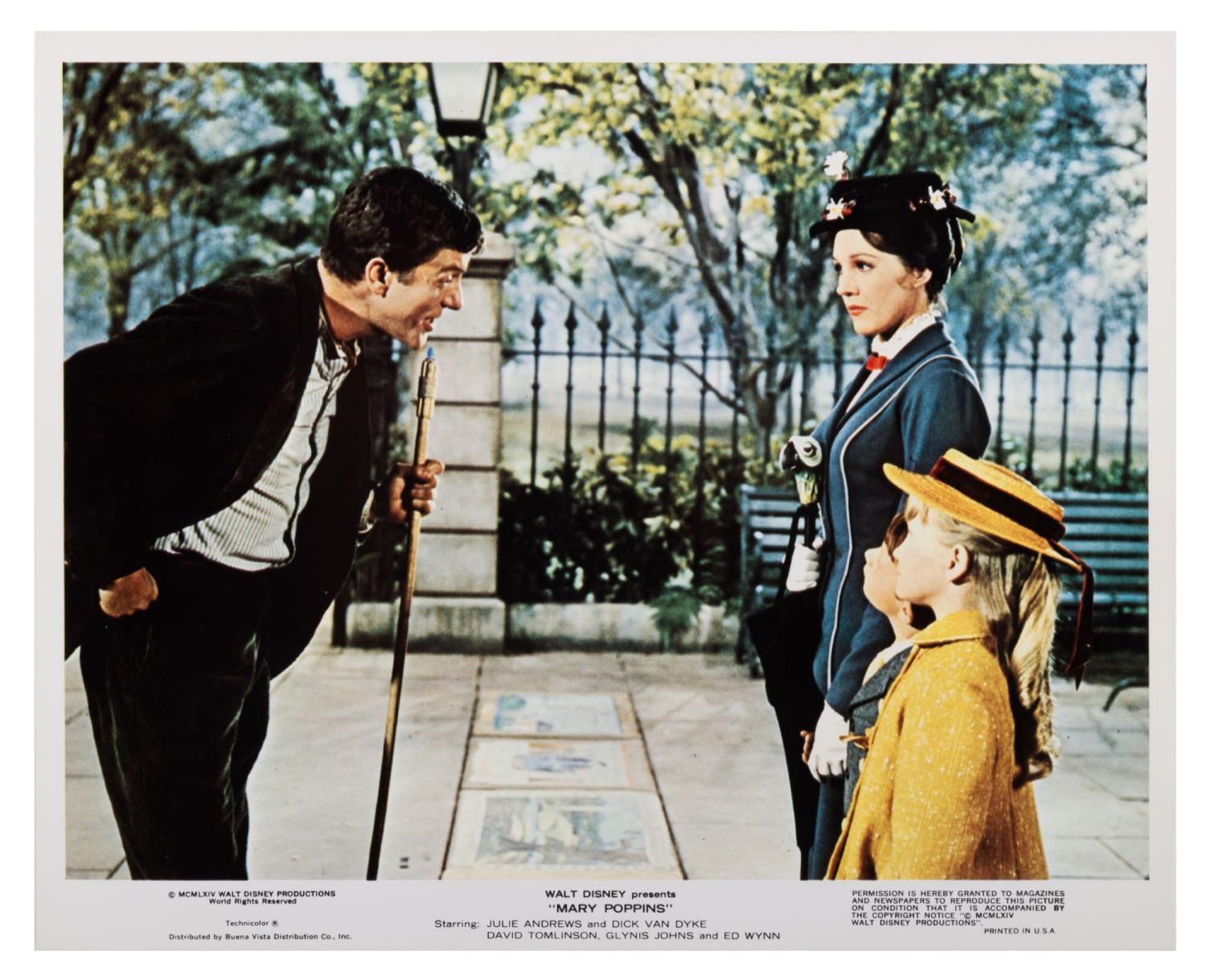 (Disney, 1964) A collection of 13 publicity stills for Walt Disney's award-winning "Mary Poppins." Eleven photos are in color, and two are black and white. Measuring 8" x 10", the photos are in fair to very good condition with light edge wear to 12 of the photos and heavy edge wear, discoloration, cracked emulsion, and paper loss to one.