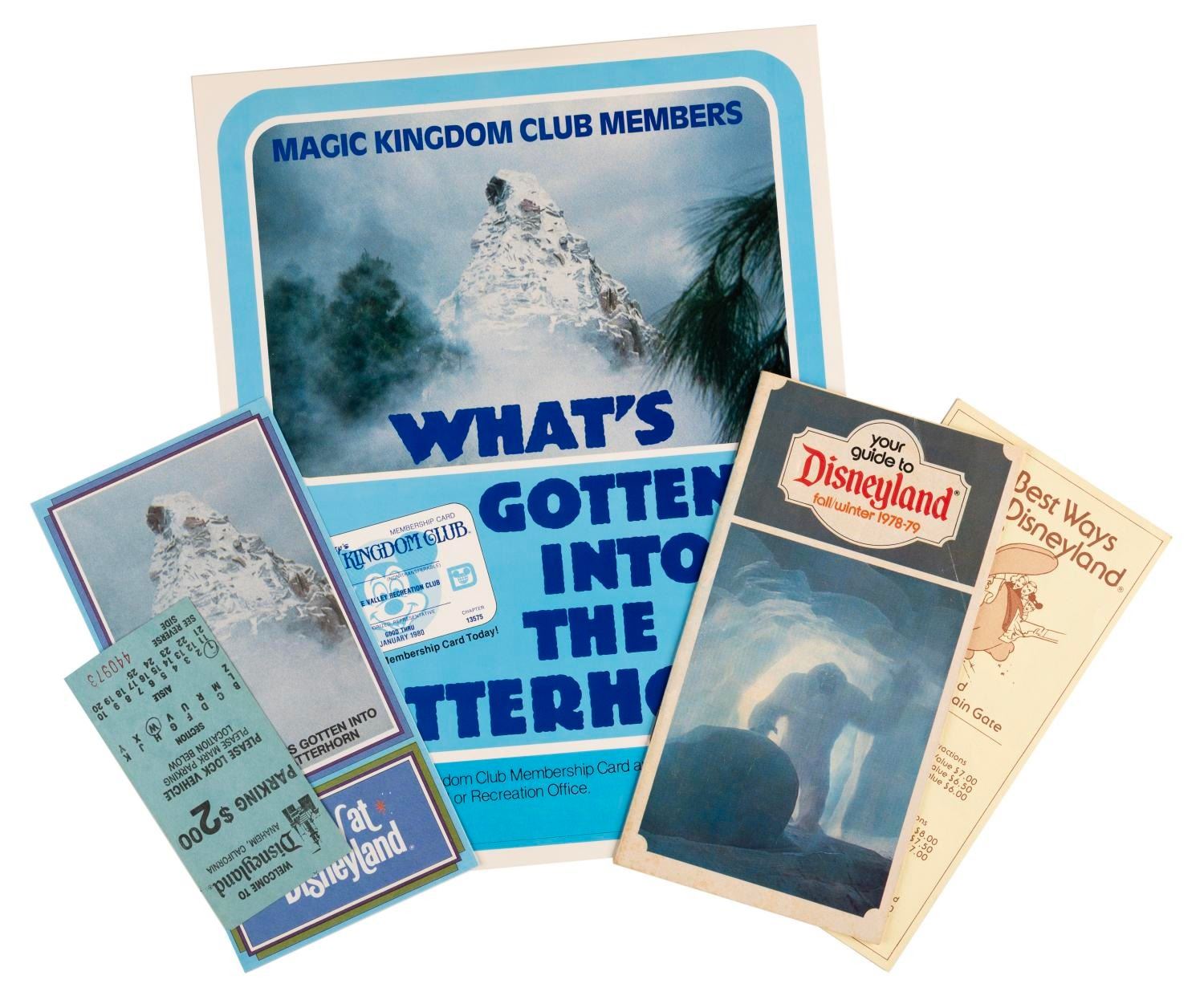 (Disneyland, 1978-1984) A collection of souvenirs from the Matterhorn Bobsleds 1978 refurbishment. Included are a "What's Gotten Into the Matterhorn" gate pamphlet and Magic Kingdom Club flyer, a "Best Ways to See Disneyland" flyer, and a "Today at Disneyland" pamphlet. Also included is a 1984 parking ticket. Measuring from 2" x 4" to 8.5" x 11", the items are in very good to good condition with light wear from handling and creasing, edge wear, spotting and discoloration from age.