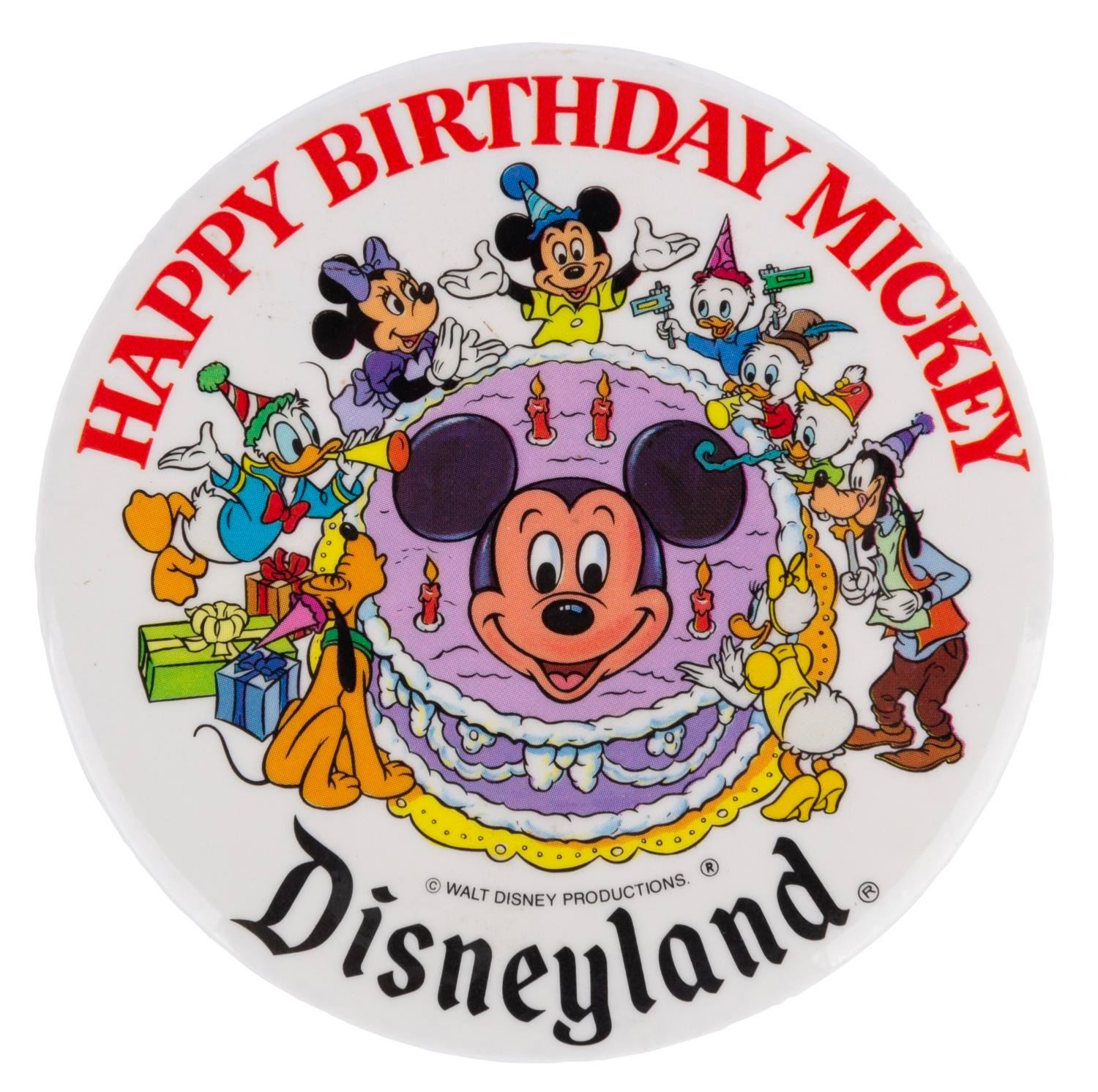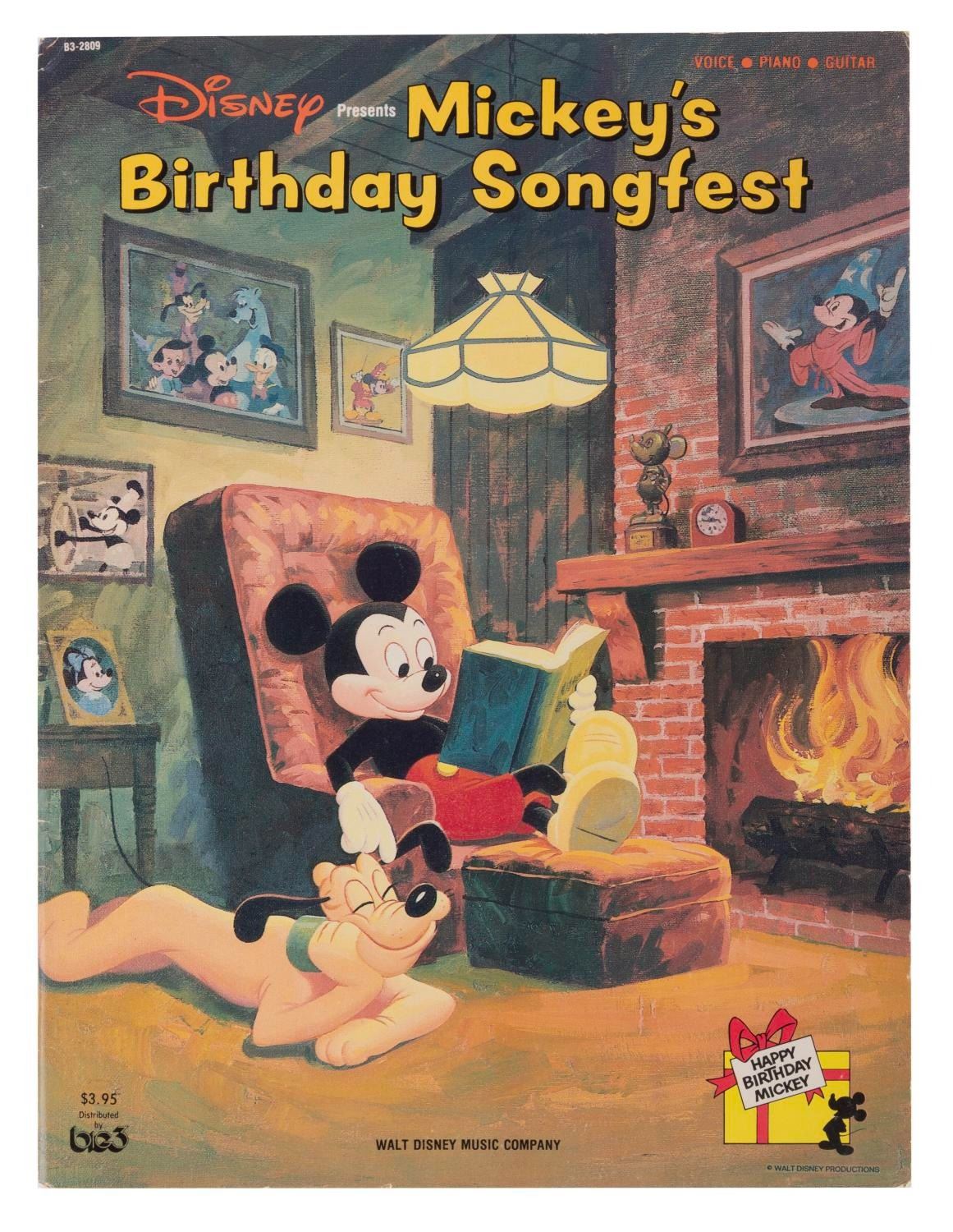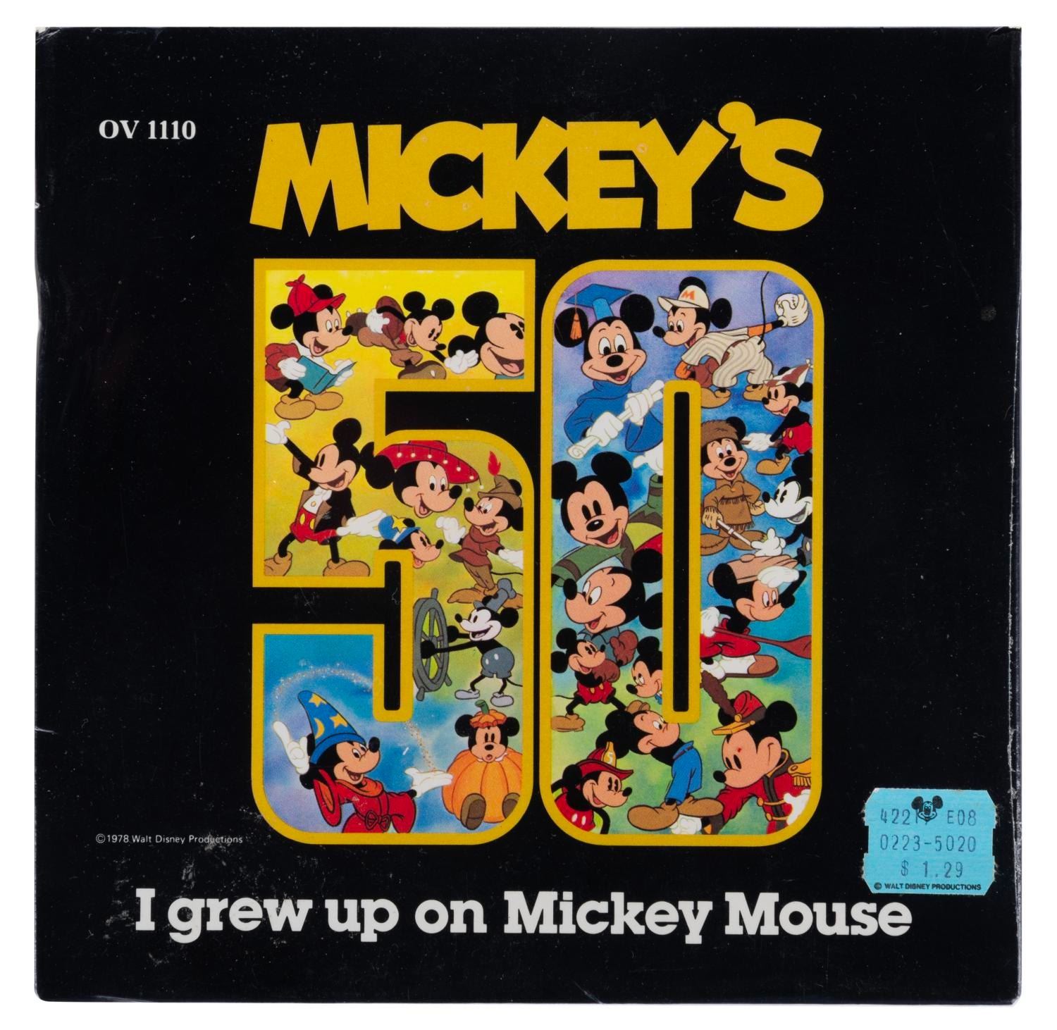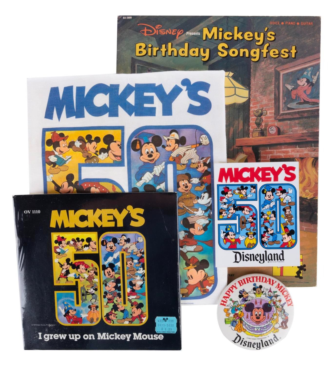 (Disneyland, 1978) A collection of souvenirs commemorating Mickey's 50th birthday including a "Mickey's Birthday Songfest" book, a sticker, an unopened "Mickey's 50th: I Grew Up on Mickey Mouse" 45 RPM record, a pinback button, and a large t-shirt. Measuring from the 3.5" diameter button to the 9" x 12" book, the souvenirs are in very good condition with light wear from use, a small crease on the top right corner of the record's sleeve, and an area of discoloration on the t-shirt, likely from being stored folded.