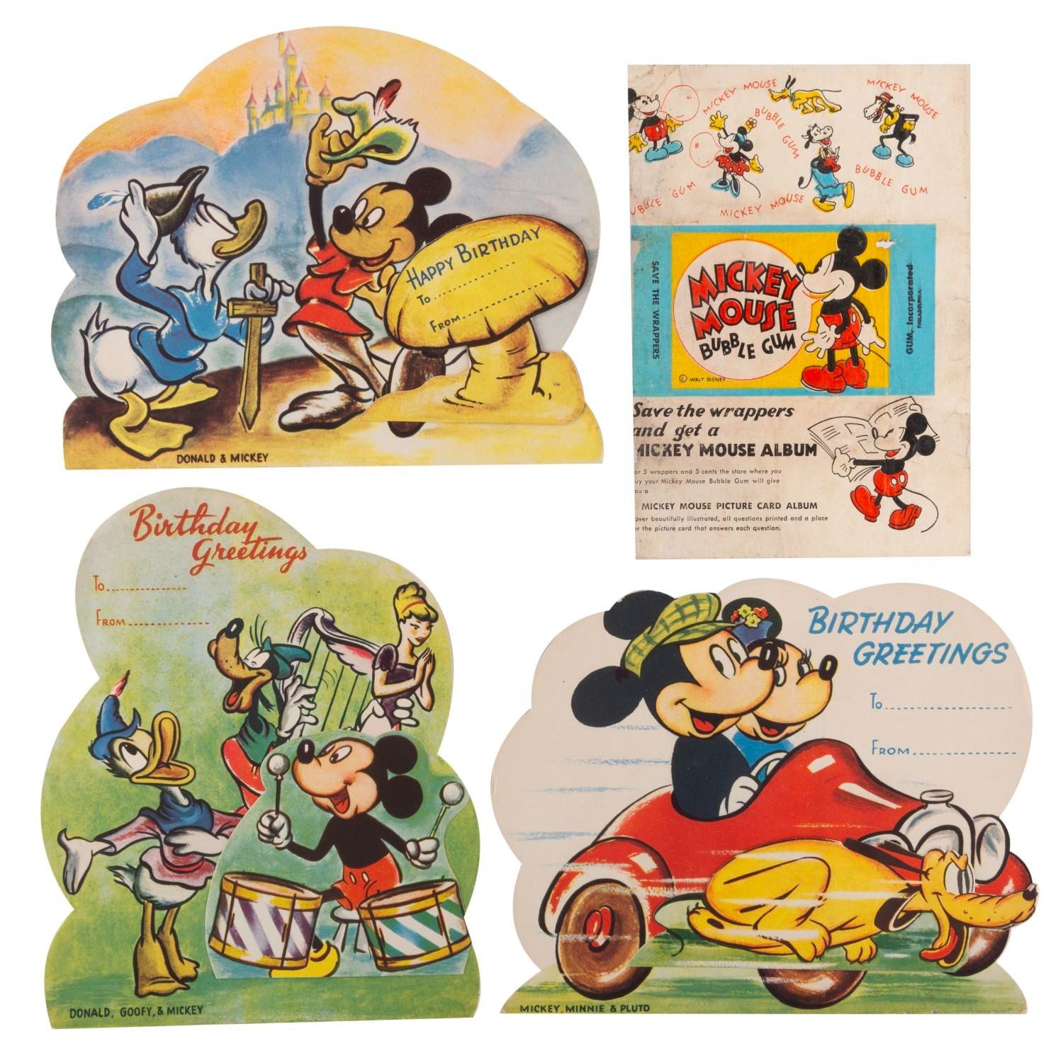 (Disney, 1940s-50s) A collection of three pop-up birthday cards and a Mickey Mouse bubble gum wrapper. The cards which feature Mickey, Minnie, Donald, Goofy, and Pluto have a foldable stand on the back allowing for them to be displayed upright. Measuring between 6.5" x 8" to 8" x 6.5", the unused cards display in good to very good condition with light edge wear and creasing and light discoloration from age. The waxpaper bubble gum wrapper measures 5" x 7" and displays in fair condition with light edge wear and tear and creases, and heavy soiling.