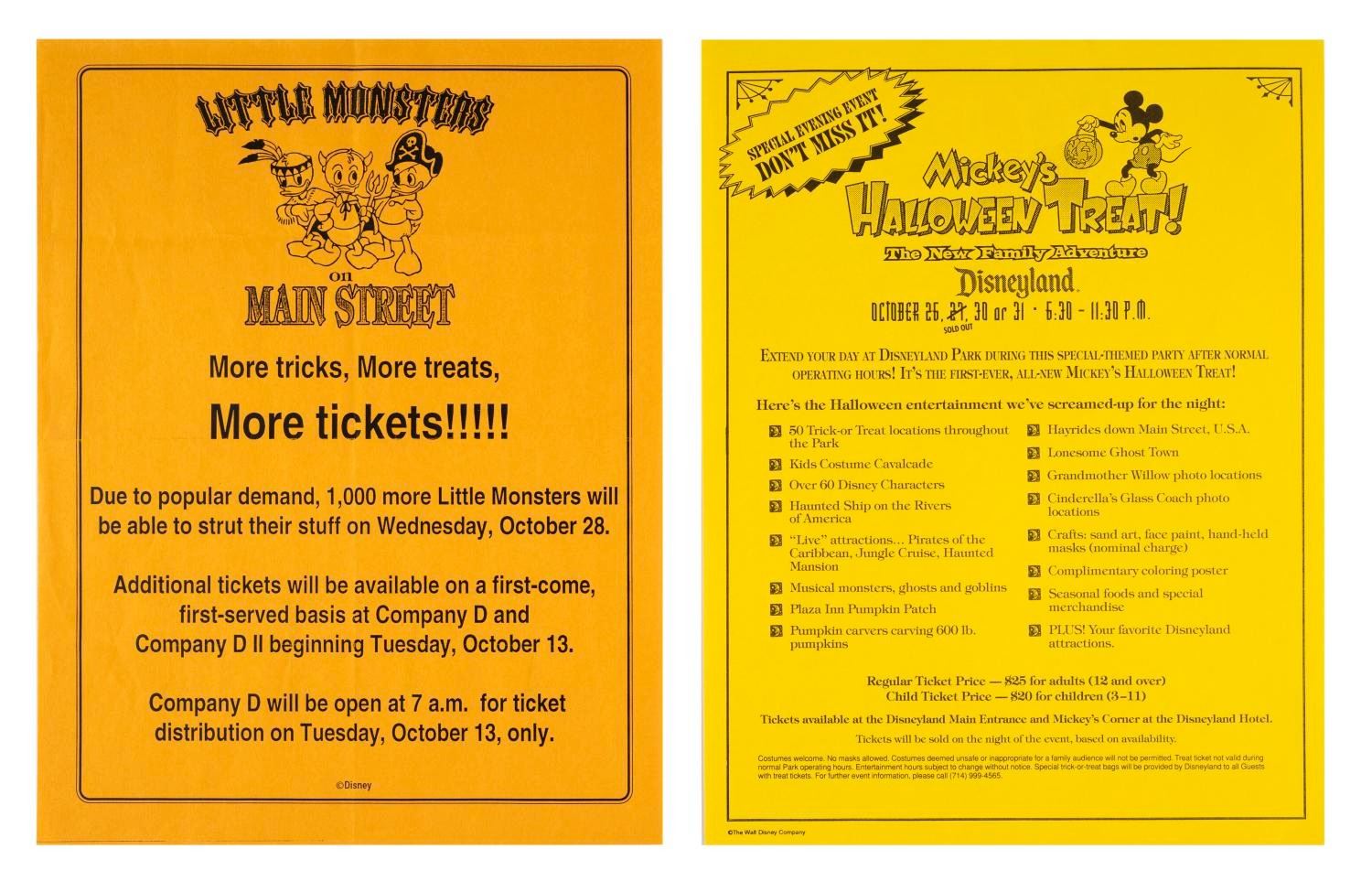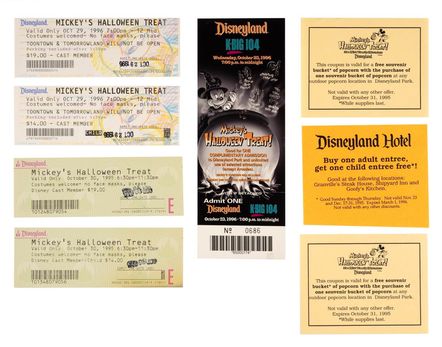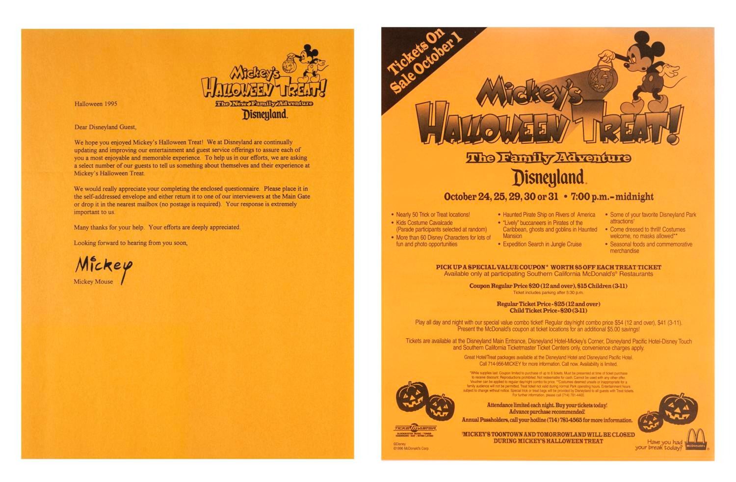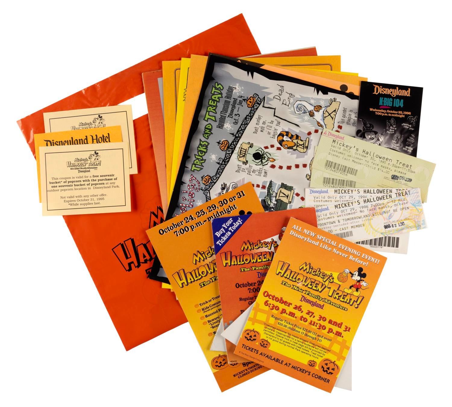 (Disneyland, 1995-2000s) A collection of memorabilia from Mickey's Halloween Treat events held at Disneyland in 1995 and 1996. Included are promotional fliers, coupons, shopping bags, tickets, counter displays, a dining point menu card, an after-event questionnaire. Also included are two flyers from later Disneyland Halloween events, Little Monsters on Main Street and the Haunted Mansion Holiday. Measuring various sizes, the ephemera is in very good to fine condition.