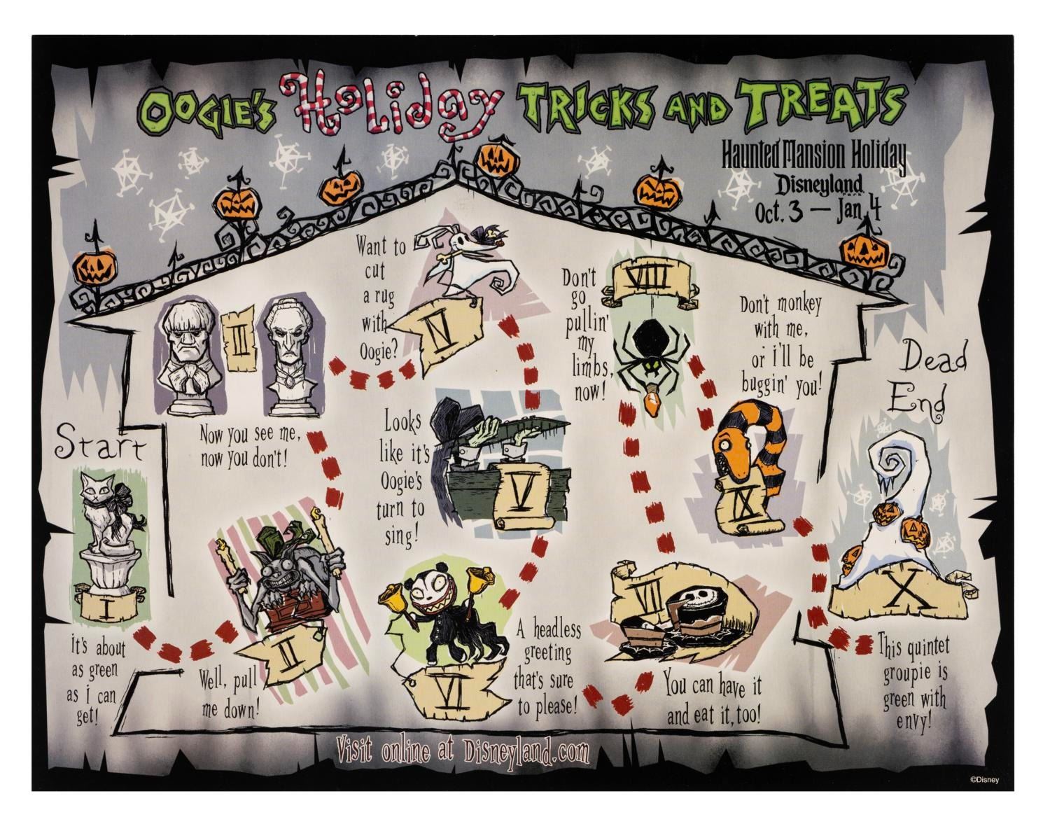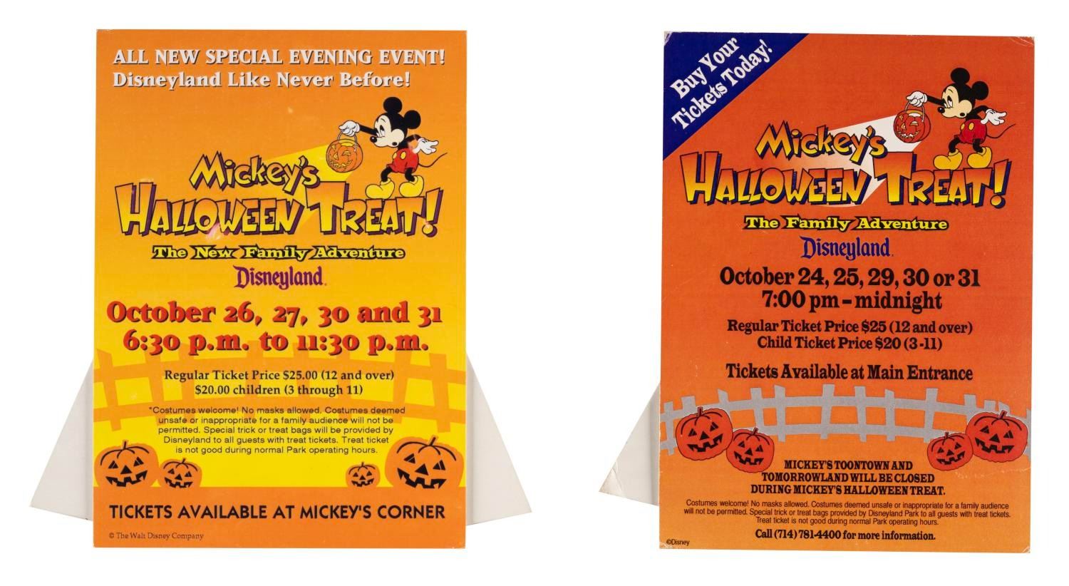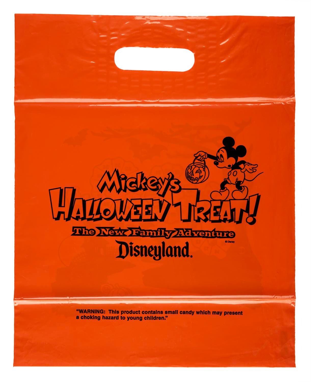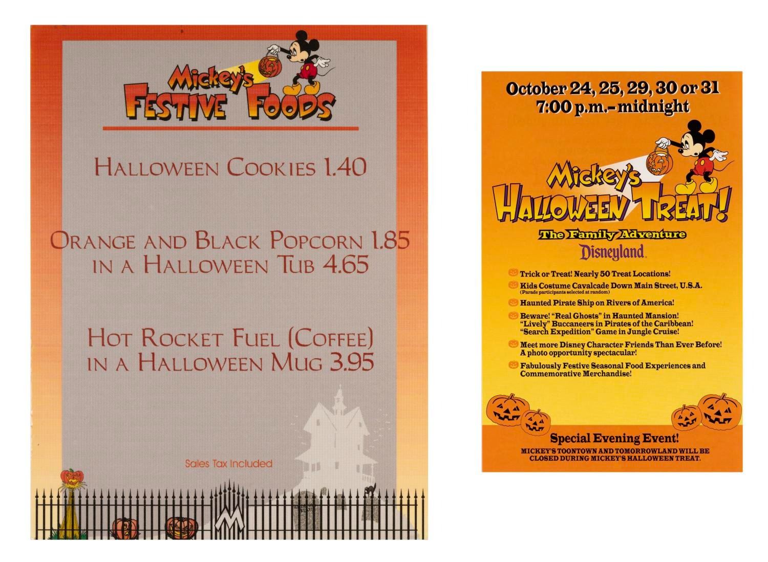 (Disneyland, 1995-2000s) A collection of memorabilia from Mickey's Halloween Treat events held at Disneyland in 1995 and 1996. Included are promotional fliers, coupons, shopping bags, tickets, counter displays, a dining point menu card, an after-event questionnaire. Also included are two flyers from later Disneyland Halloween events, Little Monsters on Main Street and the Haunted Mansion Holiday. Measuring various sizes, the ephemera is in very good to fine condition.