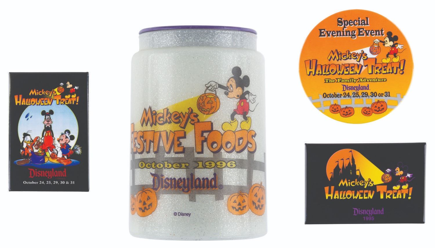 (Disneyland, 1995-96) A collection of souvenirs from the Mickey’s Halloween Treat Special events at Disneyland in 1995 and 1996. Included are three buttons and a Festive Foods thermal mug. The souvenirs are in very good to fine condition.