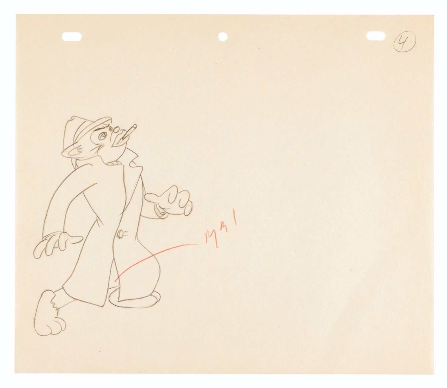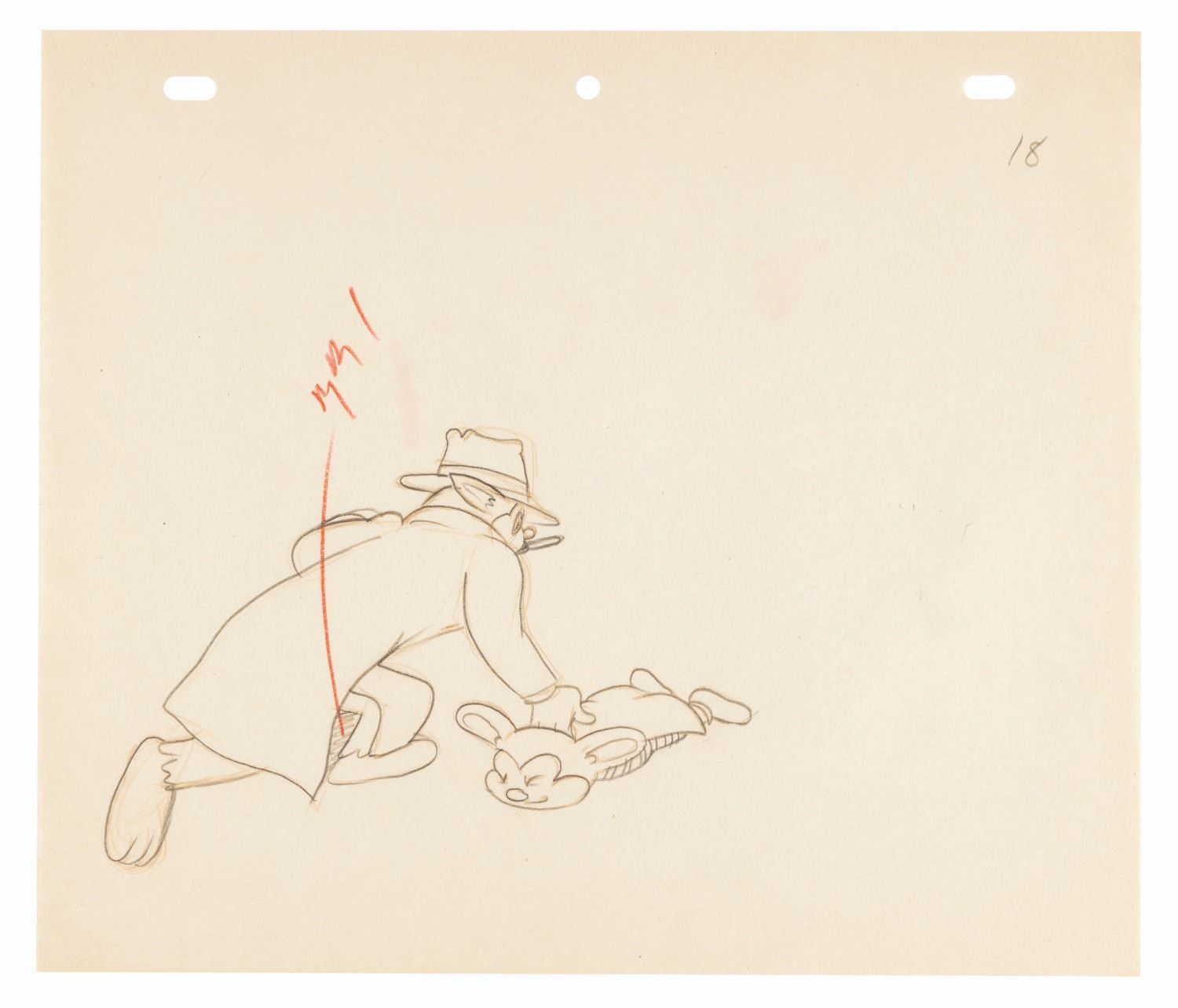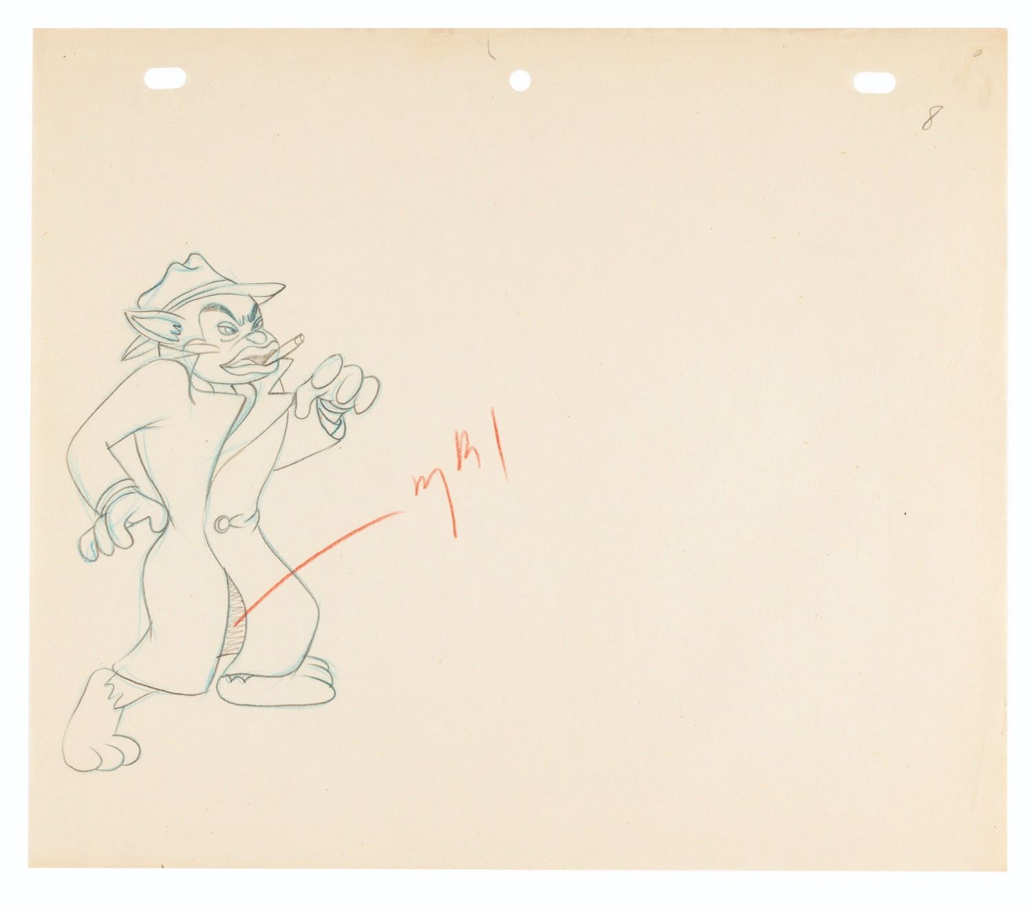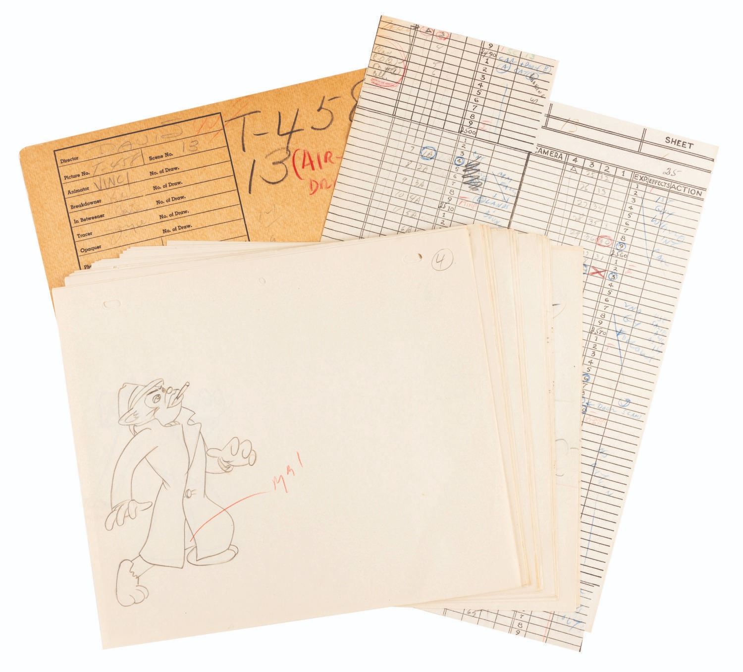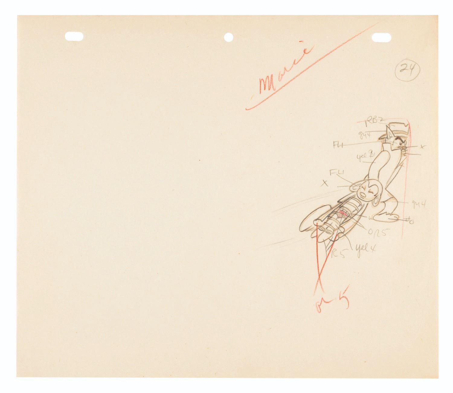 (Terrytoons, 1949) A collection of 22 production drawings by animator Thurlo Collier for the Mighty Mouse short “The Racket Buster,” featuring Pearl Pureheart and a gangster cat. Also included with the collection are the original timing sheets and production folder. Each measuring 9.5” x 11”, the graphite and colored pencil drawings are in very good condition with light discoloration from age and production-related wear. The 10” x 11.5” folder and 13.25” x 9.5” timing sheets are in poor to very good condition with complete separation at the fold of the folder and production-related wear to the timing sheets. Terrytoons was a prolific animation studio known for producing theatrical shorts, including popular series such as Heckle and Jeckle, Gandy Goose, and, most famously, Mighty Mouse. Originally conceived as a parody of Superman, the Mighty Mouse shorts evolved into a spoof of melodramas featuring a cast of archetypal characters, including the damsel in distress and the sinister mustache-twirling villain. In the 1950s, Terrytoons expanded into television, producing series like Deputy Dawg and Tom Terrific.