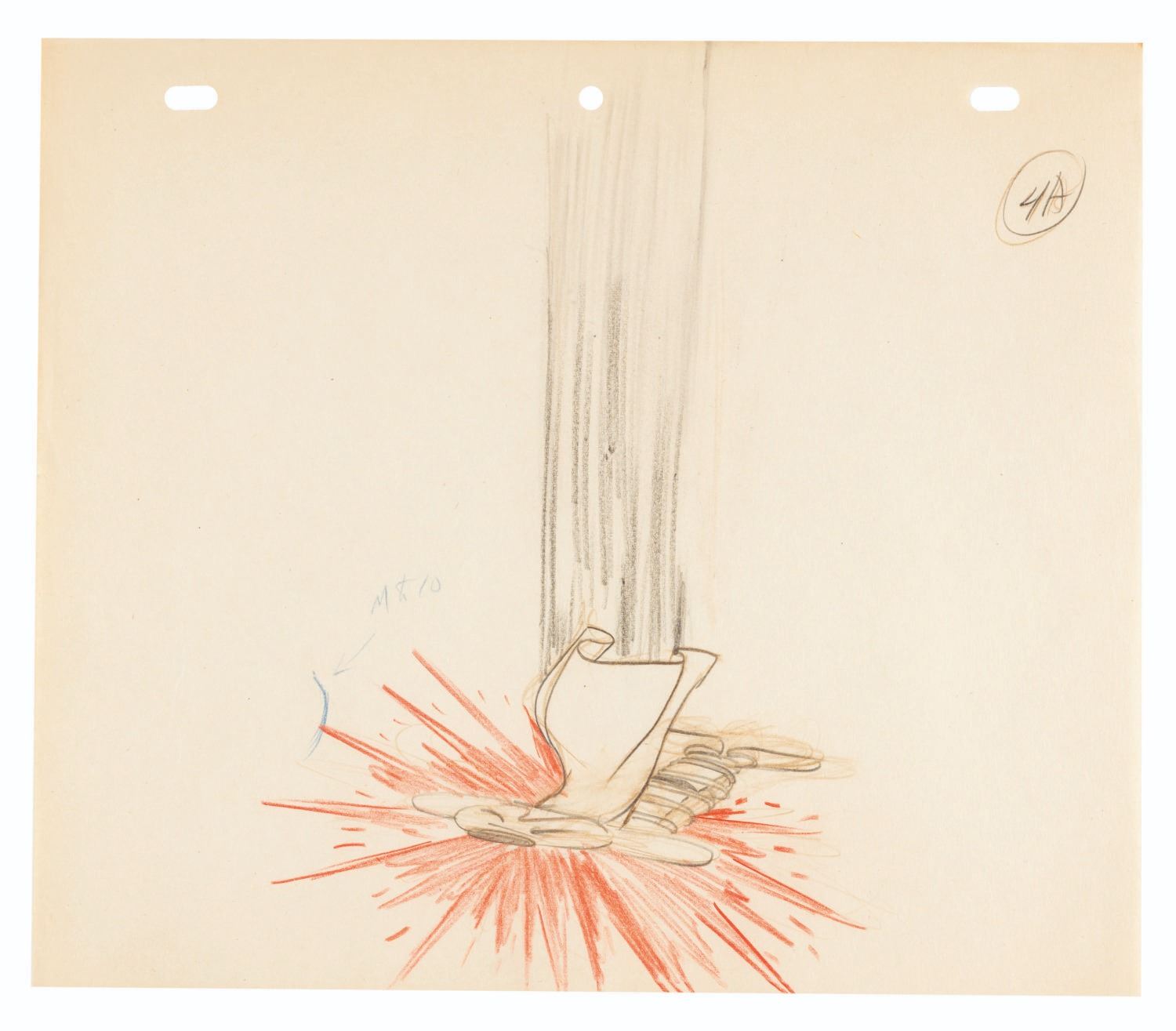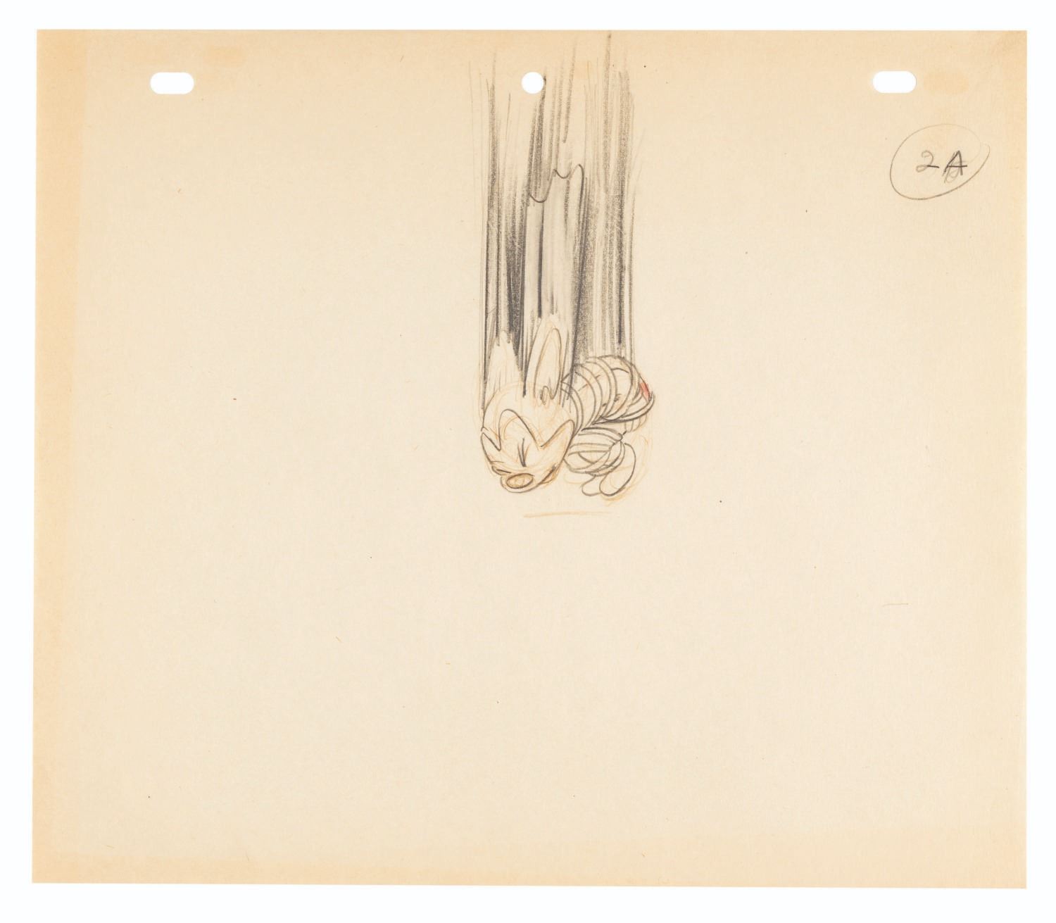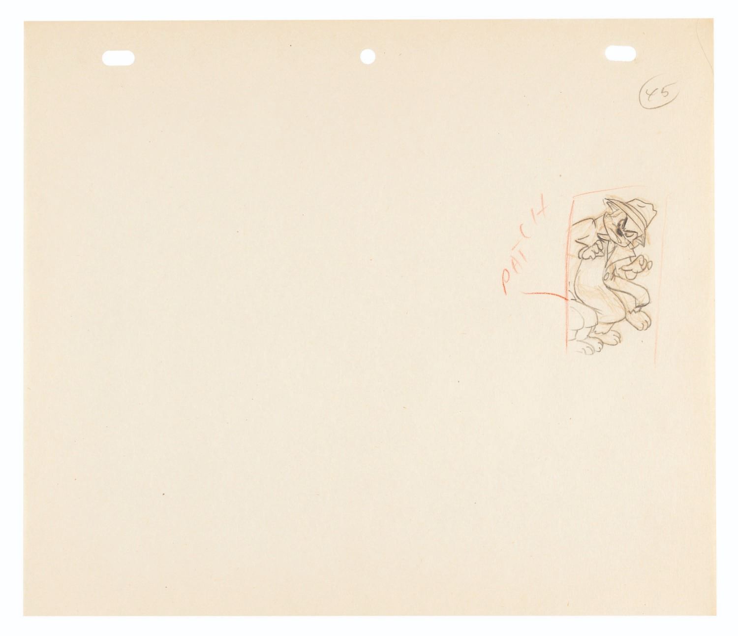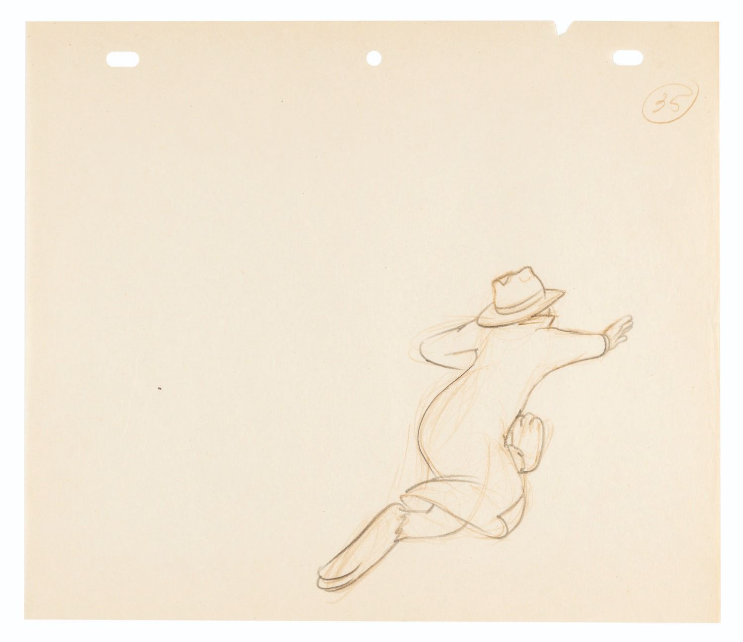 (Terrytoons, 1949) A collection of 22 production drawings by animator Thurlo Collier for the Mighty Mouse short “The Racket Buster,” featuring Pearl Pureheart and a gangster cat. Also included with the collection are the original timing sheets and production folder. Each measuring 9.5” x 11”, the graphite and colored pencil drawings are in very good condition with light discoloration from age and production-related wear. The 10” x 11.5” folder and 13.25” x 9.5” timing sheets are in poor to very good condition with complete separation at the fold of the folder and production-related wear to the timing sheets. Terrytoons was a prolific animation studio known for producing theatrical shorts, including popular series such as Heckle and Jeckle, Gandy Goose, and, most famously, Mighty Mouse. Originally conceived as a parody of Superman, the Mighty Mouse shorts evolved into a spoof of melodramas featuring a cast of archetypal characters, including the damsel in distress and the sinister mustache-twirling villain. In the 1950s, Terrytoons expanded into television, producing series like Deputy Dawg and Tom Terrific.