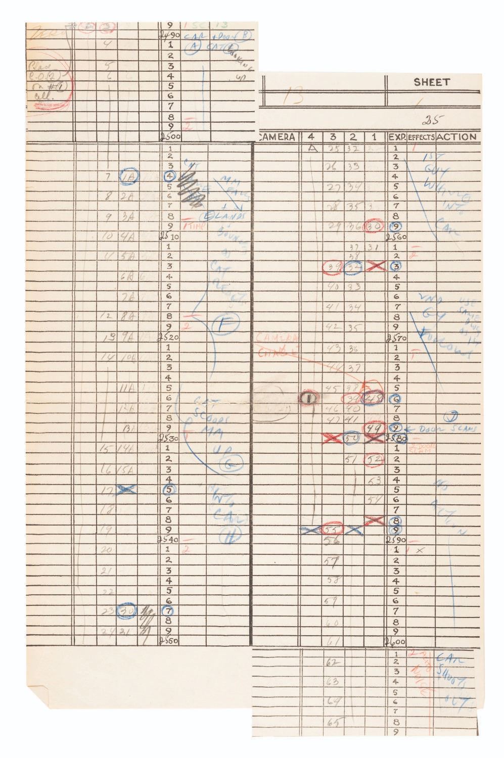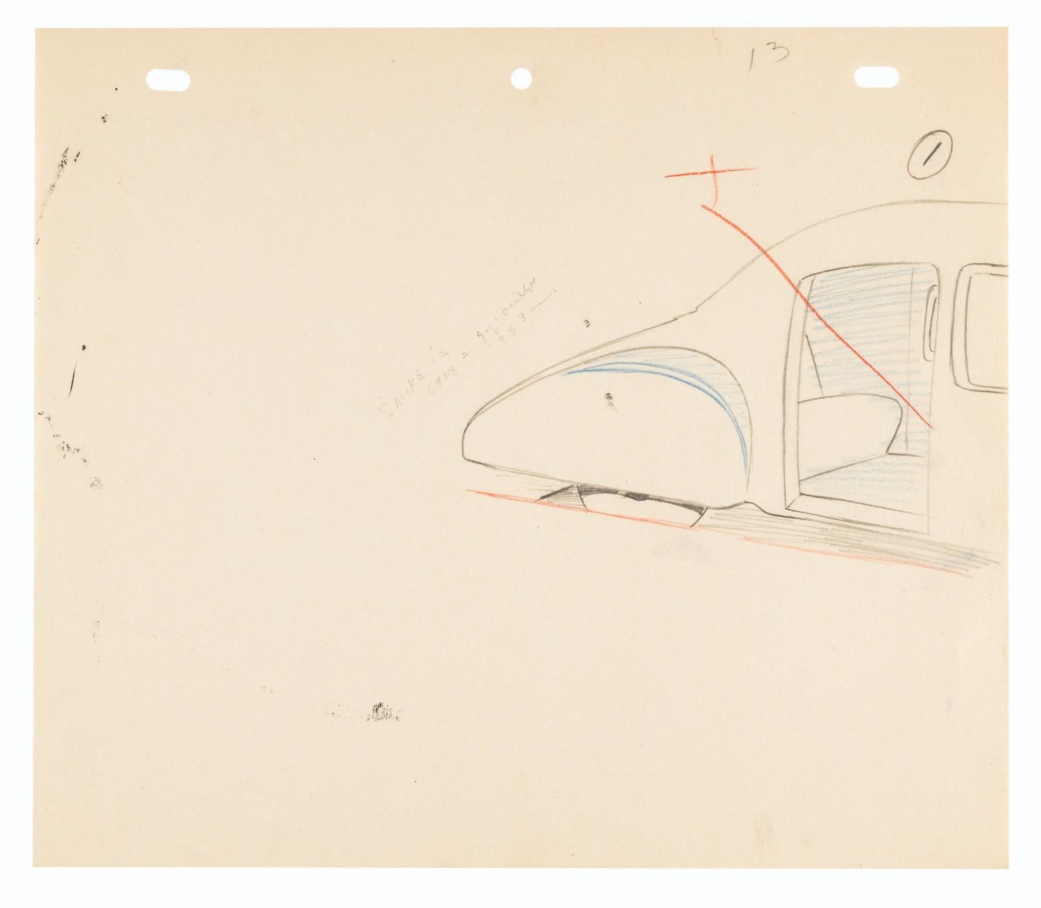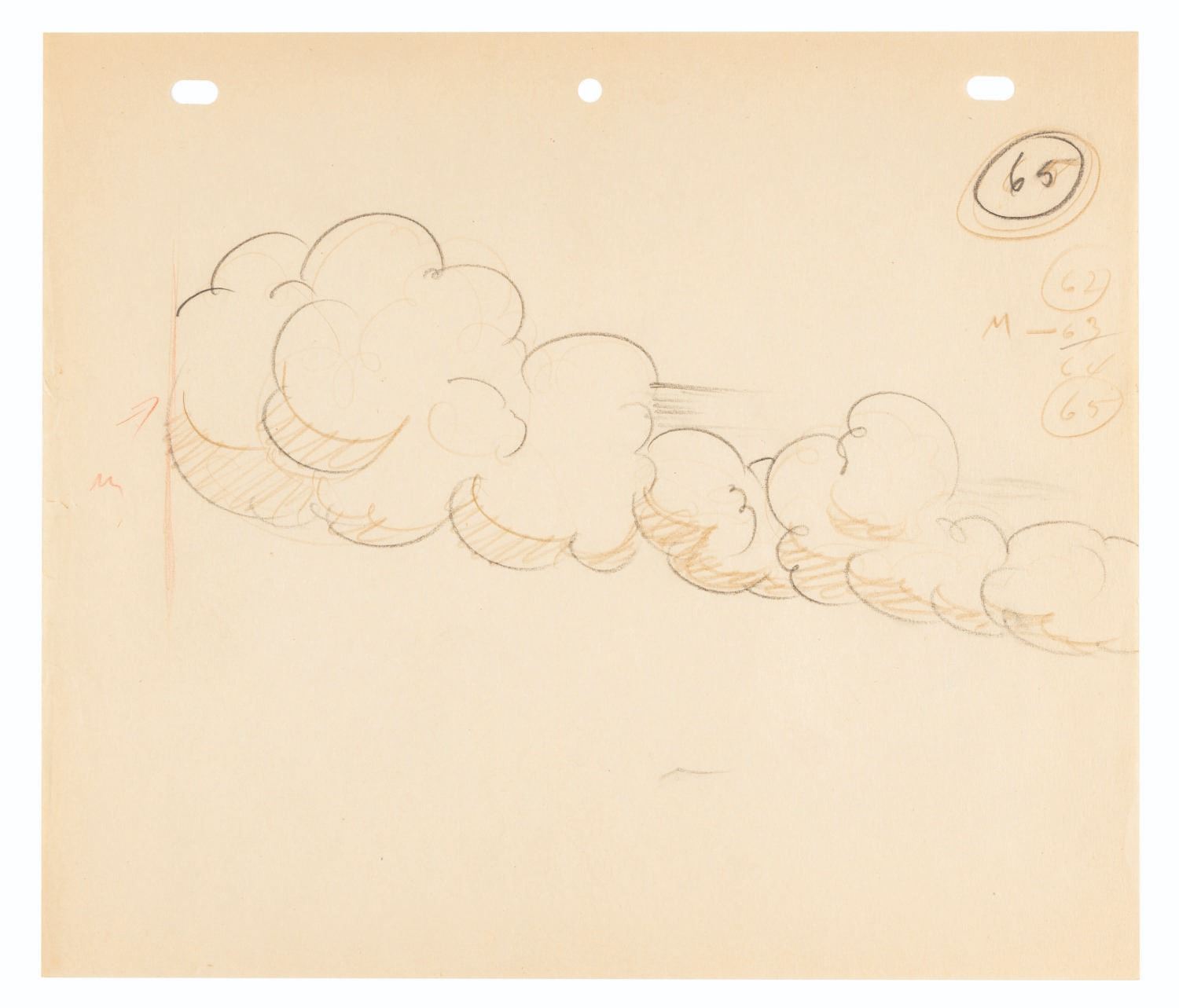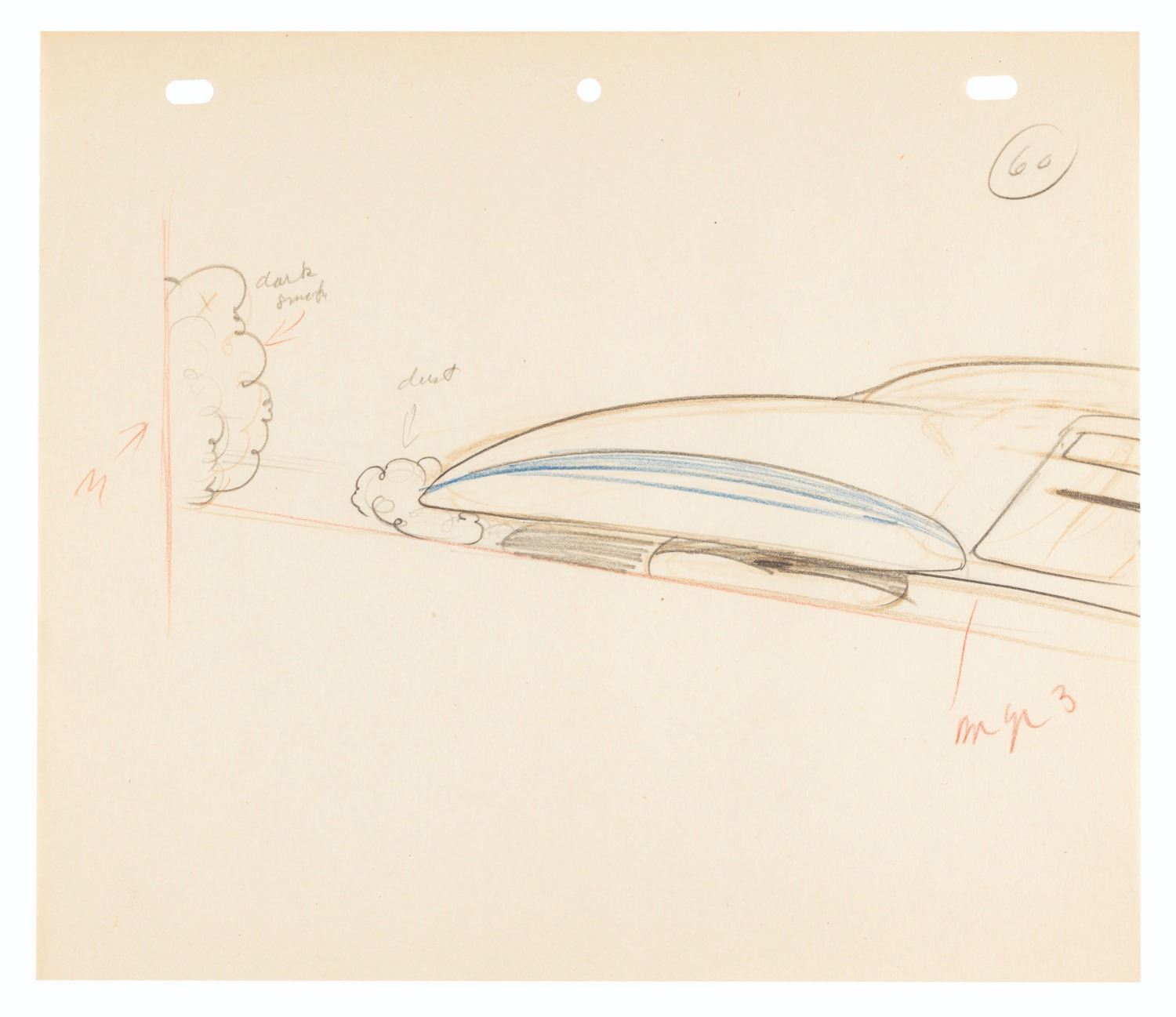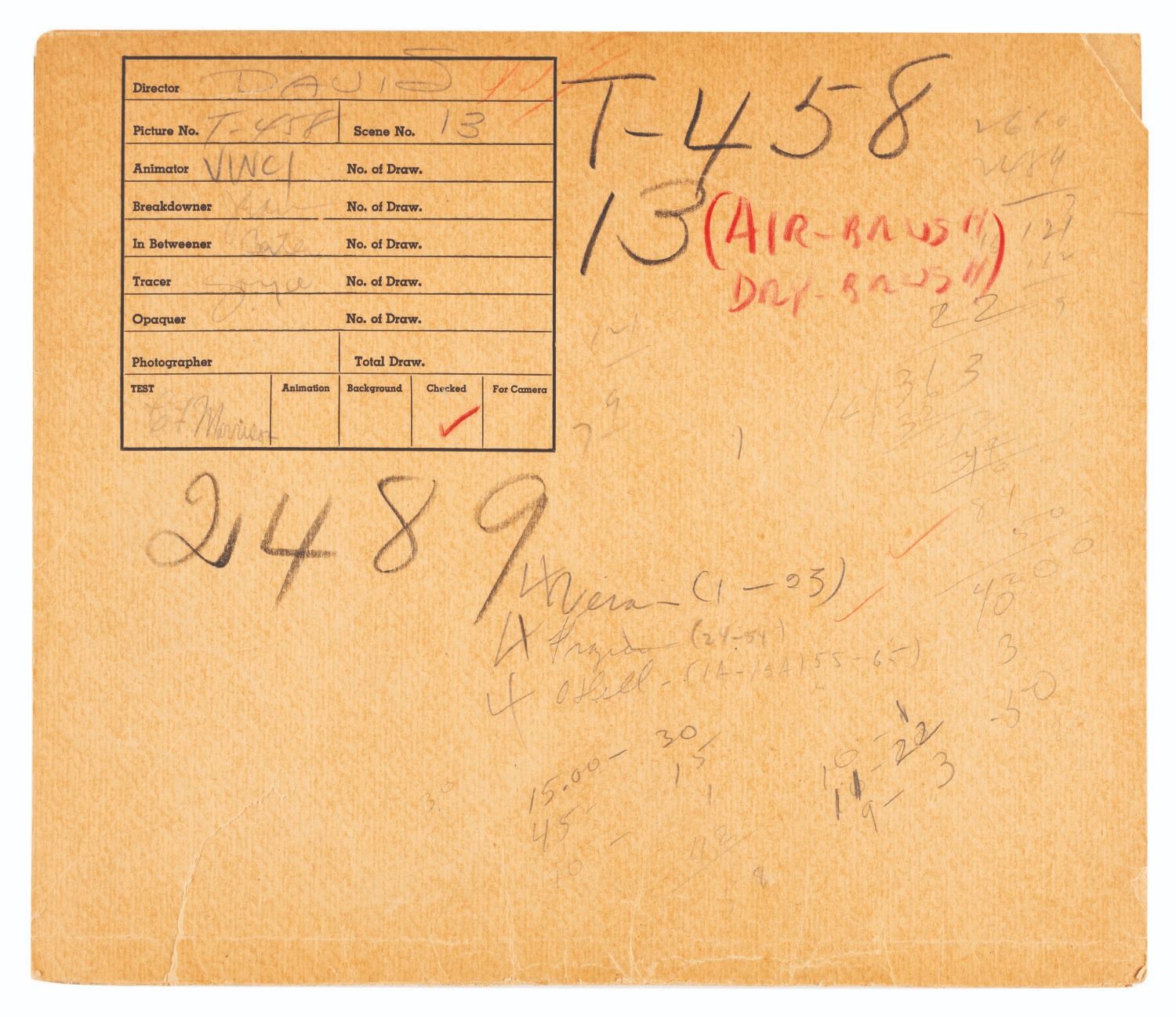 (Terrytoons, 1949) A collection of 22 production drawings by animator Thurlo Collier for the Mighty Mouse short “The Racket Buster,” featuring Pearl Pureheart and a gangster cat. Also included with the collection are the original timing sheets and production folder. Each measuring 9.5” x 11”, the graphite and colored pencil drawings are in very good condition with light discoloration from age and production-related wear. The 10” x 11.5” folder and 13.25” x 9.5” timing sheets are in poor to very good condition with complete separation at the fold of the folder and production-related wear to the timing sheets. Terrytoons was a prolific animation studio known for producing theatrical shorts, including popular series such as Heckle and Jeckle, Gandy Goose, and, most famously, Mighty Mouse. Originally conceived as a parody of Superman, the Mighty Mouse shorts evolved into a spoof of melodramas featuring a cast of archetypal characters, including the damsel in distress and the sinister mustache-twirling villain. In the 1950s, Terrytoons expanded into television, producing series like Deputy Dawg and Tom Terrific.