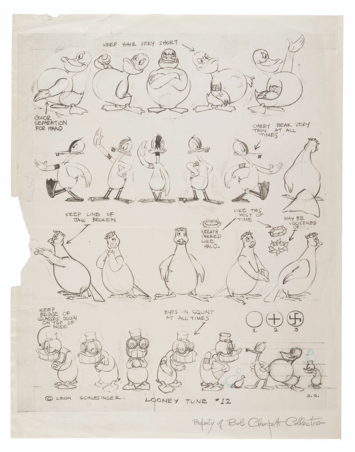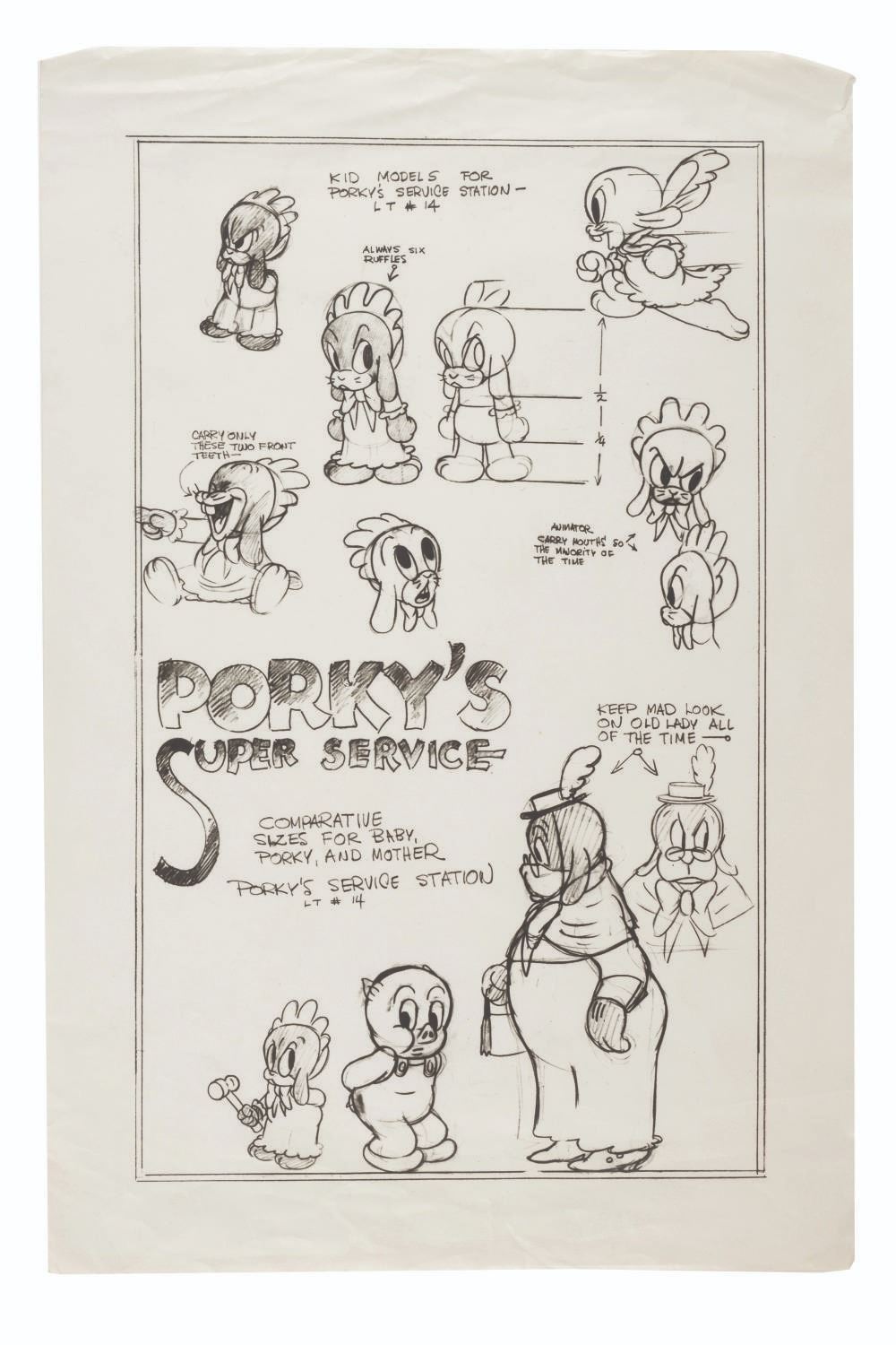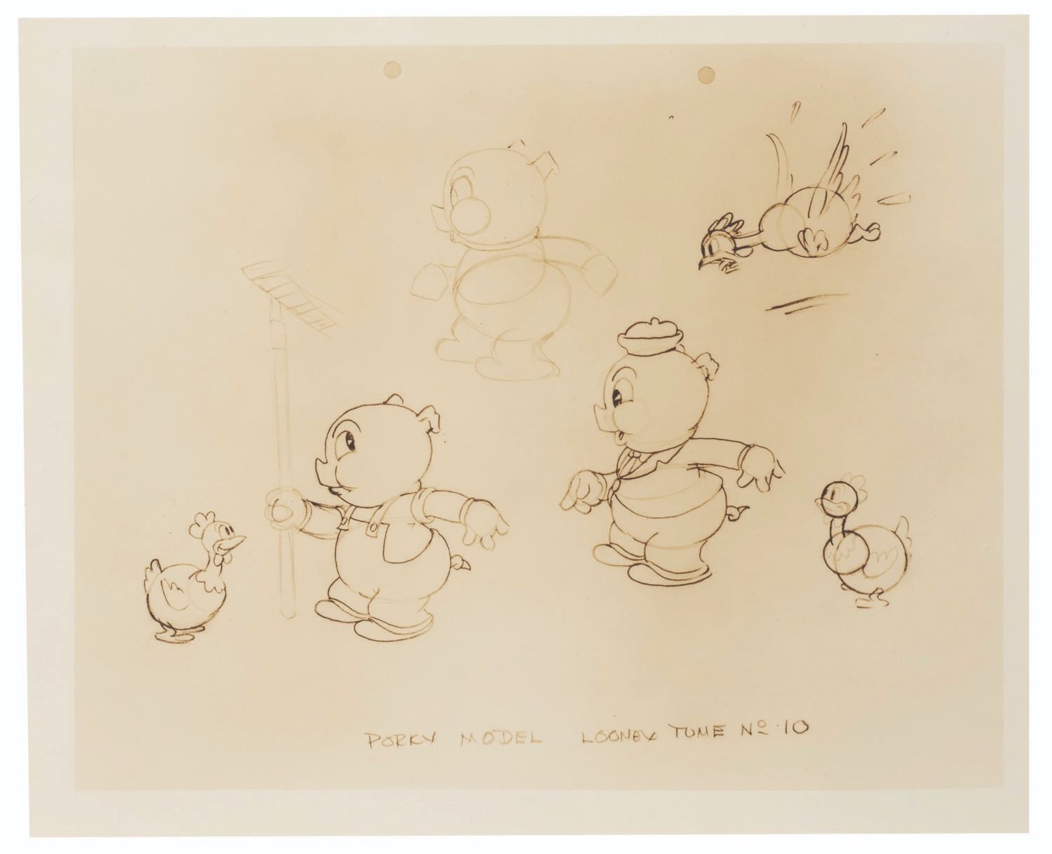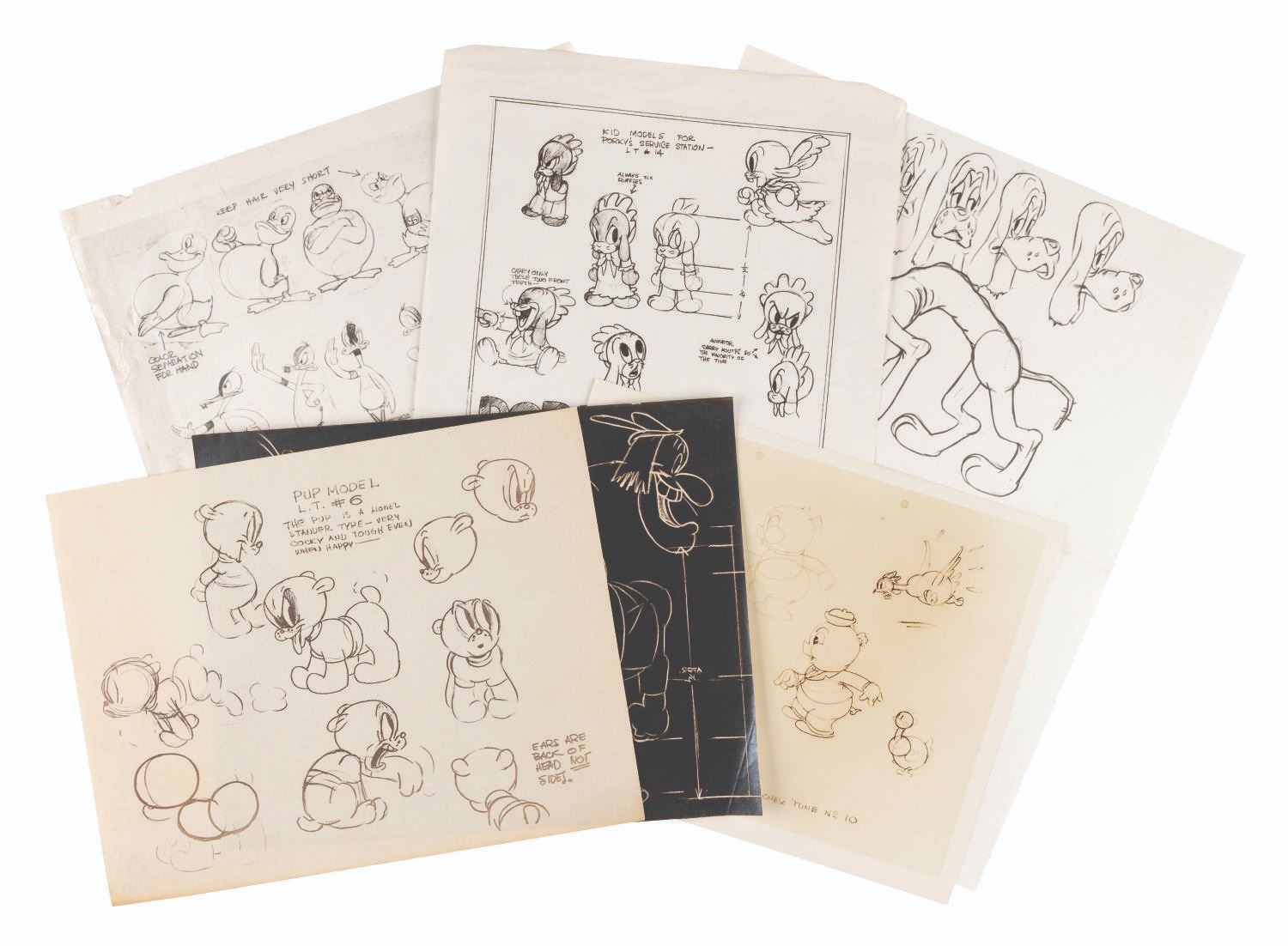 (Schlesinger, 1930s-40s) Six model sheets from Looney Tunes and Merrie Melodies cartoons. Included in photostat form are two from “Rover’s Rival,” one from “Porky’s Super Service,” one in negative from “Injun Trouble,” and one from “The Ducktators.” The last model sheet is in photo print form of Porky Pig dressed as a farmer and sailor from an unknown production. The “Ducktators” sheet has adjustments to the character size comparison models in blue pencil, and is labeled “Property of Bob Clampett Collection” in pencil by Clampett himself, effectively adding his signature. Measuring from 8” x 10” to 11” x 14”, the model sheets are overall in very good condition with wear typical of production use and age, and the “Ducktators” sheet is in good condition with a 0.75” x 3” piece torn from the left side that does not affect the image.