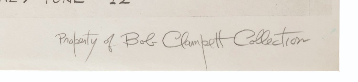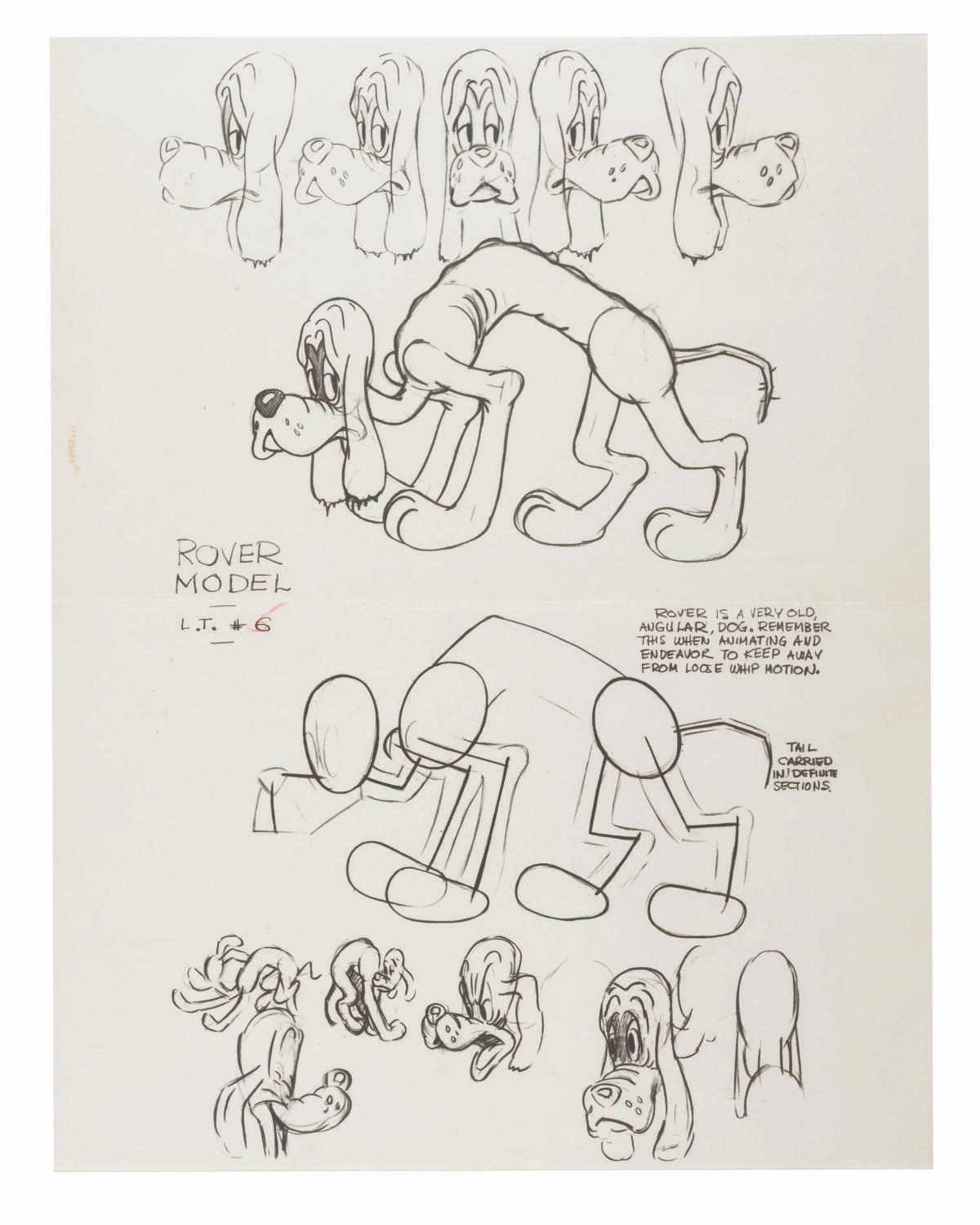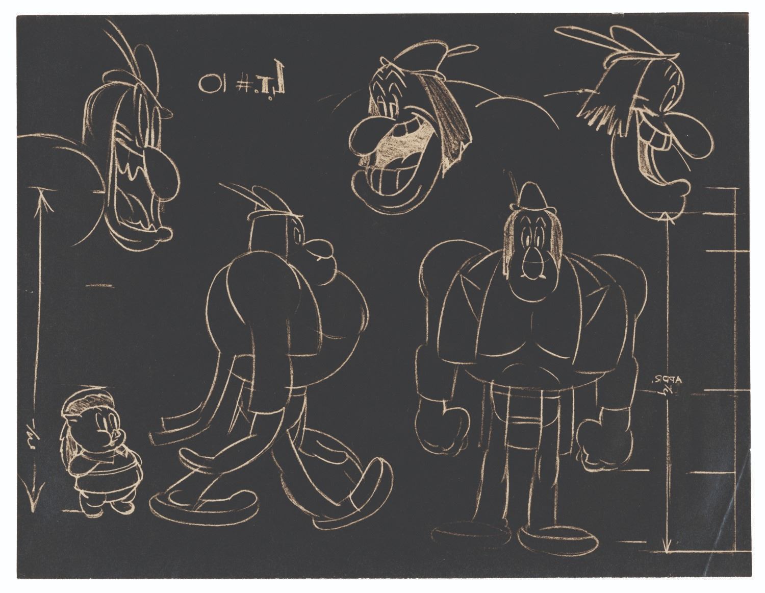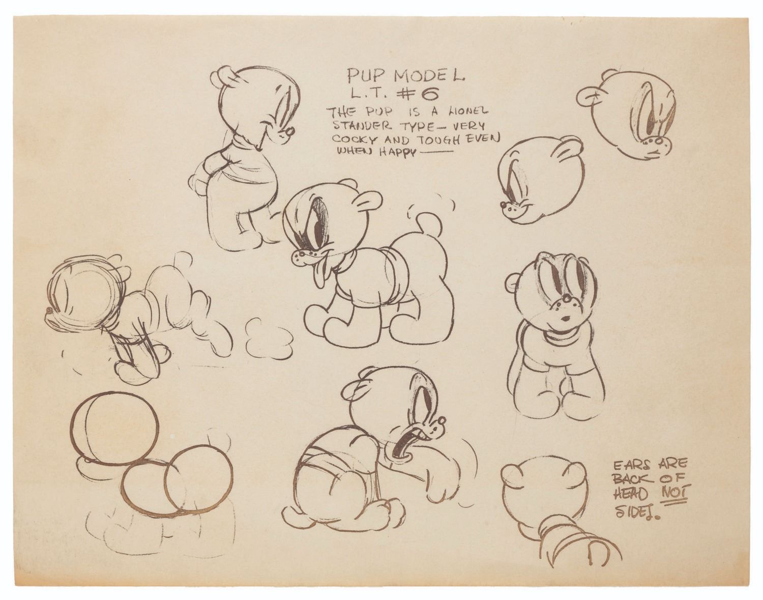 (Schlesinger, 1930s-40s) Six model sheets from Looney Tunes and Merrie Melodies cartoons. Included in photostat form are two from “Rover’s Rival,” one from “Porky’s Super Service,” one in negative from “Injun Trouble,” and one from “The Ducktators.” The last model sheet is in photo print form of Porky Pig dressed as a farmer and sailor from an unknown production. The “Ducktators” sheet has adjustments to the character size comparison models in blue pencil, and is labeled “Property of Bob Clampett Collection” in pencil by Clampett himself, effectively adding his signature. Measuring from 8” x 10” to 11” x 14”, the model sheets are overall in very good condition with wear typical of production use and age, and the “Ducktators” sheet is in good condition with a 0.75” x 3” piece torn from the left side that does not affect the image.