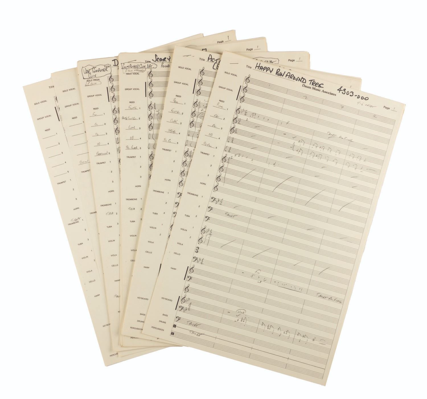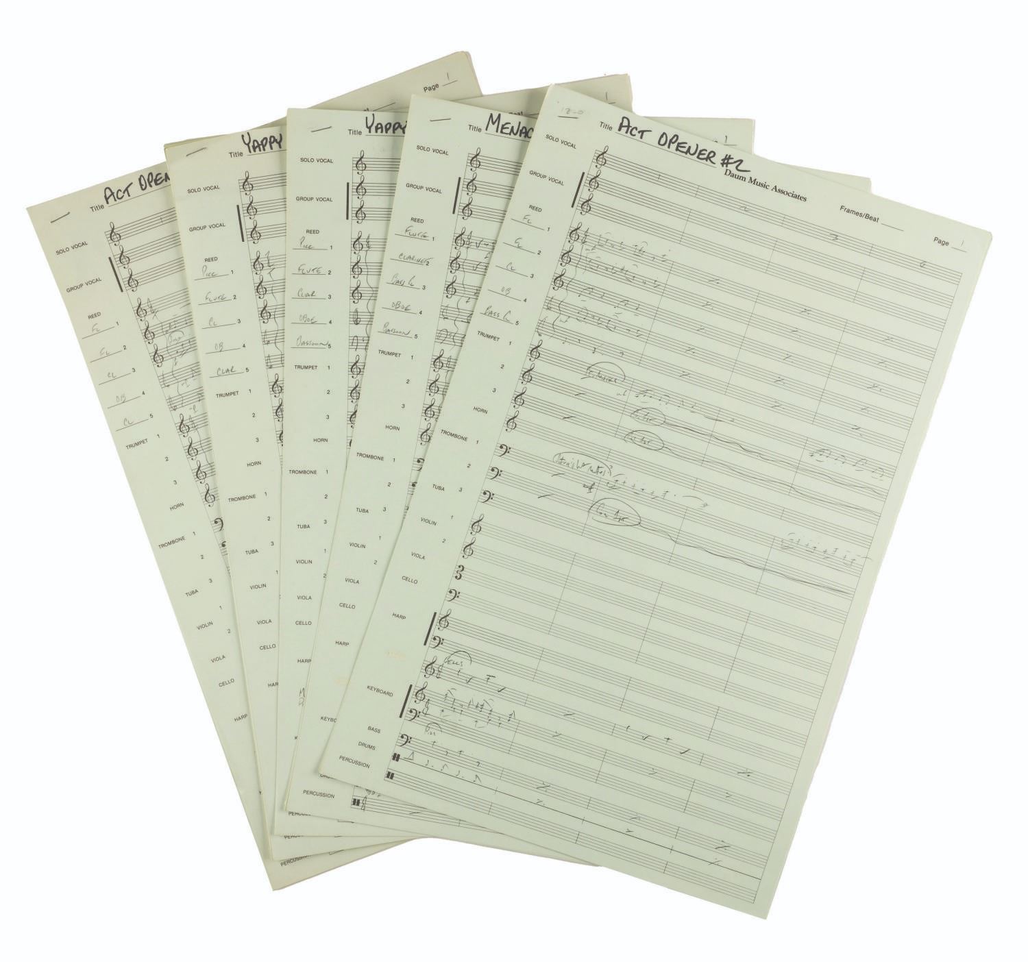(Disney, 1989) An incredible collection of hand-written scores and music for Disney's 1989 TV Series, "Chip 'n Dale; Rescue Rangers." The collection contains over 300 pages of hand-written music by Glen Daum, covering much of the music used during the series. Once part of the Walt Disney Productions Music Library, the scores are in very good condition with edge wear to some pages from storage and use.