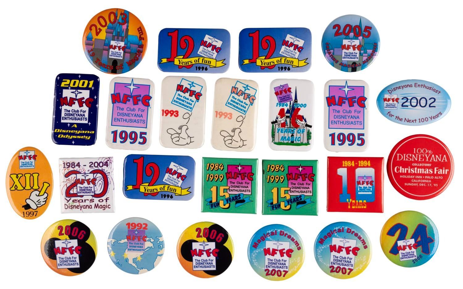 (NFFC/Disneyana, 1992-2007) A collection of twenty-four National Fantasy Fan Club/Disneyana Fan Club pinback buttons. Eighteen of the buttons are unique, and six are duplicates. Measuring from 2" diameter to 2.7" x 1.75", half of the buttons are in very good condition with light scratching and minor oxidation on the back, while the other half is in good condition with more notable wear, scratches, discoloration from age, and light scuffing.