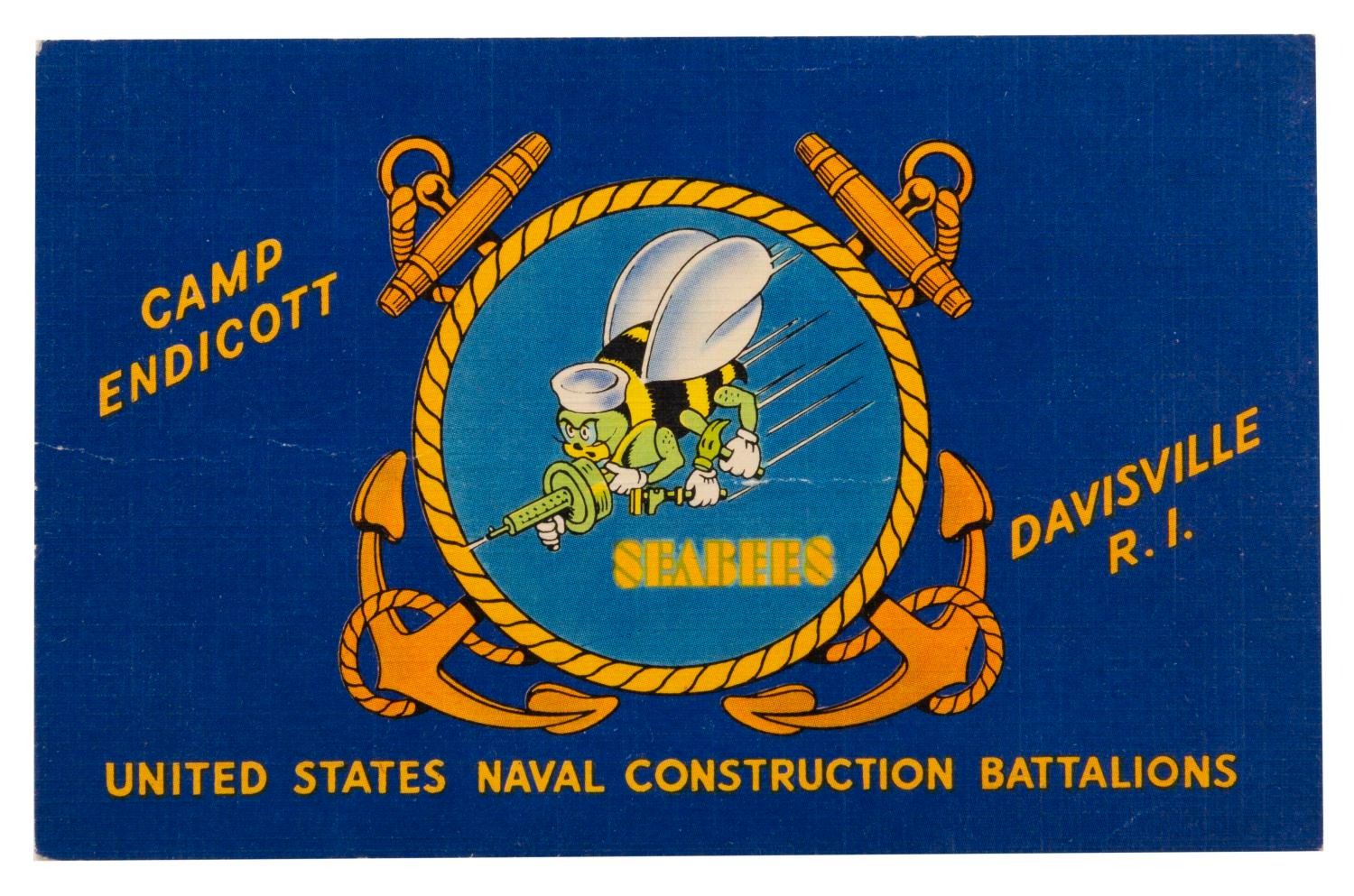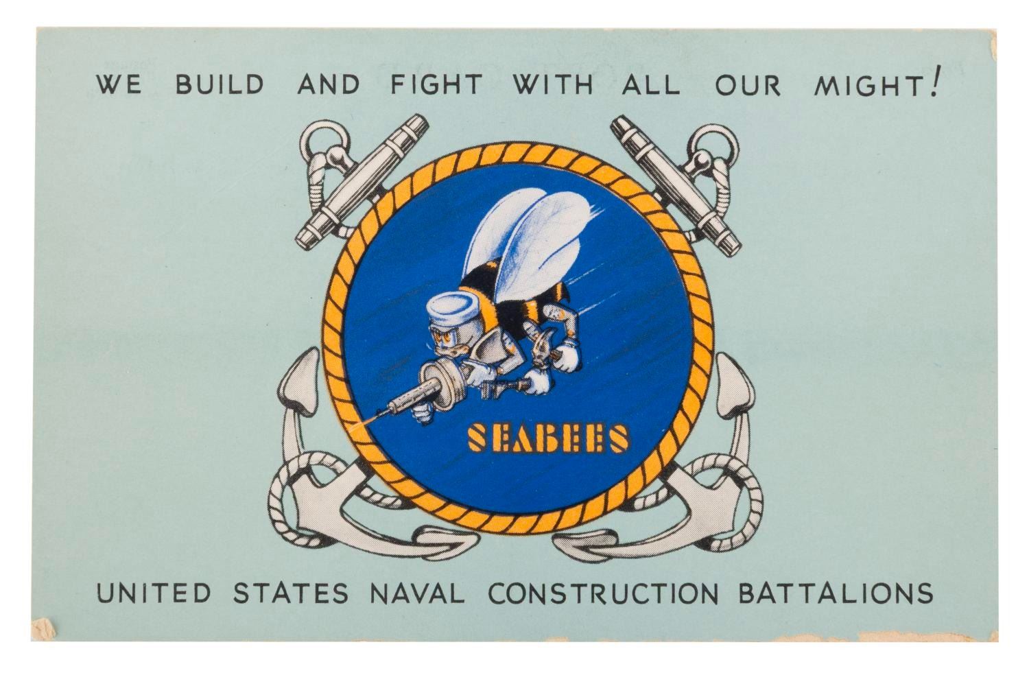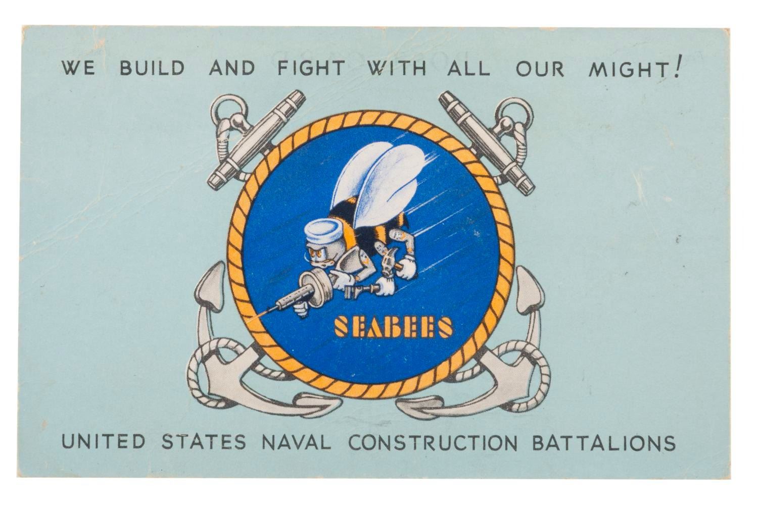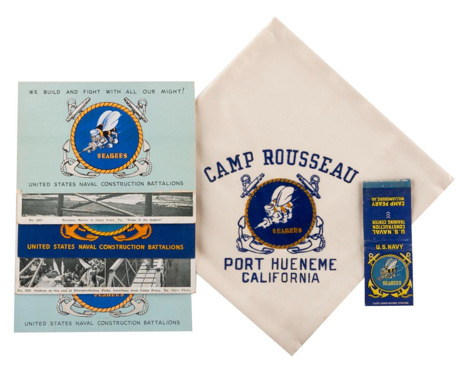 (U.S. Navy, 1942-44) A collection of memorabilia from the U.S. Navy Seabees. The Disney Studio created several insignia for the Seabees during and after World War II. Included are an empty matchbook cover, and a service scarf with insignia for the Seabees at Camp Rousseau, Port Hueneme, California. The scarf is in very good condition with light wear from age. The matchbook is in good used condition with wear mainly to the edges. The postcards are in good to very good condition with three used and the two light blue cards unused. The cards all have wear from handling and age, and two cards have paper residue on the back from scrapbooking.