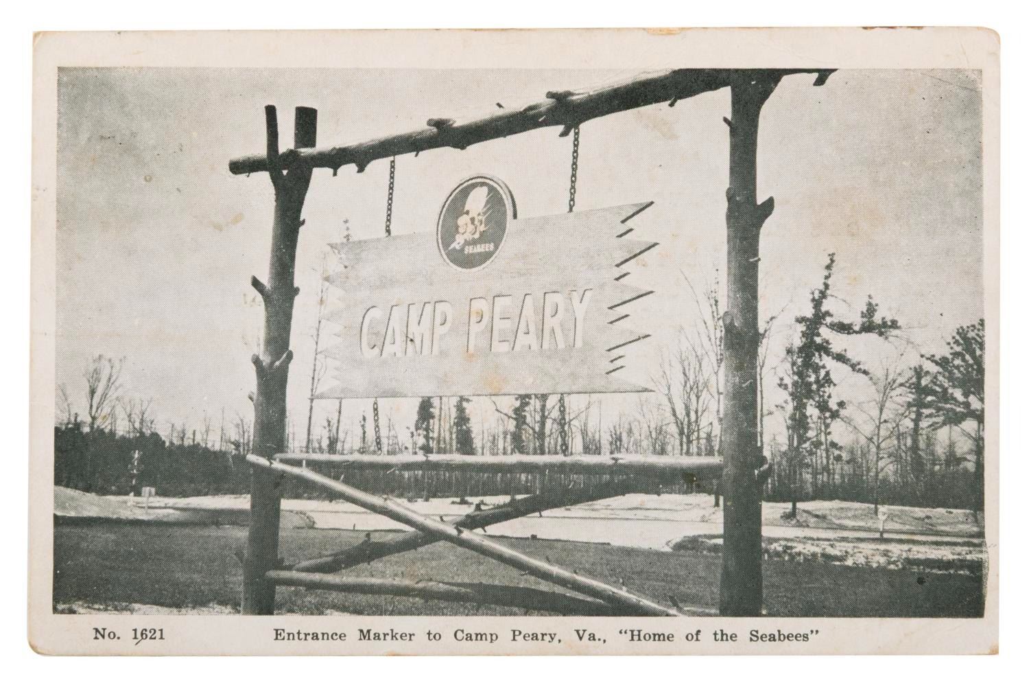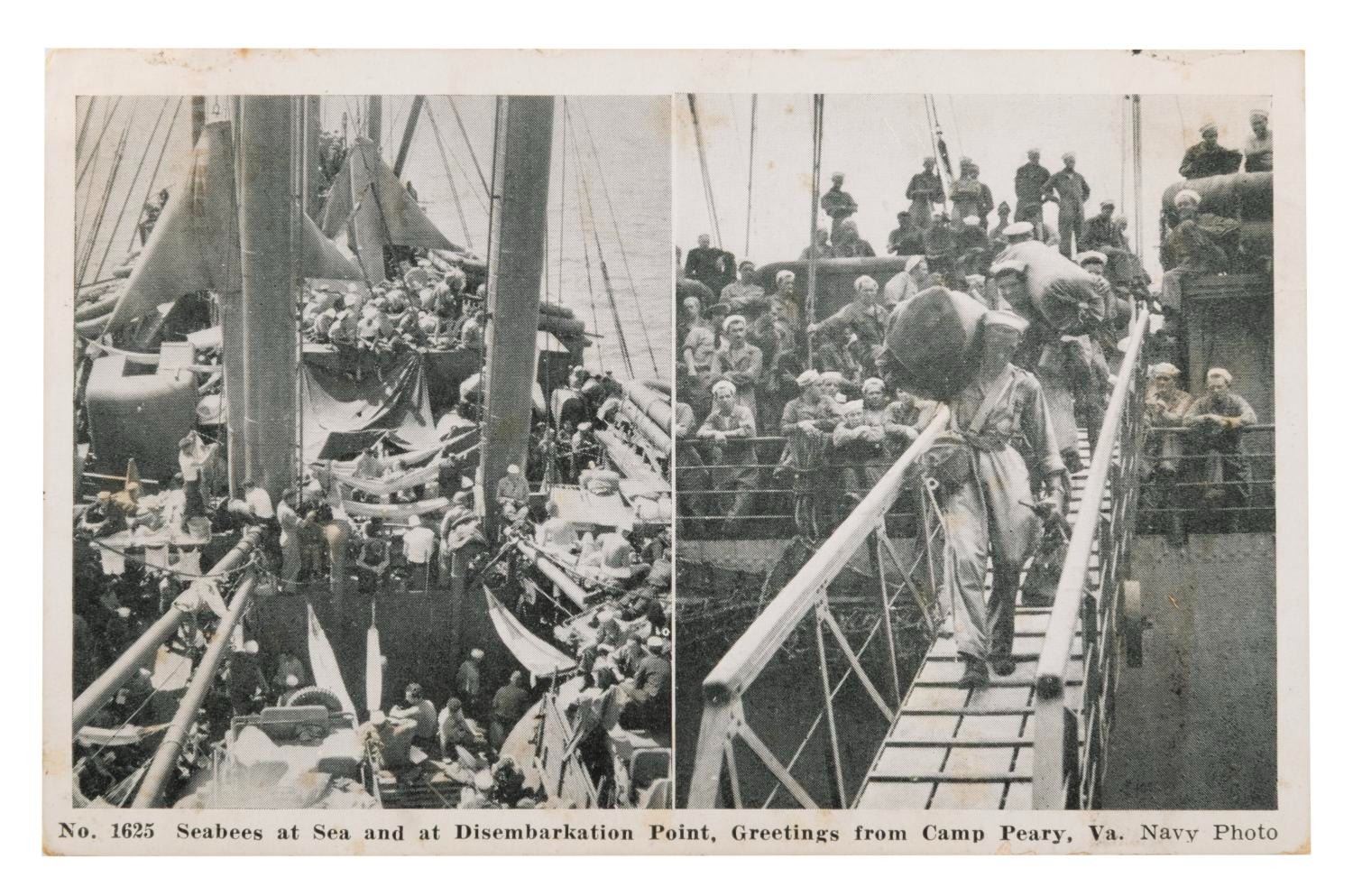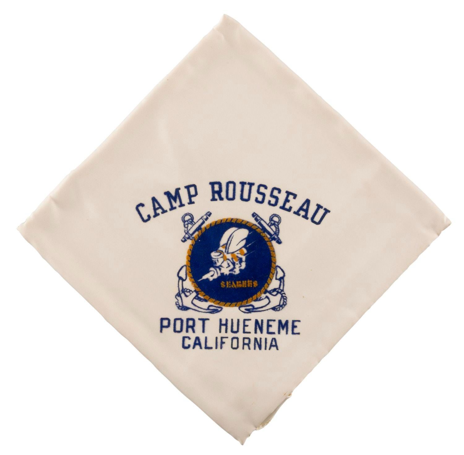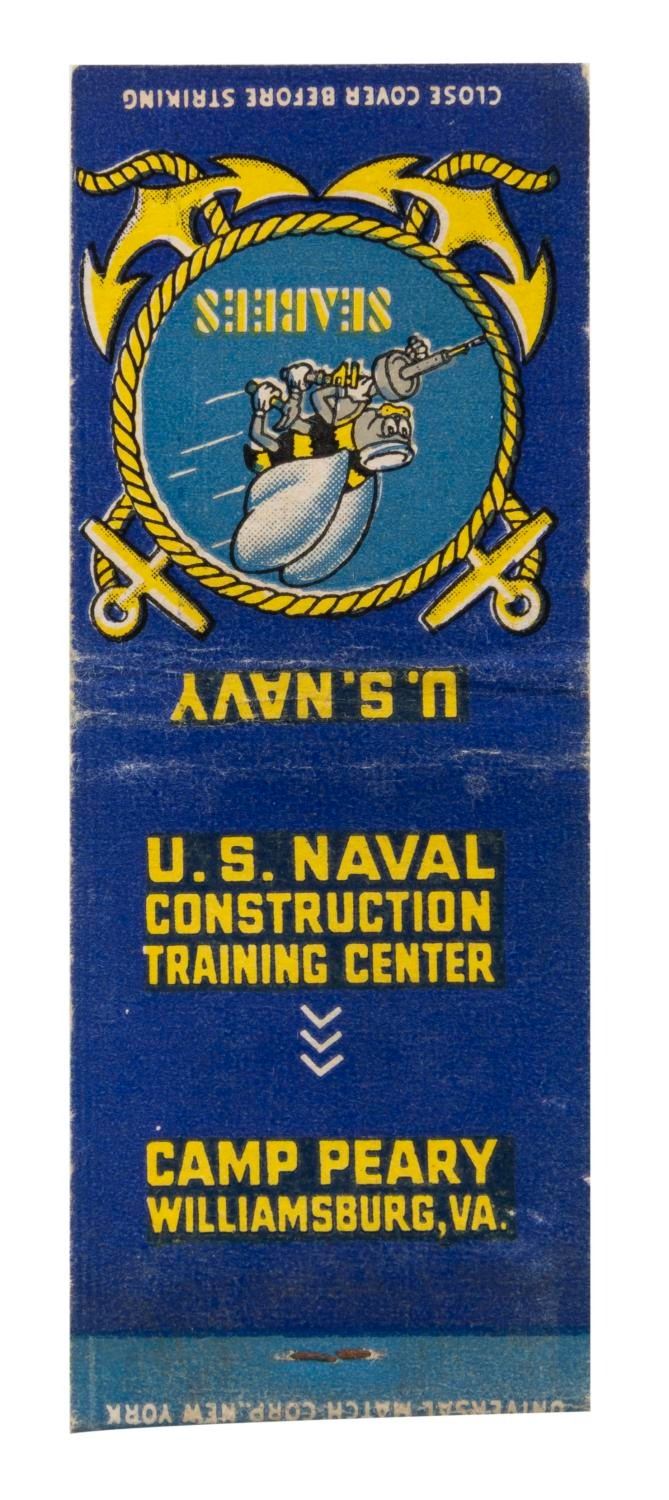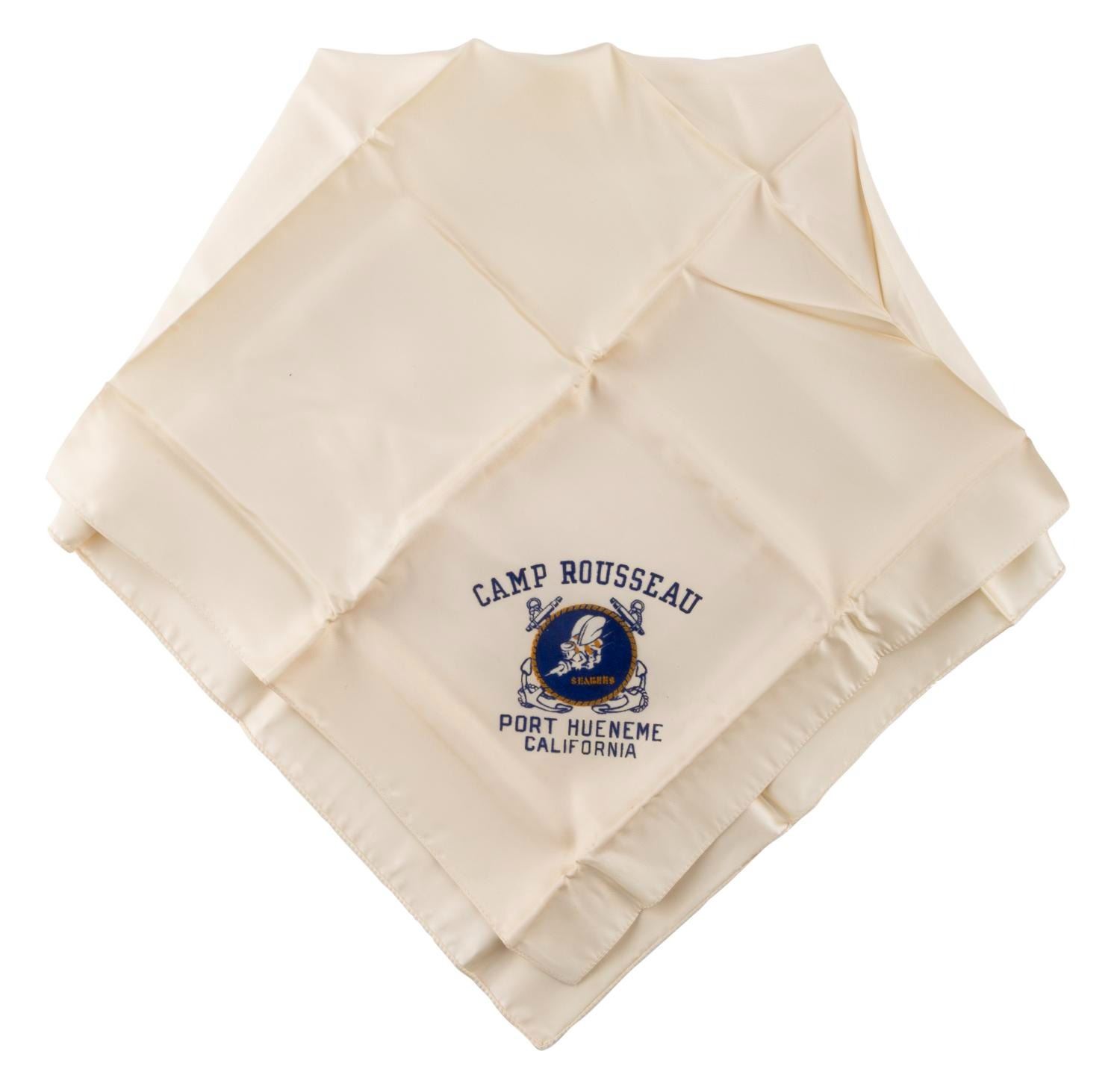 (U.S. Navy, 1942-44) A collection of memorabilia from the U.S. Navy Seabees. The Disney Studio created several insignia for the Seabees during and after World War II. Included are an empty matchbook cover, and a service scarf with insignia for the Seabees at Camp Rousseau, Port Hueneme, California. The scarf is in very good condition with light wear from age. The matchbook is in good used condition with wear mainly to the edges. The postcards are in good to very good condition with three used and the two light blue cards unused. The cards all have wear from handling and age, and two cards have paper residue on the back from scrapbooking.