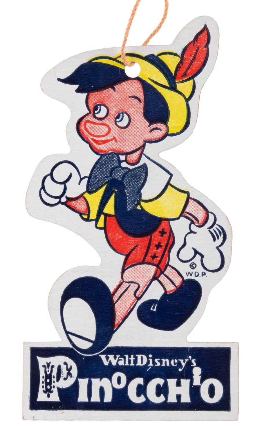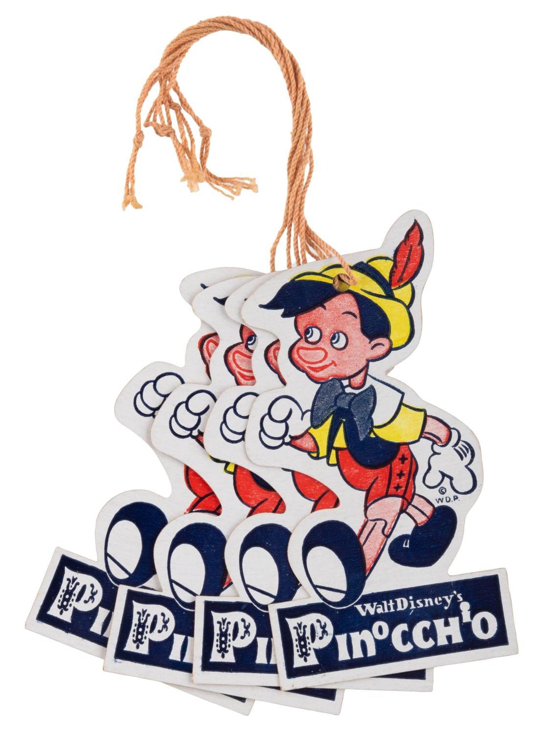 (Disney, 1940s) A collection of four hang tags for Walt Disney’s “Pinocchio.” Measuring 2.25” x 4” each, the tags are in very good condition with light wear.