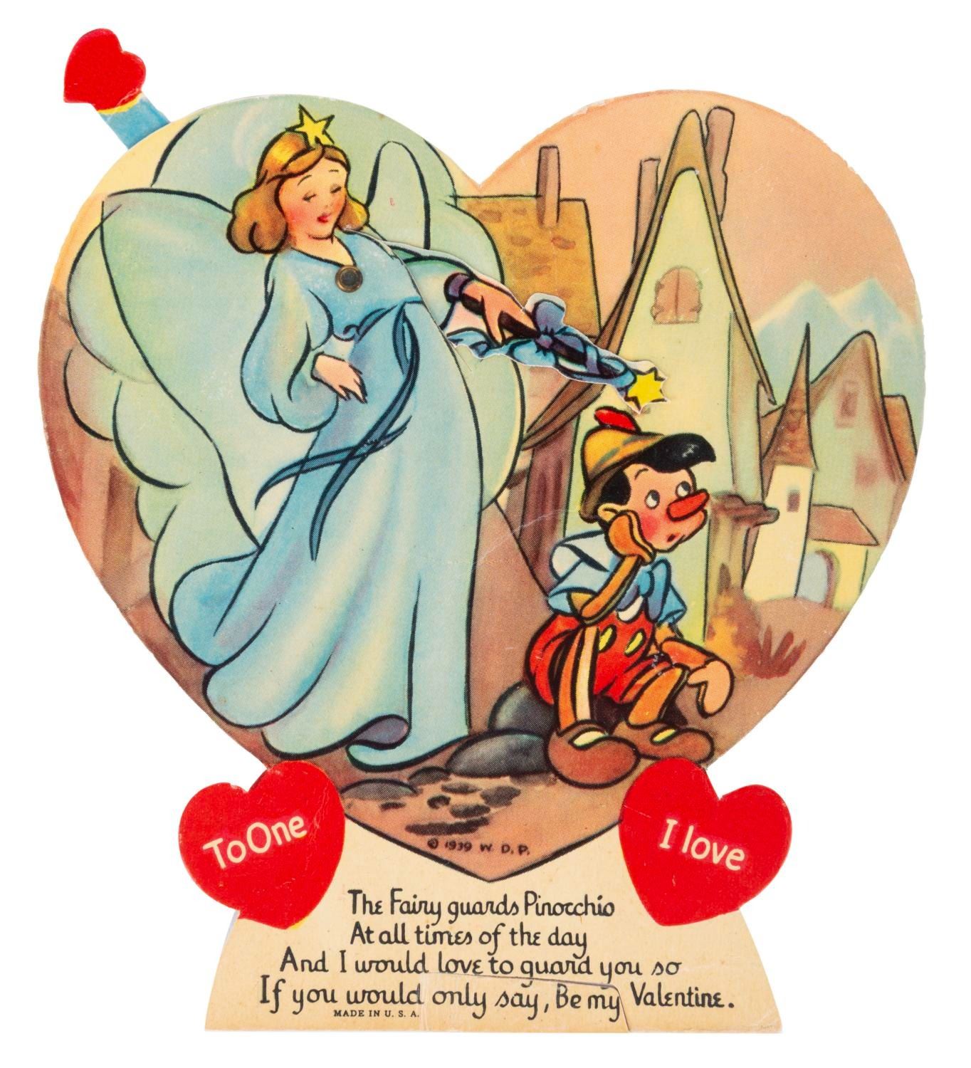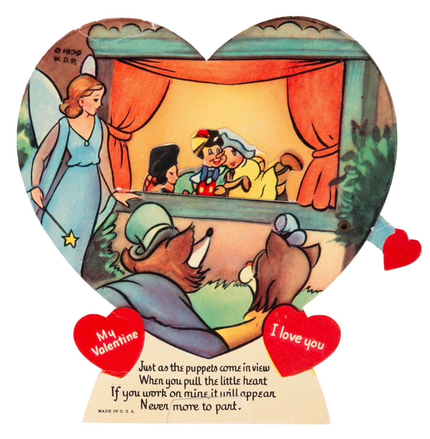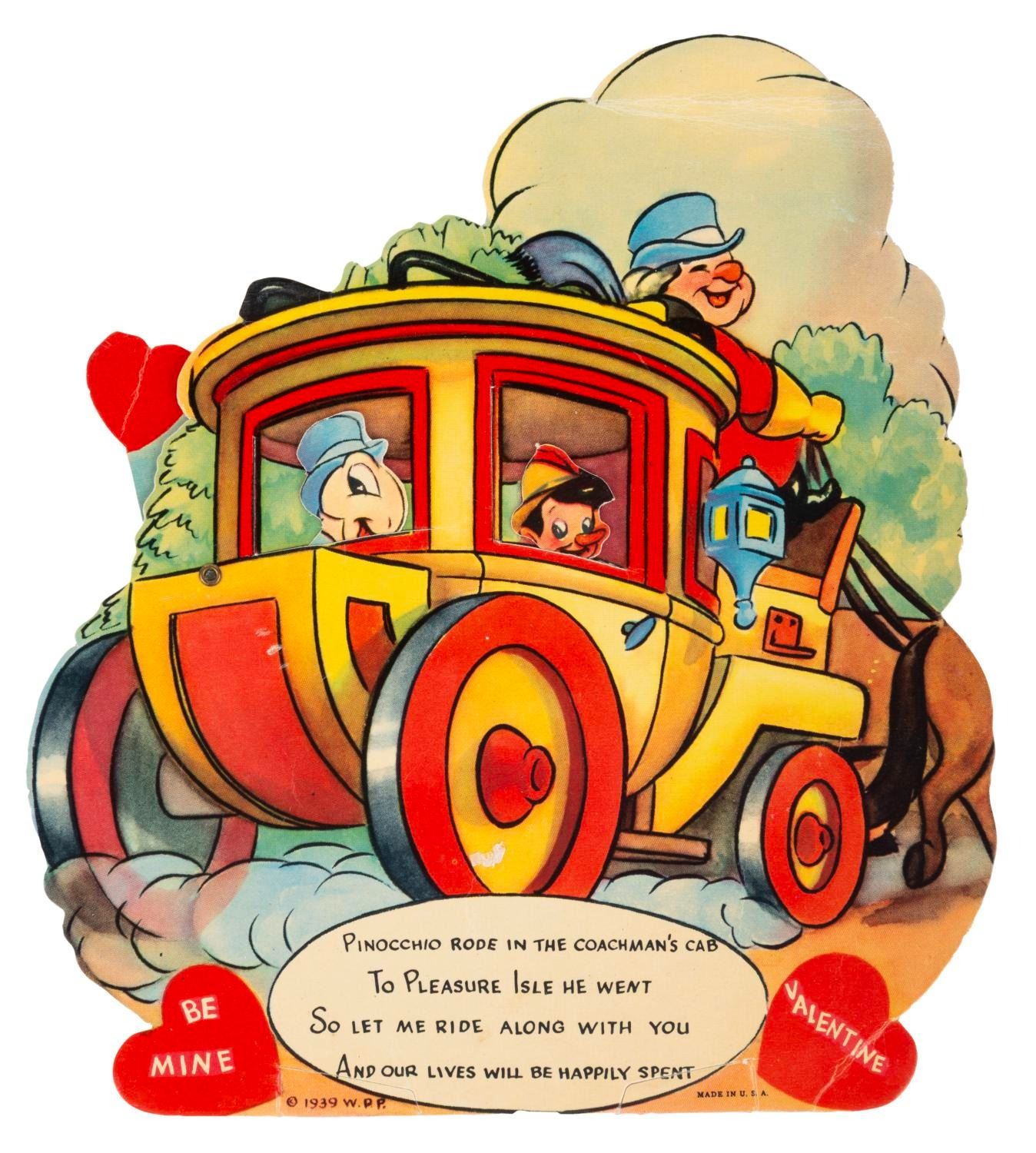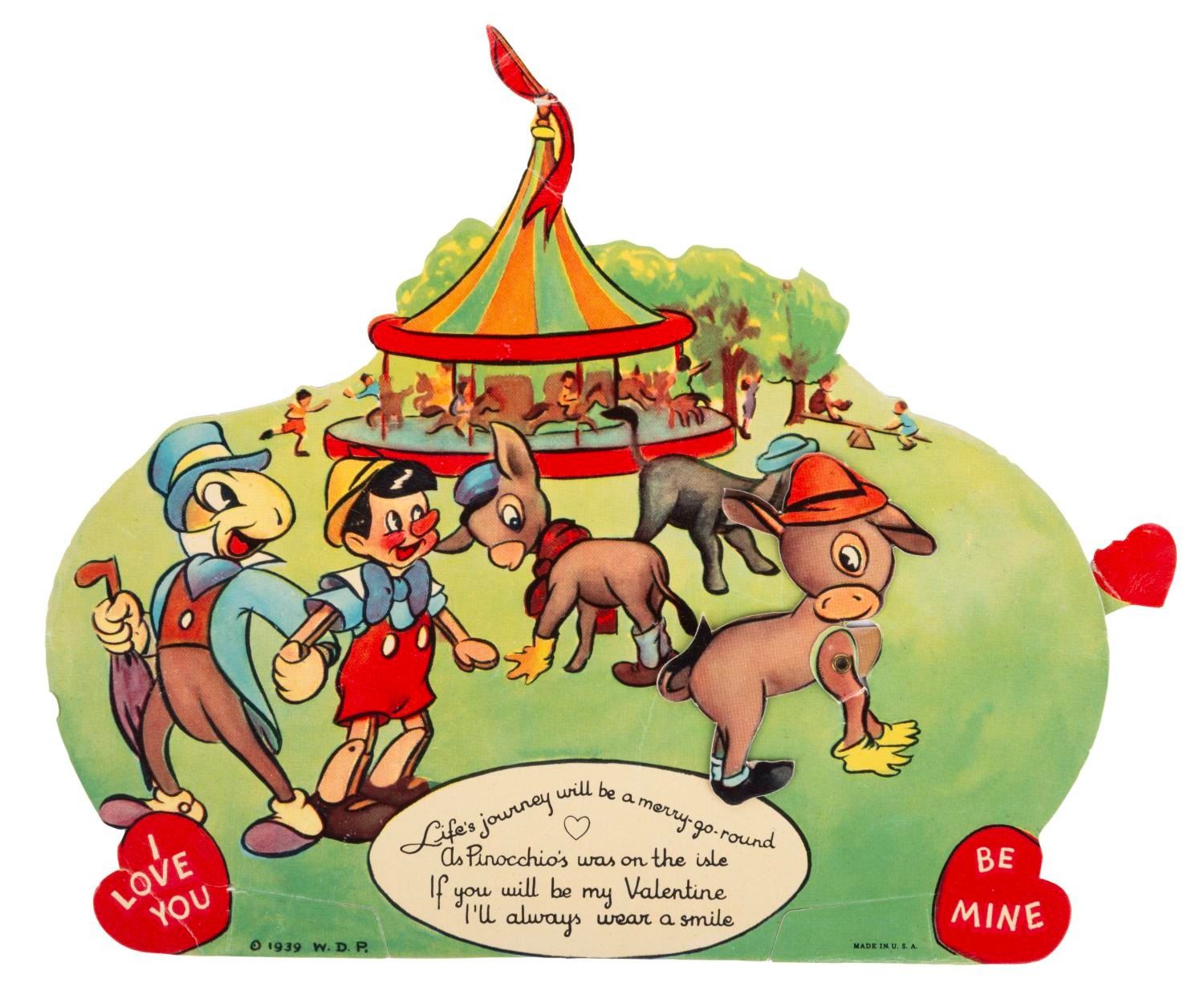 (Disney, 1939) A collection of seven mechanical "Pinocchio" Valentine’s Day cards, each with a movable feature. Measuring up to 8.25" x 7", the cards are in very good condition with light wear from handling and age, dedications written on the backs, and a tear to the mechanical feature on the Pleasure Island donkeys card.