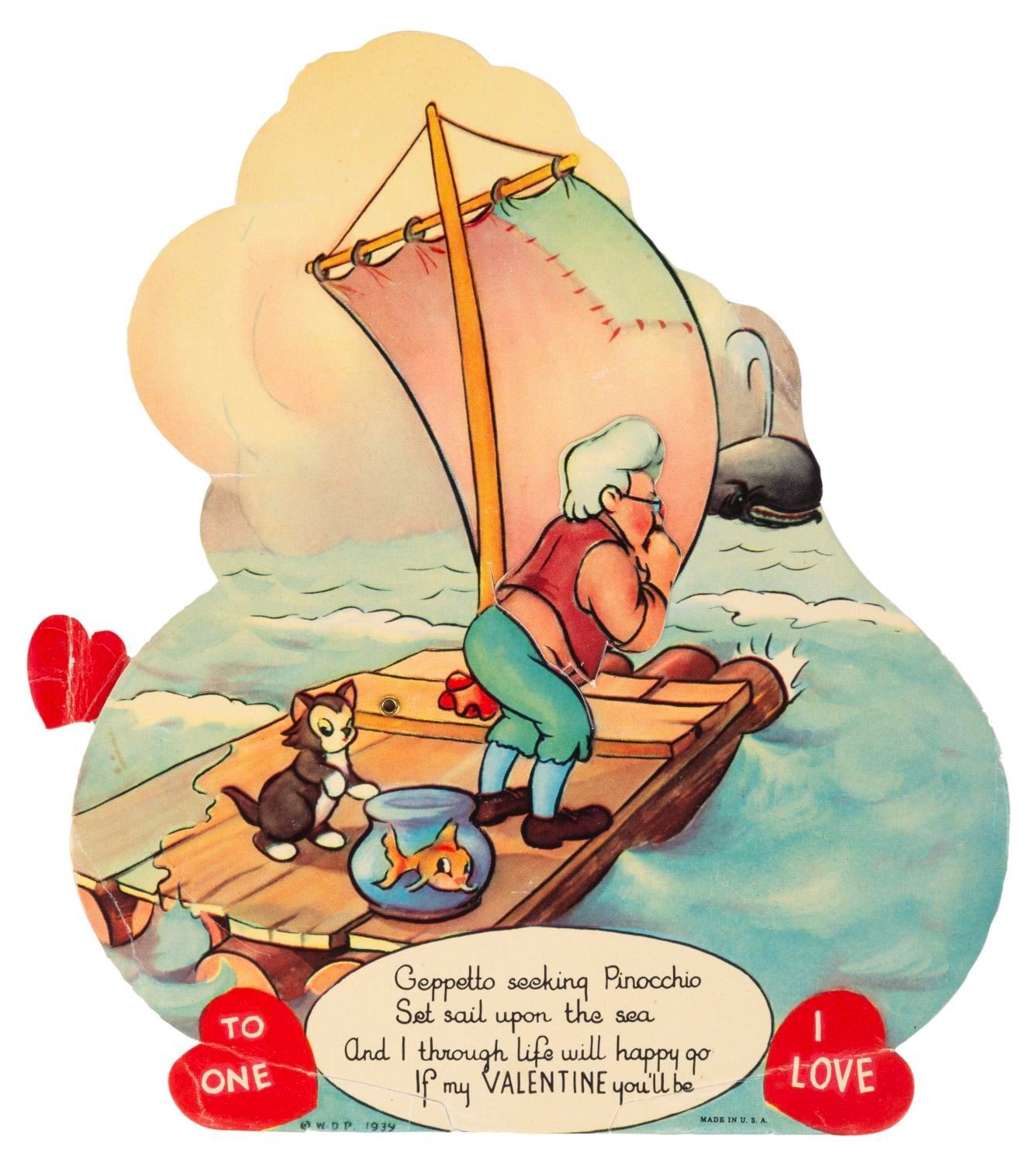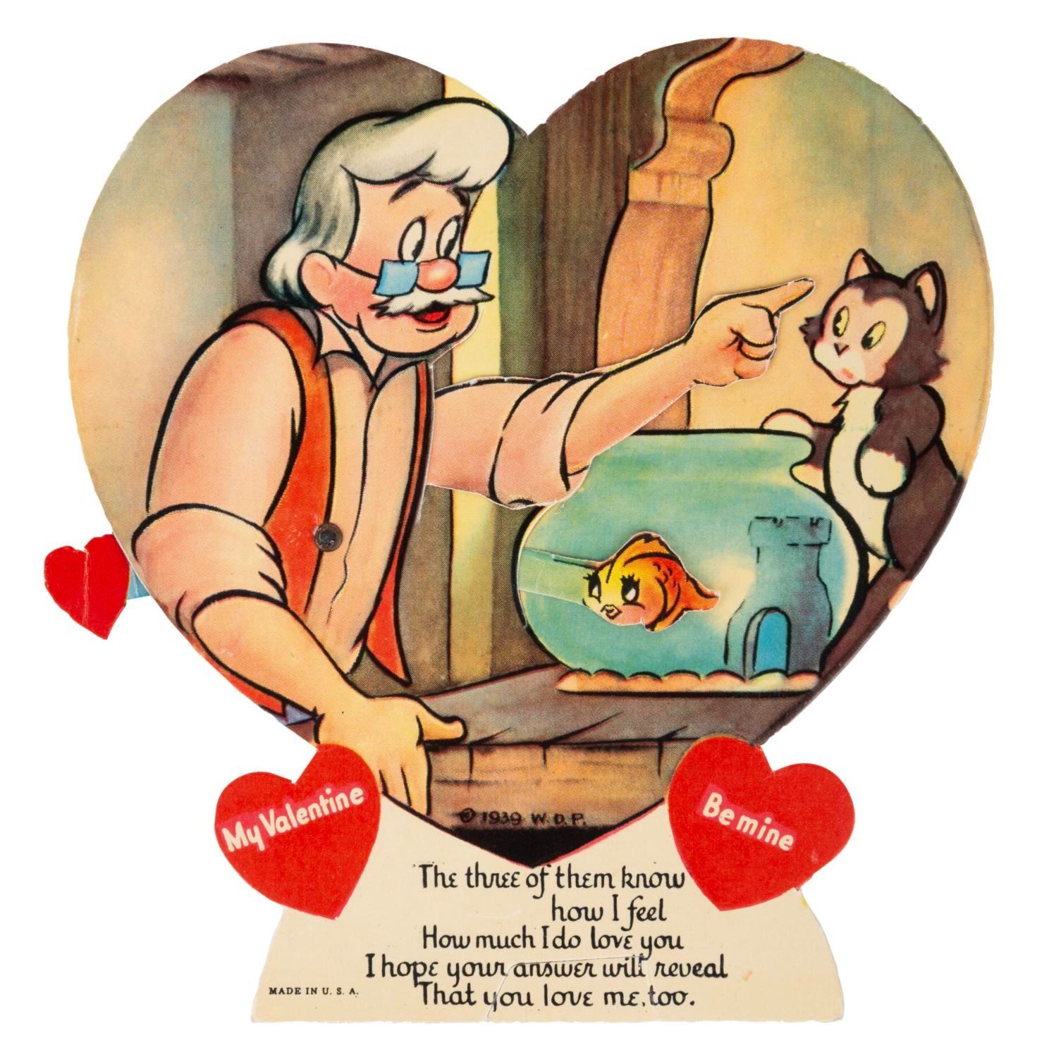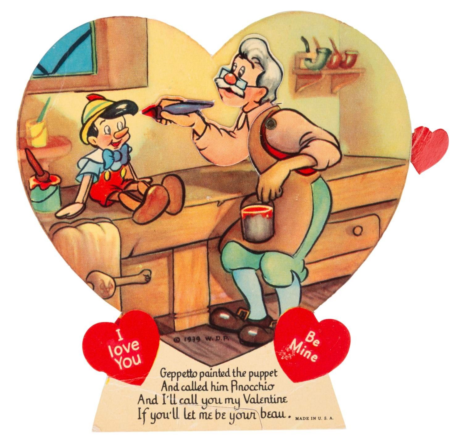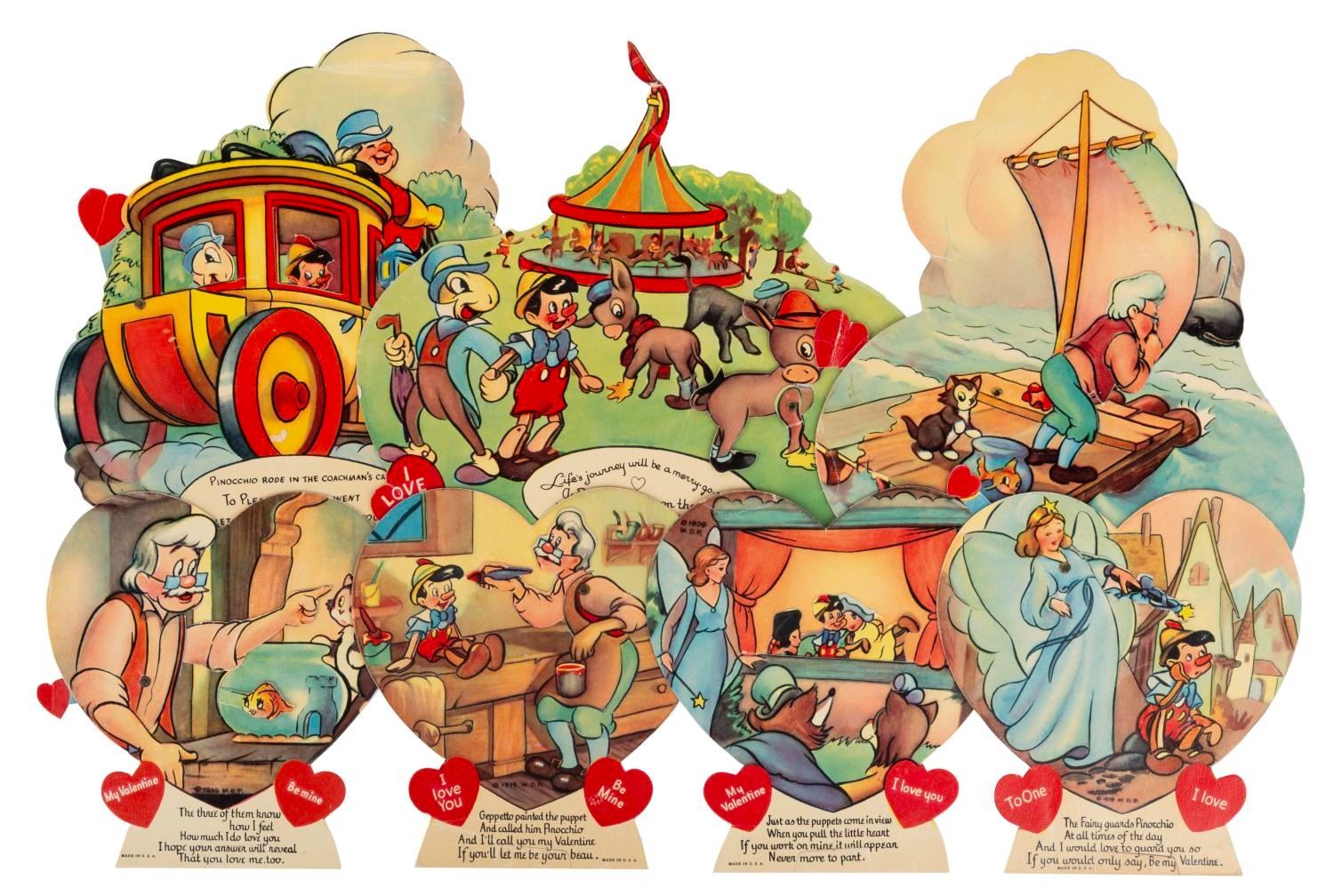 (Disney, 1939) A collection of seven mechanical "Pinocchio" Valentine’s Day cards, each with a movable feature. Measuring up to 8.25" x 7", the cards are in very good condition with light wear from handling and age, dedications written on the backs, and a tear to the mechanical feature on the Pleasure Island donkeys card.