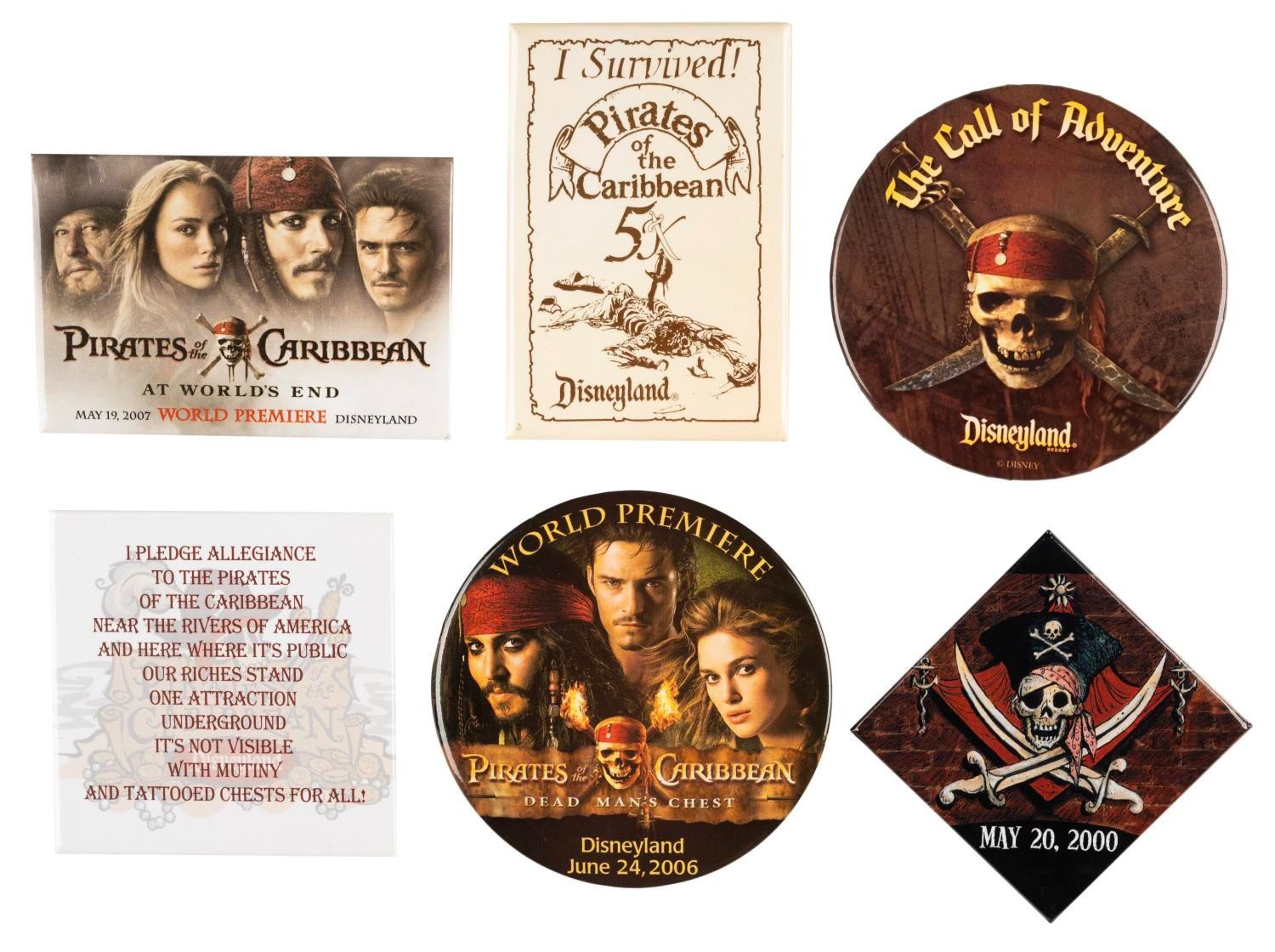 (Disneyland, 1994-2007) A collection of six souvenir buttons from Pirates of the Caribbean events at Disneyland. Included are a rare Cast Member 5K event from 1994, and World Premiere buttons for the films released in 2006 and 2007. The buttons are in very good condition with typical light handling wear.