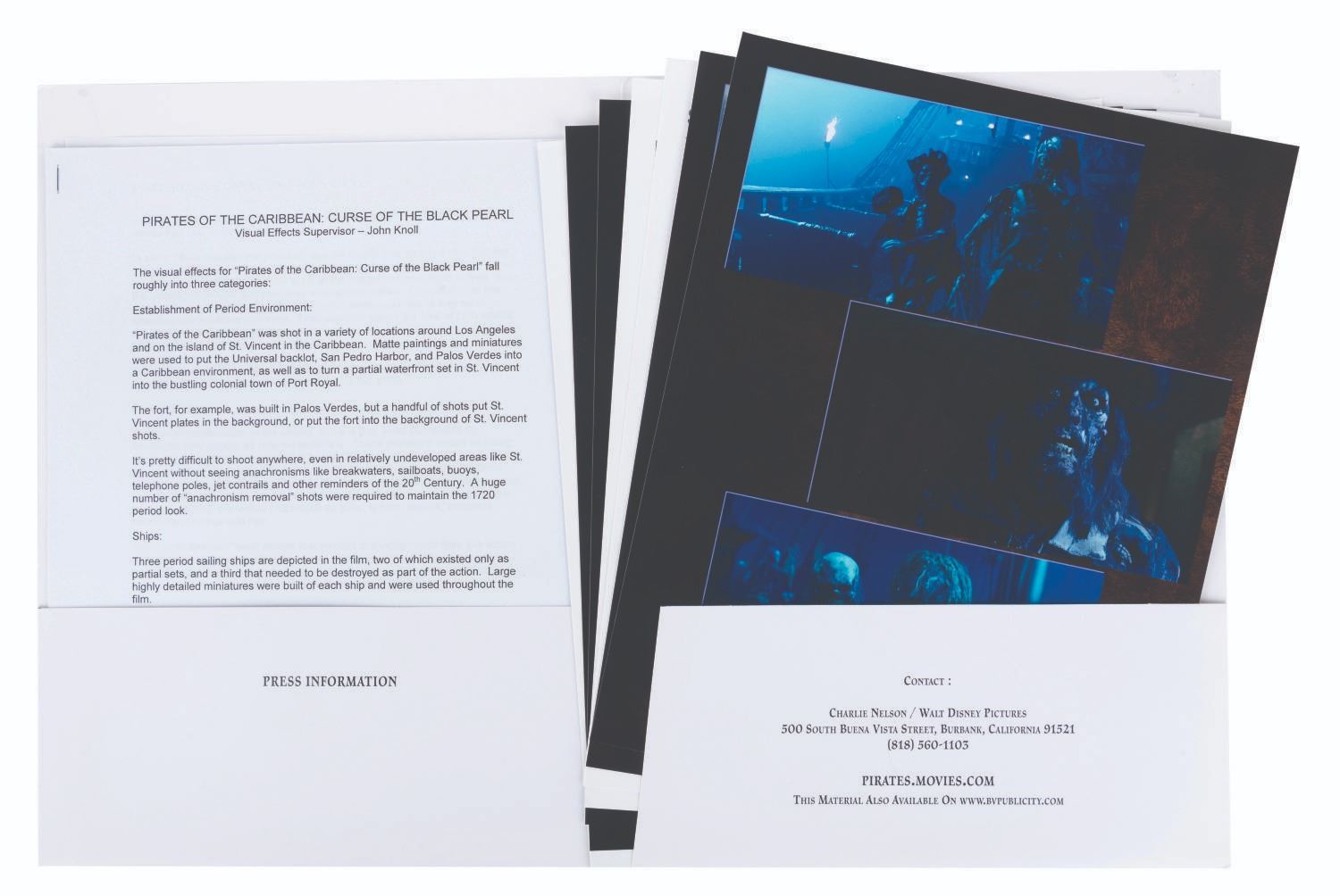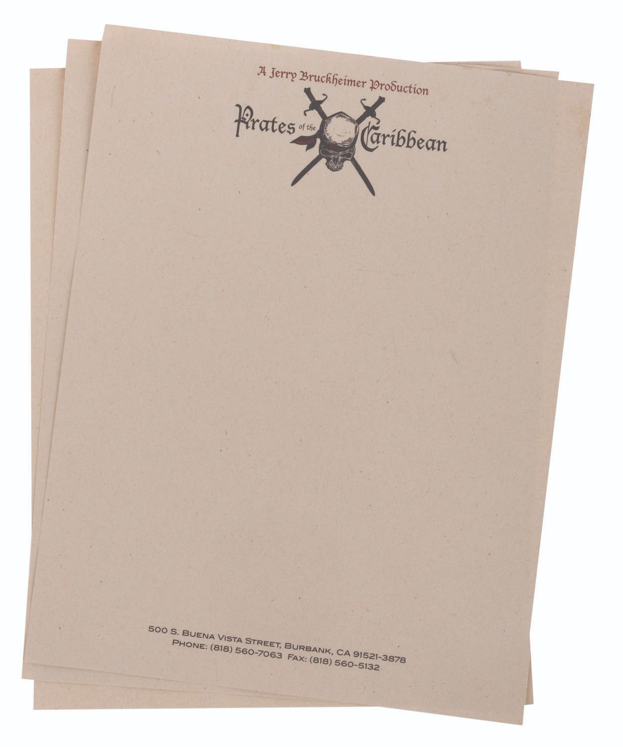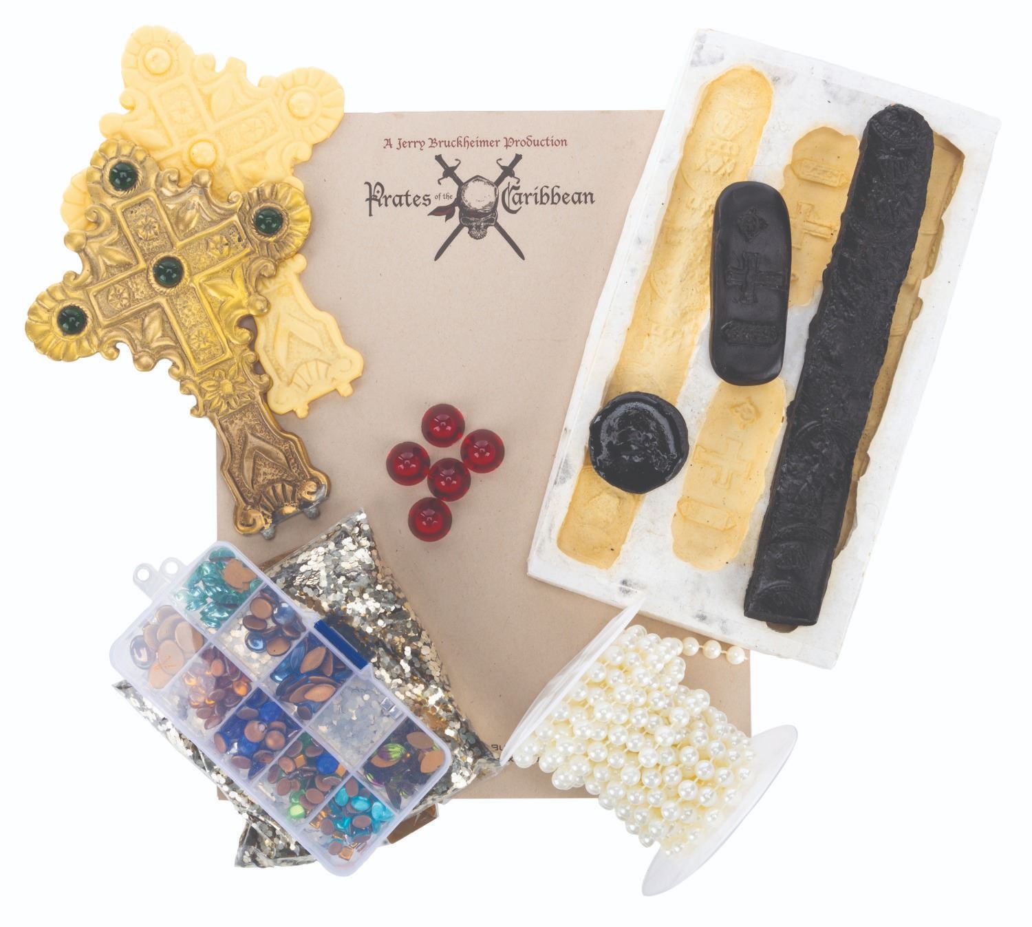 (Disney, 2003) A collection of unfinished props and production materials from "Pirates of the Caribbean: The Curse of the Black Pearl.” The props include a silicone mold for ingots and coins with four unpainted resin casts, over 200 faux jewels with a spool of "pearls" on a string, a bag of gold-toned sequins, and a gold-toned metal cross with a duplicate unpainted resin cast. The production materials include an unused page of Jerry Bruckheimer stationery themed to the film, and a press kit with 15 pages of press releases and photos. Measuring from the 0.25” x 0.25” jewels to the 9” x 12” press kit, the items are in good to fine condition, with the unfinished props showing typical wear from production use.