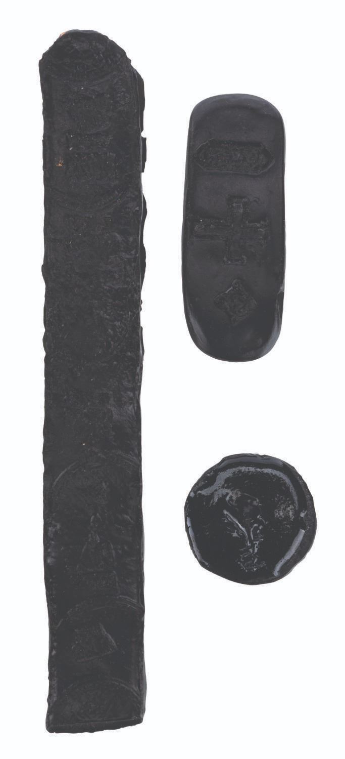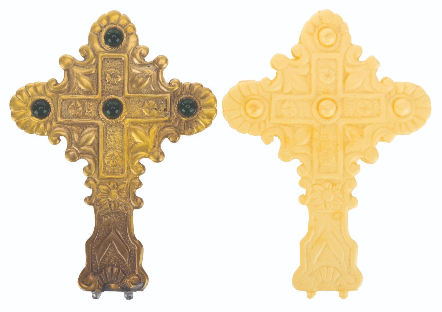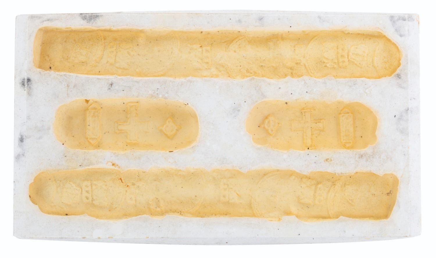 (Disney, 2003) A collection of unfinished props and production materials from "Pirates of the Caribbean: The Curse of the Black Pearl.” The props include a silicone mold for ingots and coins with four unpainted resin casts, over 200 faux jewels with a spool of "pearls" on a string, a bag of gold-toned sequins, and a gold-toned metal cross with a duplicate unpainted resin cast. The production materials include an unused page of Jerry Bruckheimer stationery themed to the film, and a press kit with 15 pages of press releases and photos. Measuring from the 0.25” x 0.25” jewels to the 9” x 12” press kit, the items are in good to fine condition, with the unfinished props showing typical wear from production use.