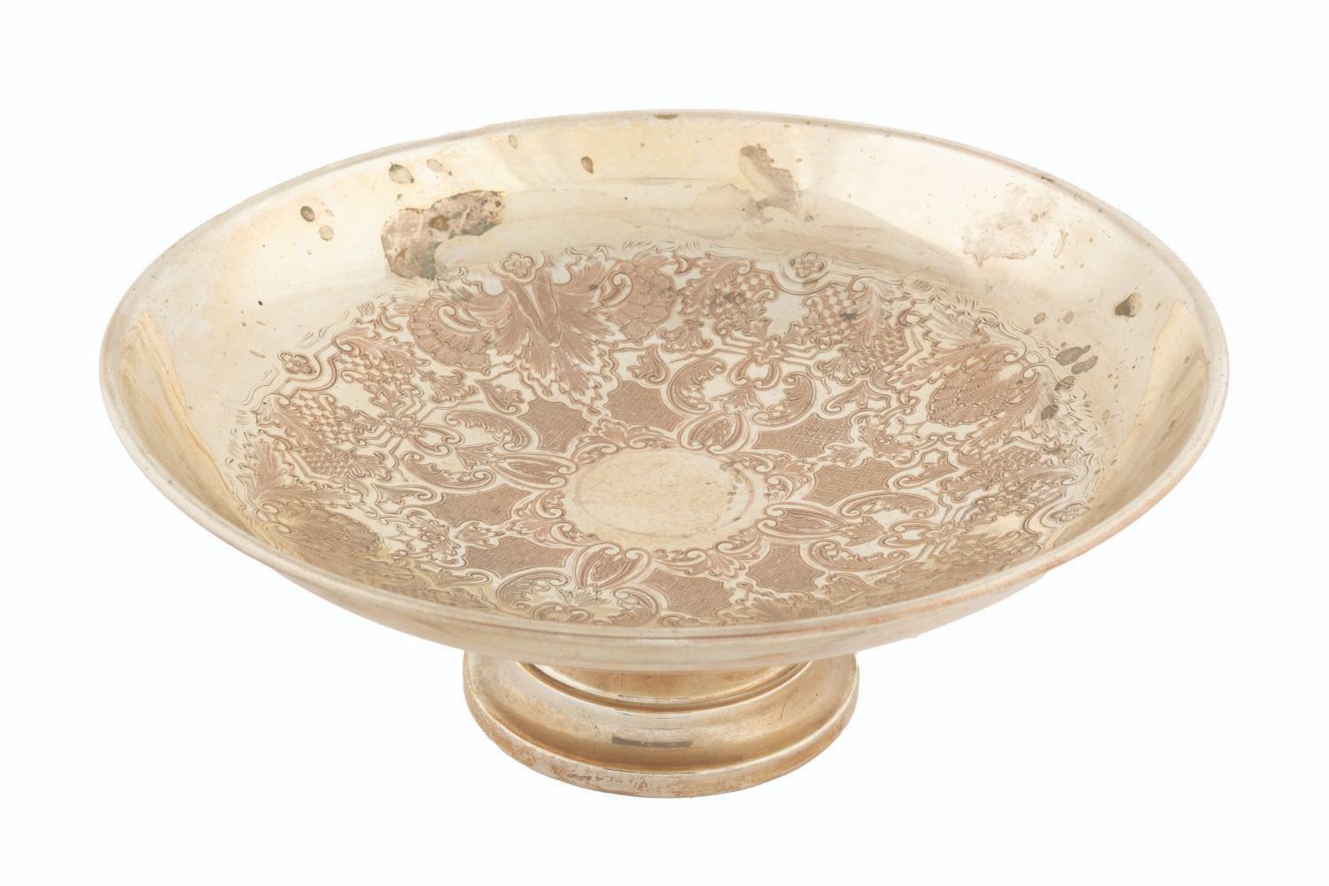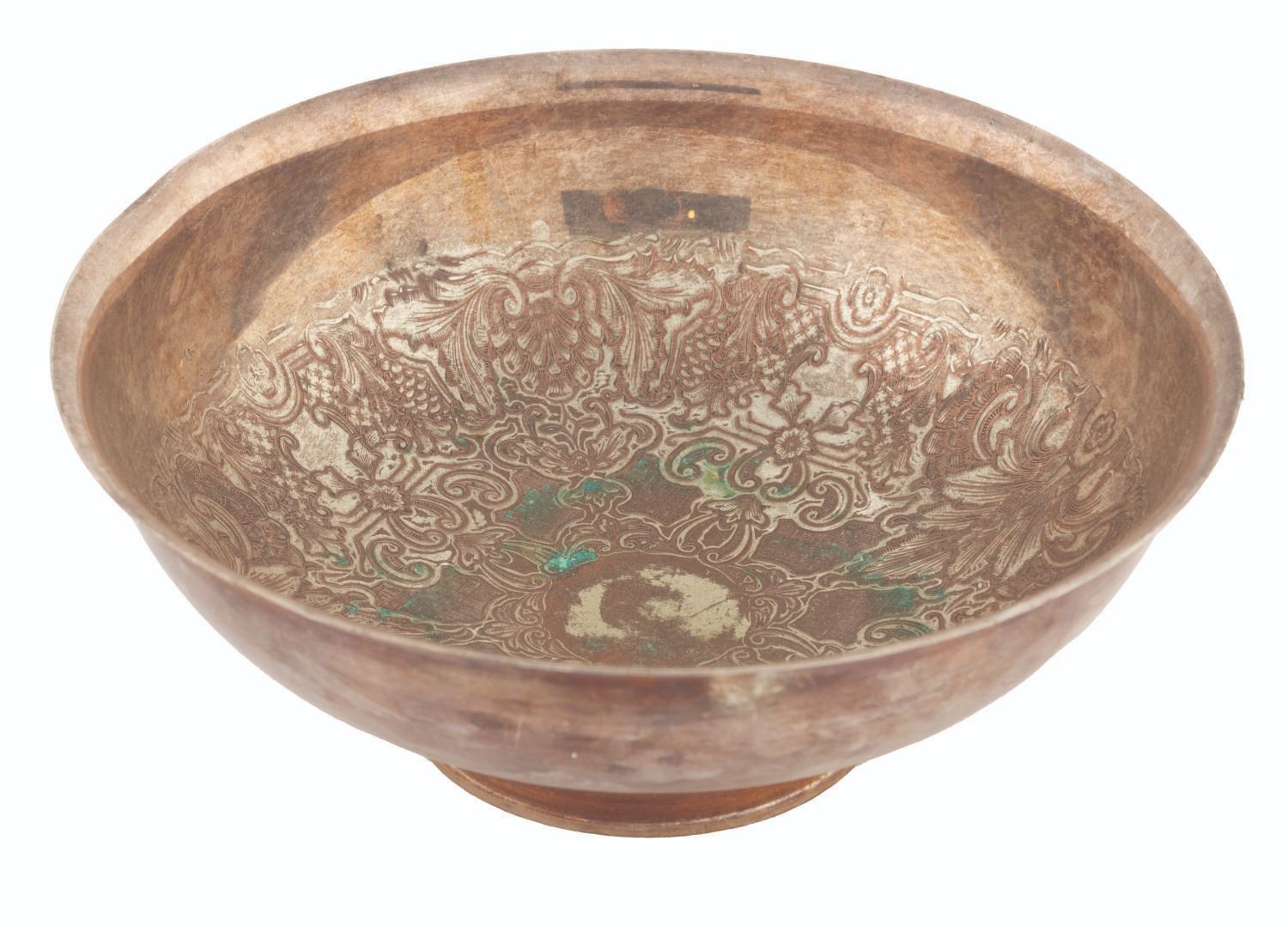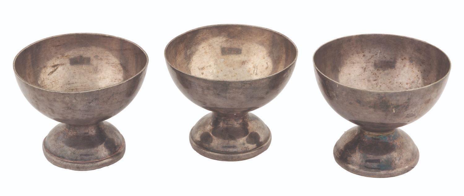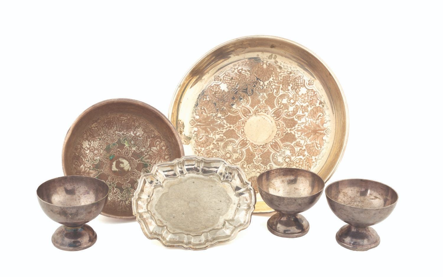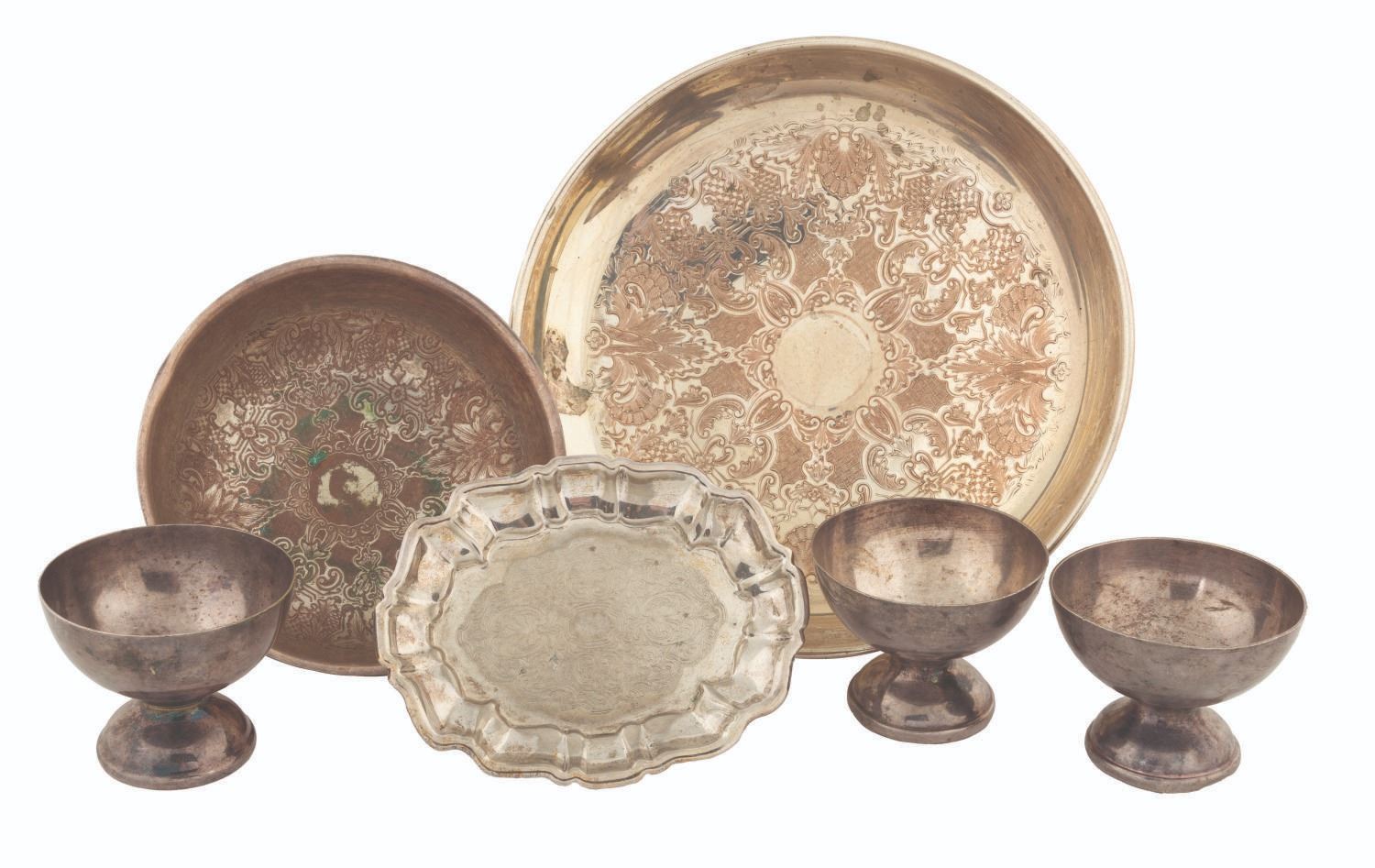 (Disney, 2003) A collection of six treasure props from the Isla de Muerta set of "Pirates of the Caribbean: The Curse of the Black Pearl," including three chalices and three serving platters. Ranging in size from 3.5" in diameter and 3" tall to 10.75" in diameter and 4" tall, the props are in good to very good condition with oxidation, patina, scratches, and wear from production use.