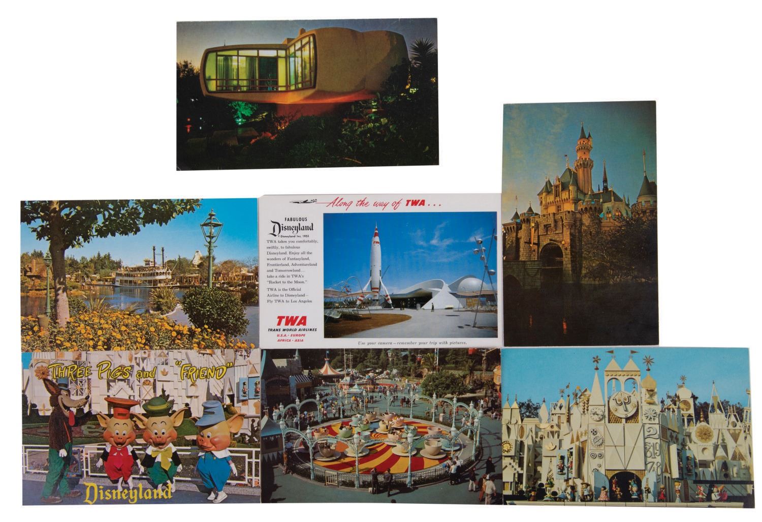(Disneyland) A Collection of (6) assorted vintage Disneyland postcards and a Monsanto House of The Future Brochure. All are in good used condition.