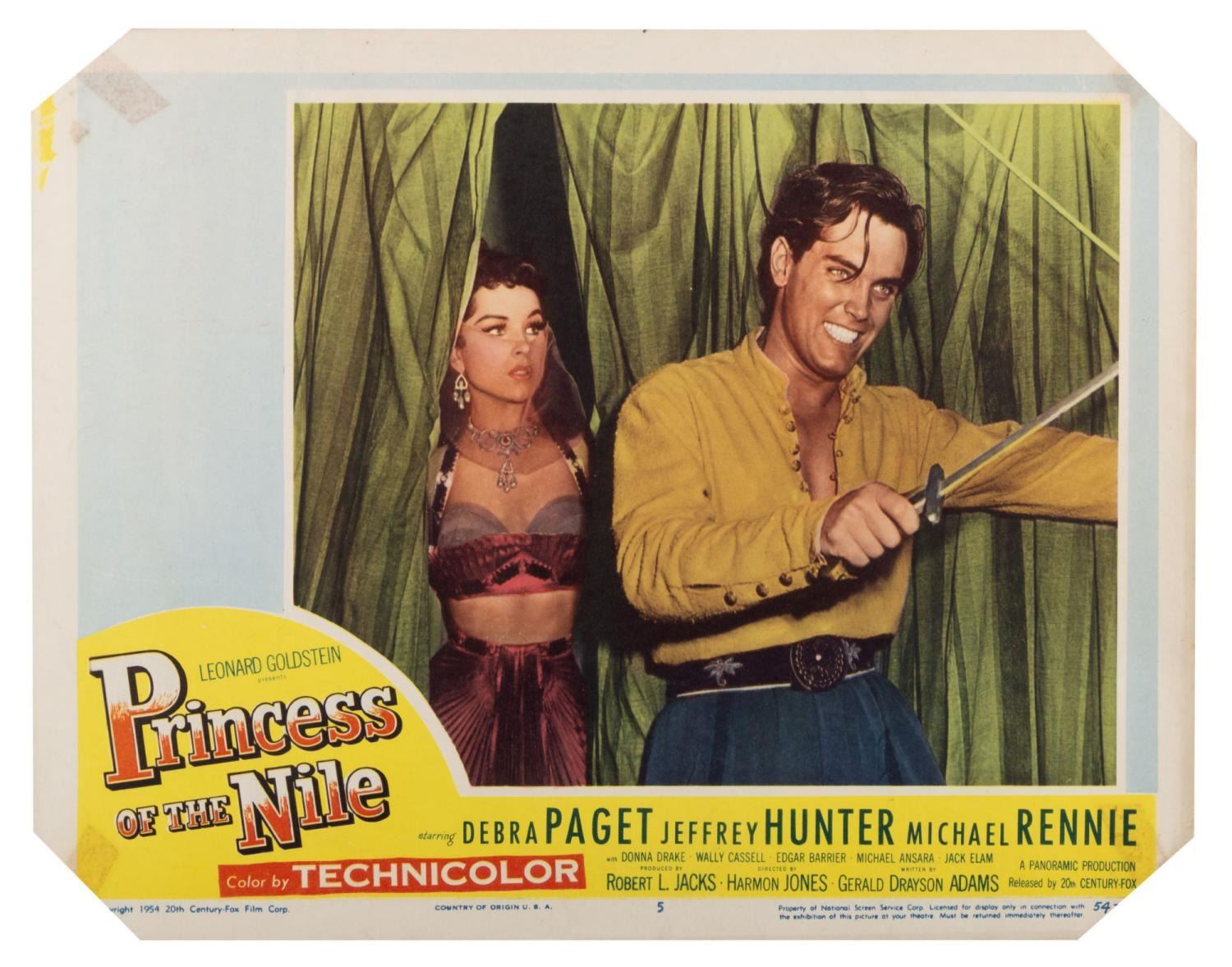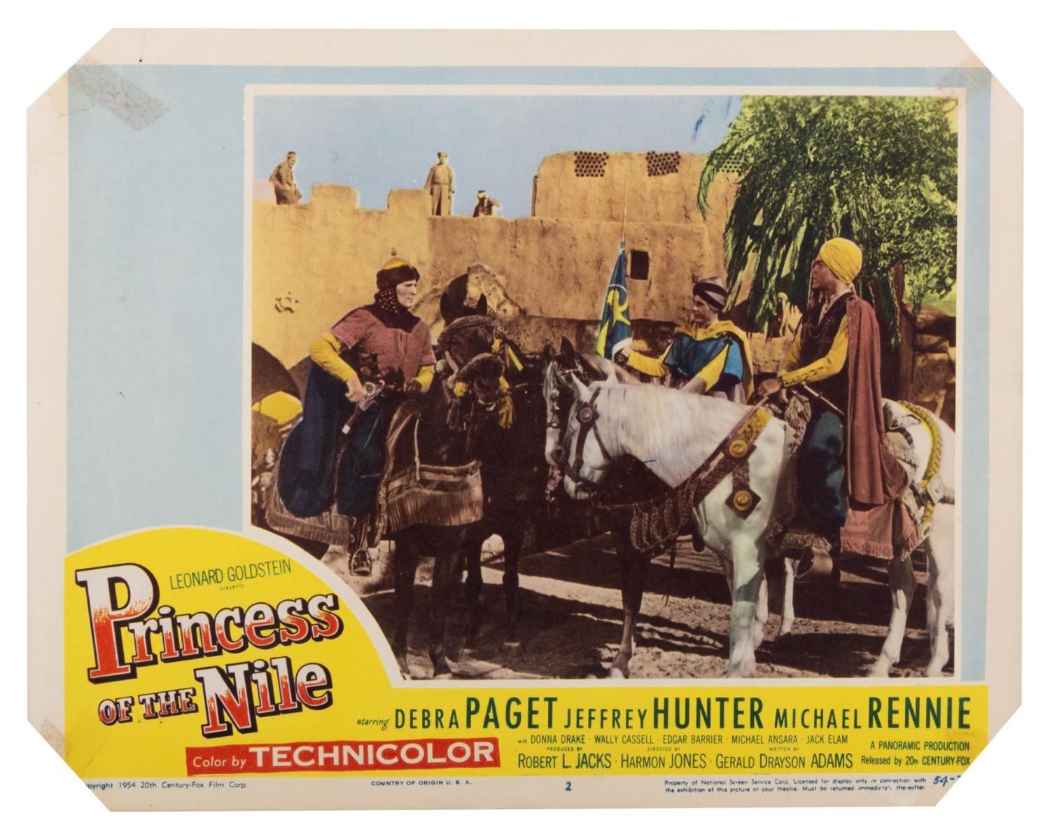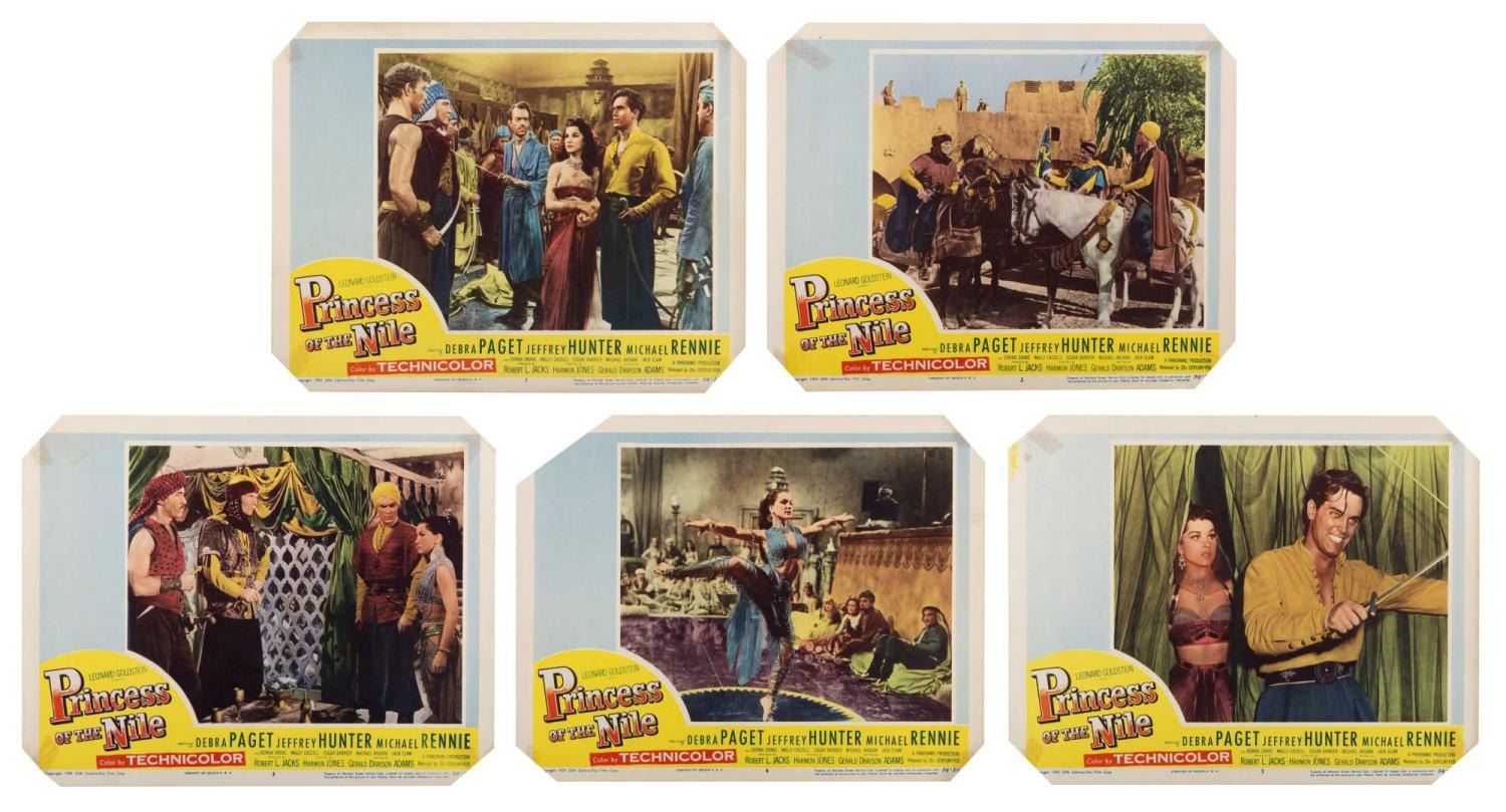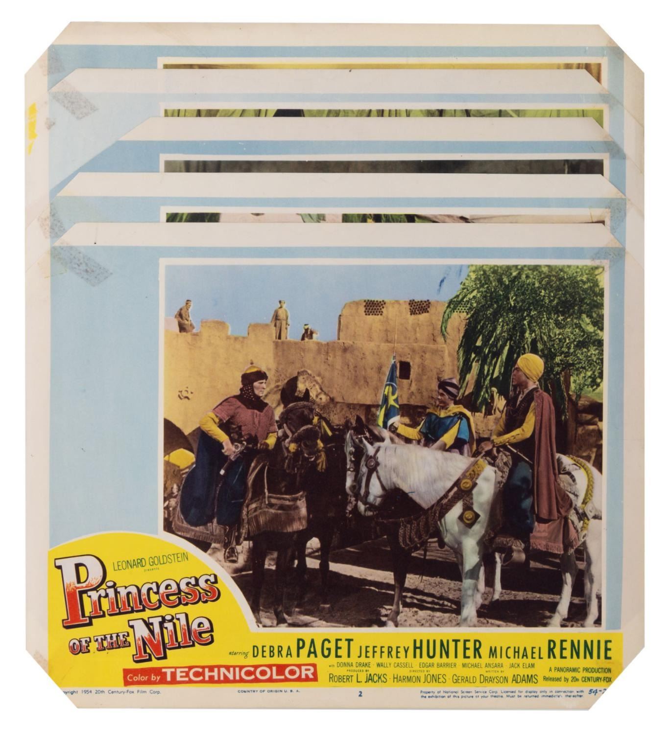 (20th Century Fox, 1954) A collection of five lobby cards for "Princess of the Nile" starring Debra Paget. Measuring 11" x 14" the cards are in fair condition with adhesive tape and adhesive residue, cut corners and soiling.