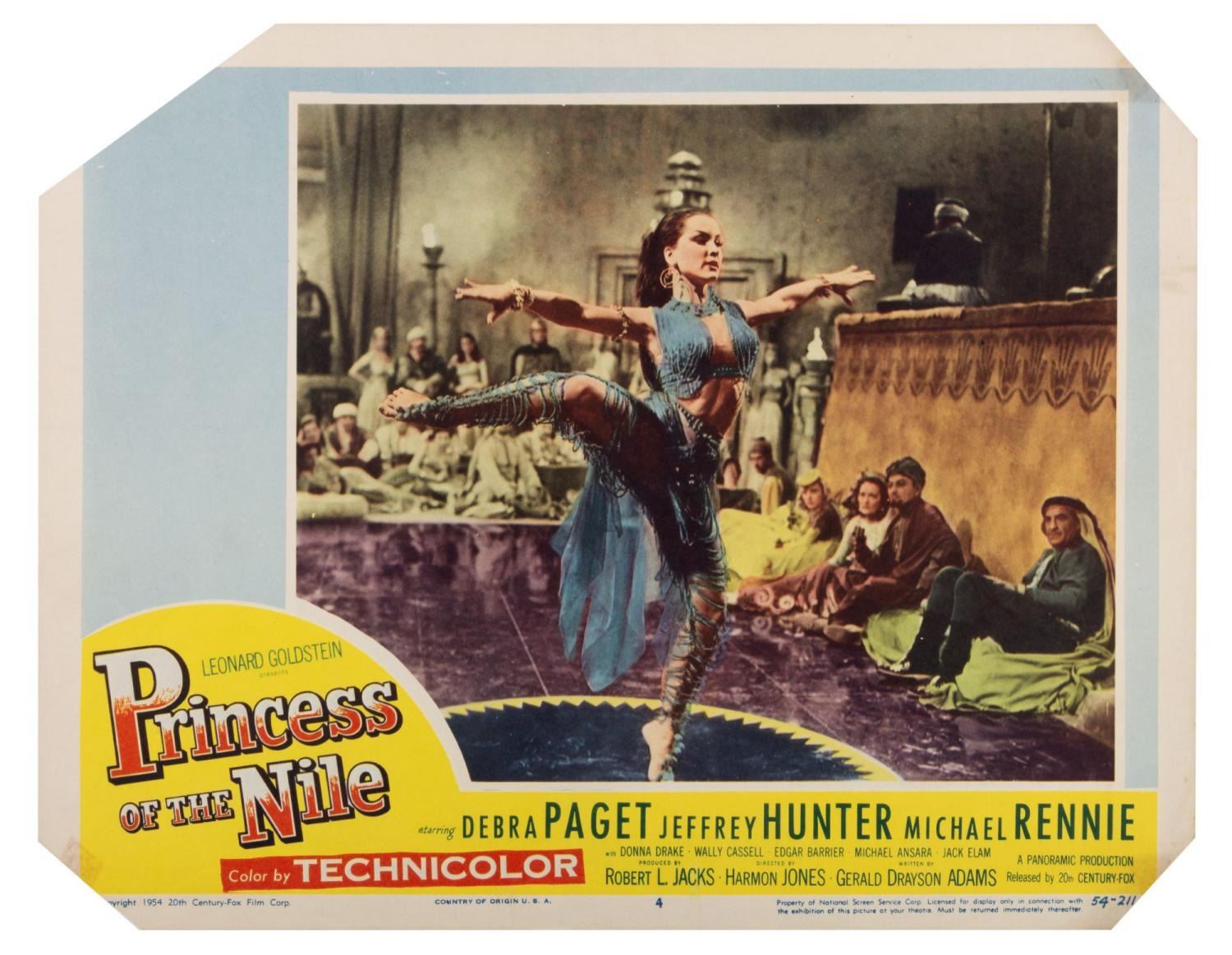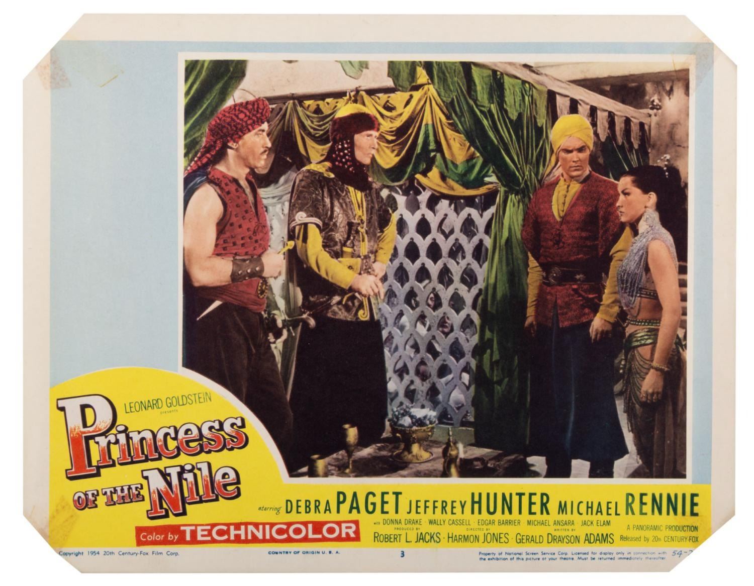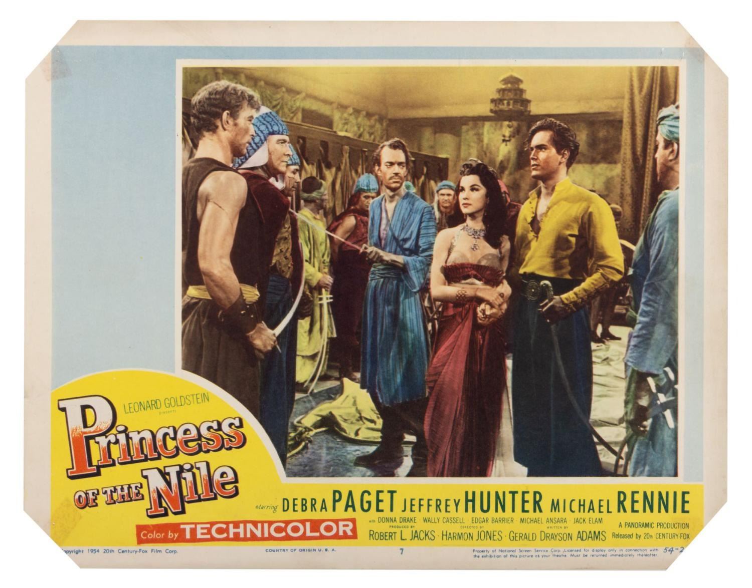(20th Century Fox, 1954) A collection of five lobby cards for "Princess of the Nile" starring Debra Paget. Measuring 11" x 14" the cards are in fair condition with adhesive tape and adhesive residue, cut corners and soiling.