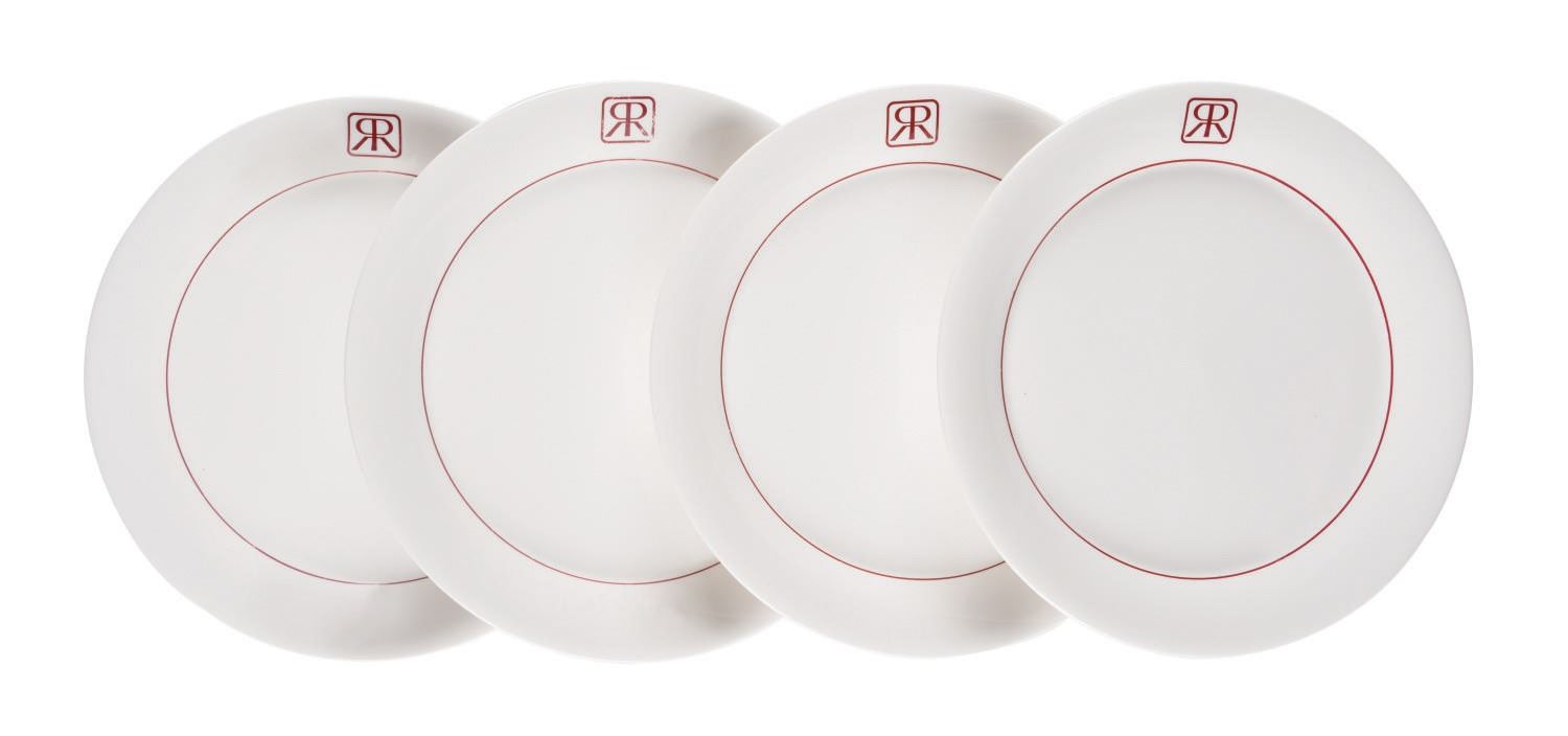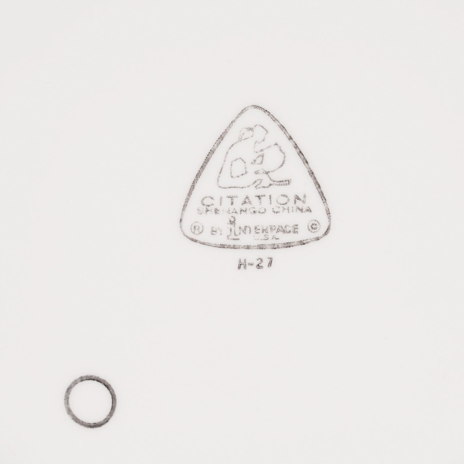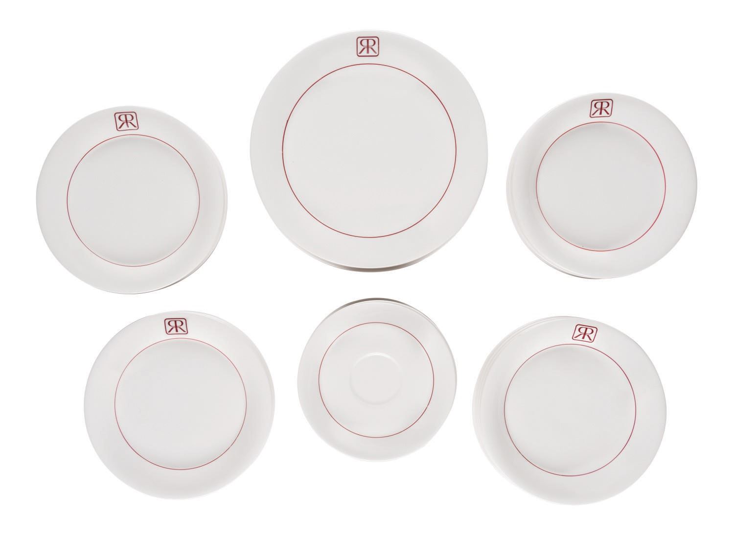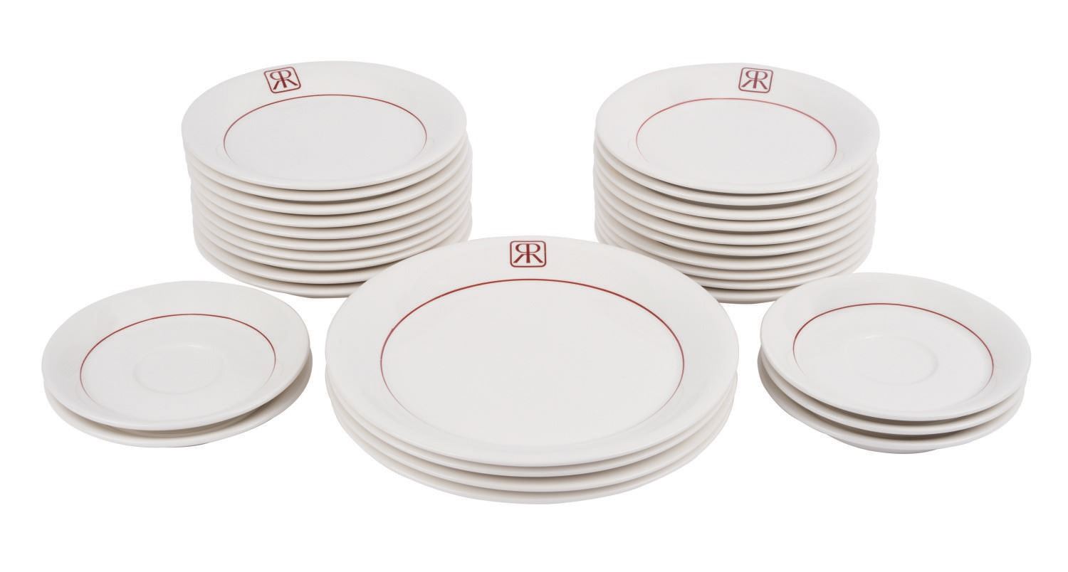 (Disney, c.1969) A collection of (4) large plates, (20) small plates, and (5) saucers bearing the matching pattern and monogram logo of Retlaw Enterprises. The Citation Shenango china dishes were manufactured by Interpace, the same company that manufactured Mary Blair's murals for Walt Disney World and Disneyland. Measuring diameters of 8.5" to 5.5", the dishes are in very good to fine condition with the slightest wear from use.