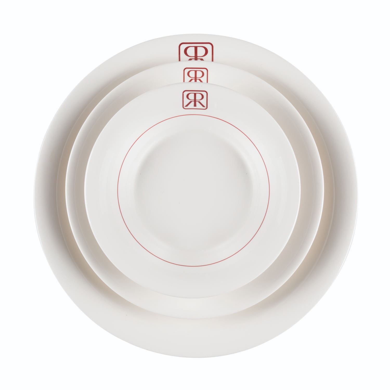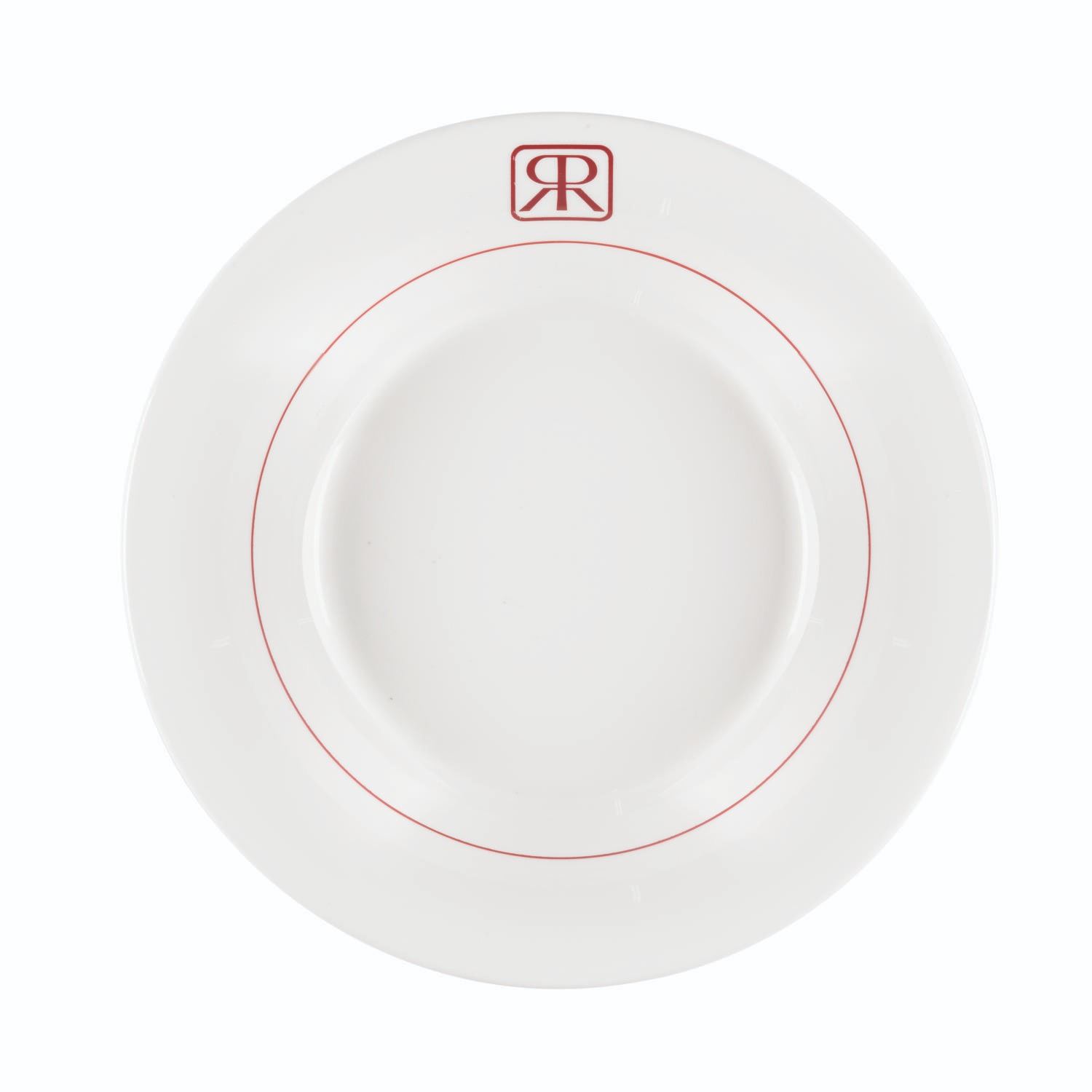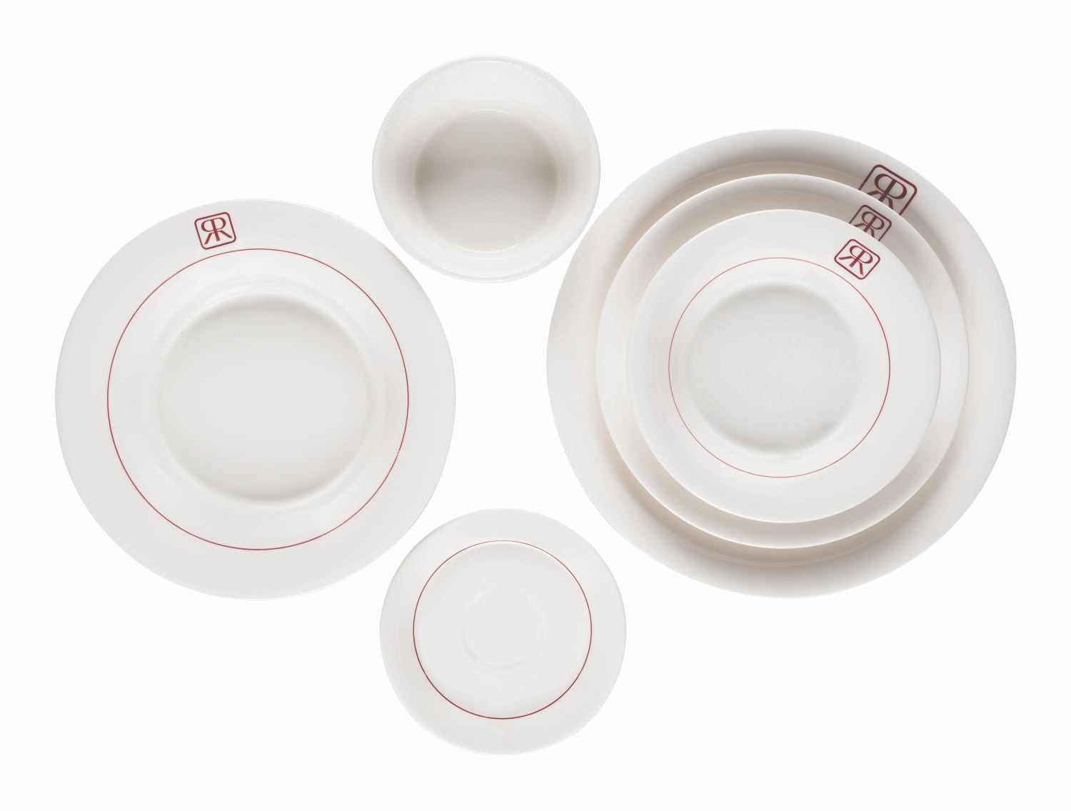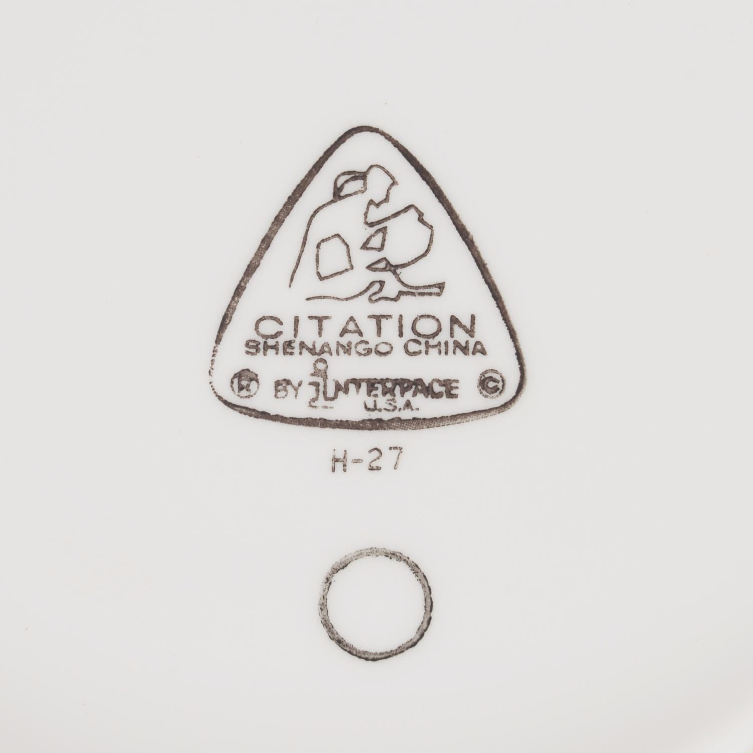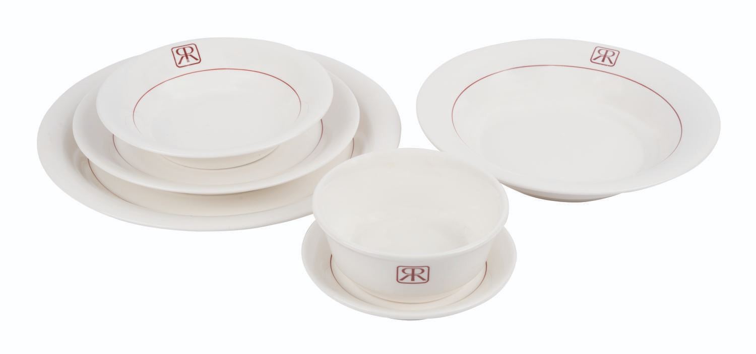 (Disney, 1969) A collection of six plates, bowls, and saucers bearing the matching pattern and monogram logo of Walt Disney's Retlaw Enterprises. The Citation Shenango China dishes were made by Interpace, the same company that manufactured the tiles for Mary Blair's murals for Walt Disney World and Disneyland. Measuring 5" to 8" in diameter the dishware is in very good to fine condition with some light wear from handling or use.