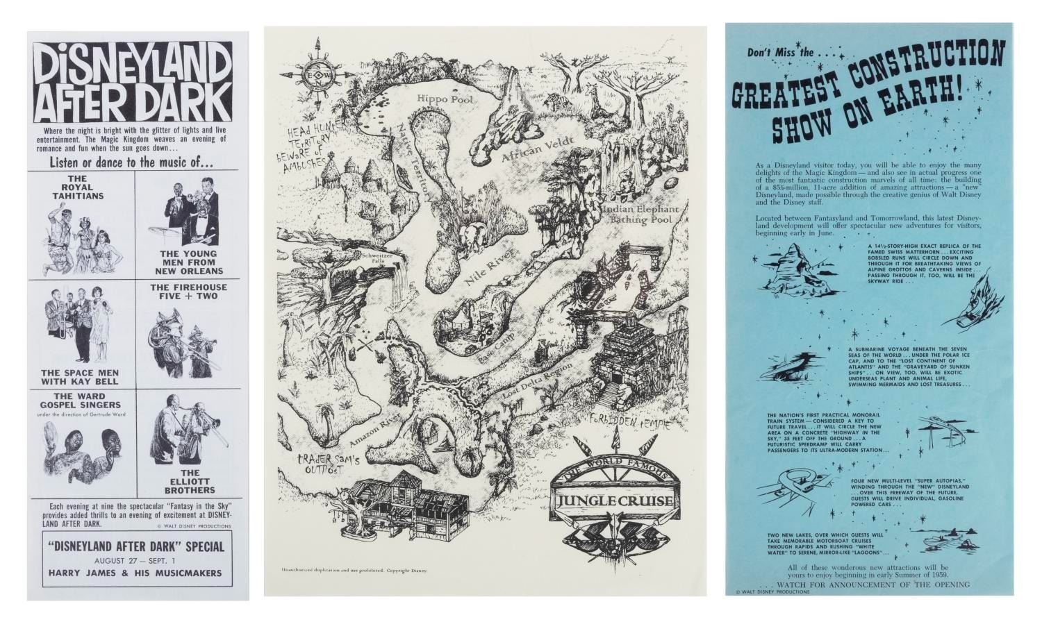(Disneyland, 1958-2000s) A collection of three rare fliers from Disneyland. A 1958 flier explains the ongoing construction of the Matterhorn, Submarine Voyage, and Monorail. A 1963 flier outlines Disneyland After Dark headliners, and lists ticket books available including the Starlite Ticket Book for couples. The final piece is a souvenir Jungle Cruise map distributed by ride operators in the 1990s and 2000s. Measuring between 4.25"x11" and 8.5"x11", the ephemera is in very good to fine condition, with a pen notation on the bottom of the Starlite Ticket flier.