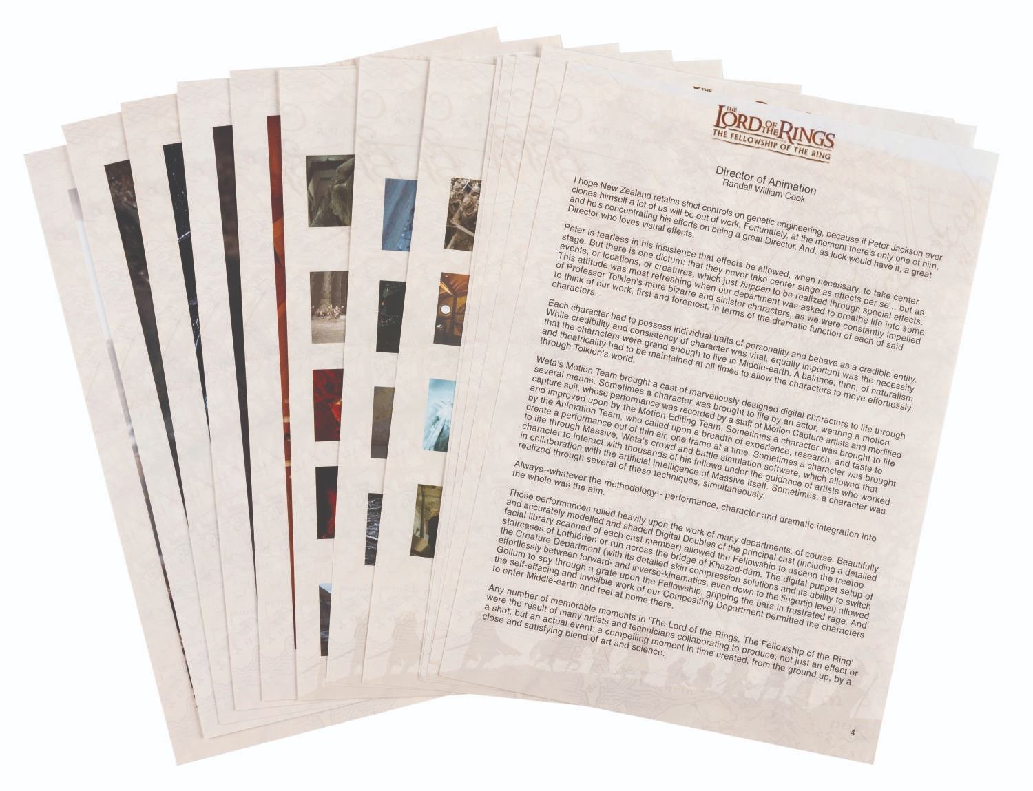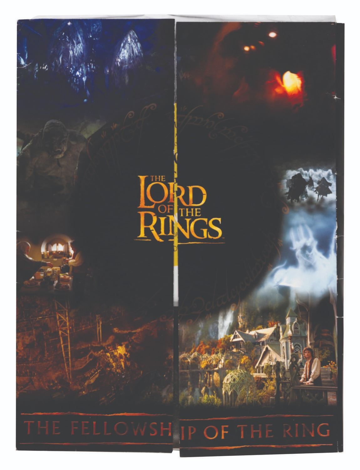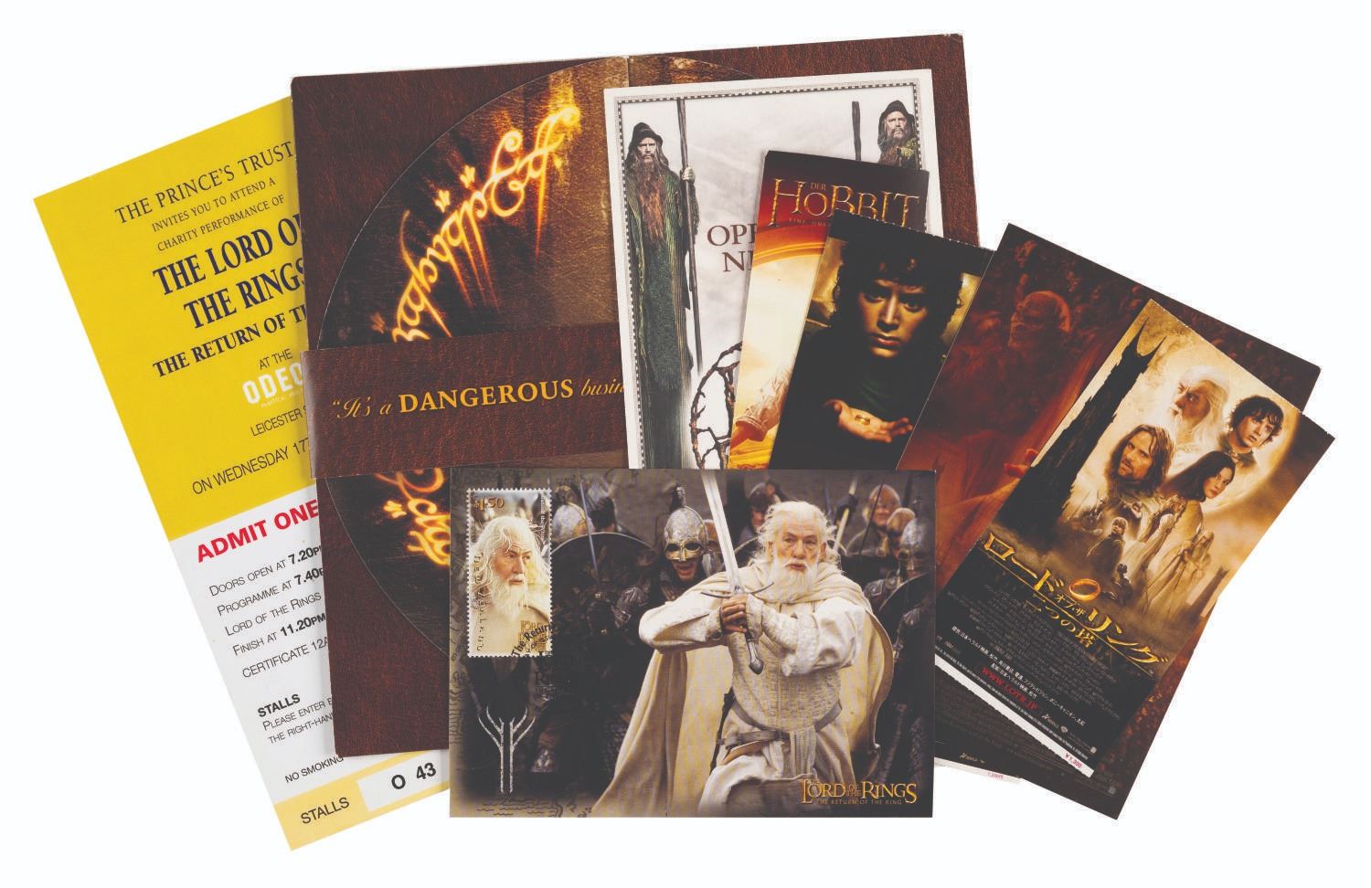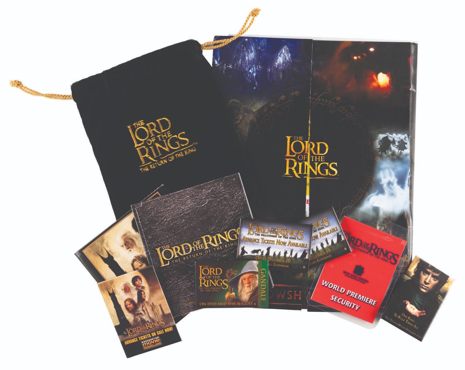 (Warner Brothers, 2001-03) A collection of rare Lord of the Rings film trilogy ephemera from around the world. Included from "The Fellowship of the Rings” are two admission tickets from Japan, a laminated security badge for the world premiere, a colorful 13-page press kit on the visual effects of the film, an invitation letter and order form for the Charity First Night performance of the film in London, two copies of an advance ticket sales button, two more buttons, and an invitation to the Warner Studio lot in Burbank for the film’s DVD release. From "The Two Towers” are a digital press kit on two CDs, a Japanese ticket stub, a postcard of the poster, an advance ticket sales button, and an invitation to a breakfast screening in Los Angeles for the DVD release. From "The Return of the King” are a ticket to the Prince’s Trust screening in London, a press CD with photography from the film, a New Zealand postcard with a Gandalf stamp, and a velveteen bag. Also included is an Opening Night party invitation for The Lord of the Rings stage production in London in 2007, and an info sheet from the New Zealand travel company providing tours of the filming locations. Measuring from the 3” x 2” Japanese tickets to the 12” x 9” visual effects press packet, the items are in good to very good condition with typical handling wear. All in all, this is a wide and varied collection that would be nearly impossible to duplicate.