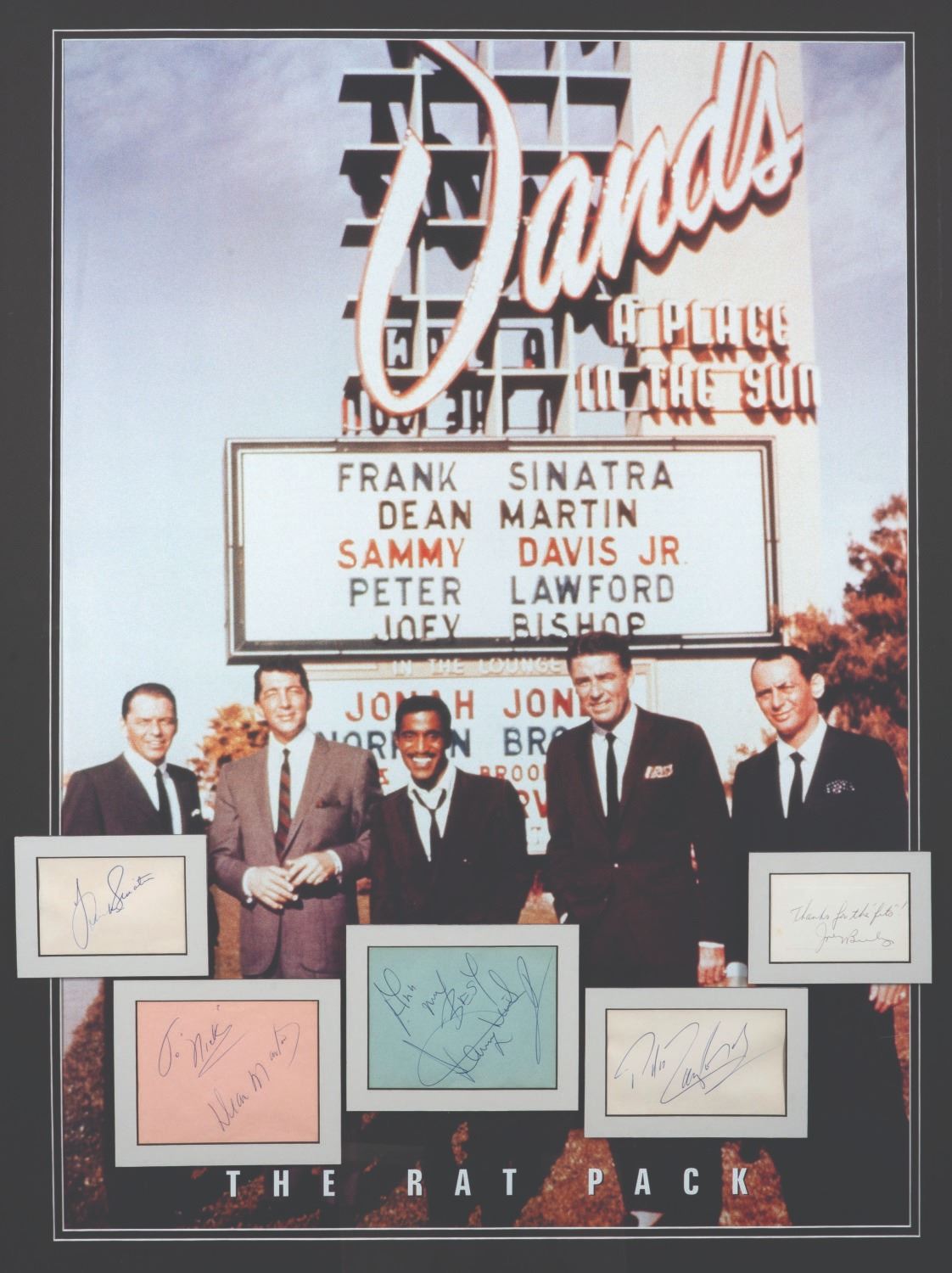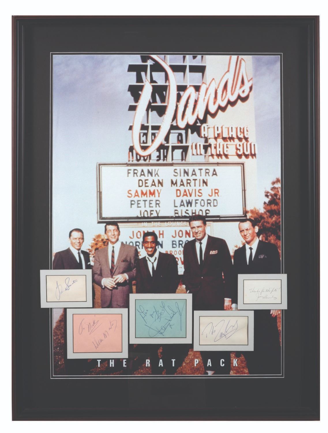 (Hollywood/Las Vegas, 1950s-1960s) A complete collection of autographs from the (5) members of The Rat Pack. Legend has it the name was coined by Lauren Bacall when husband Humphrey Bogart returned home from a night in Las Vegas with a group of show business friends, and she exclaimed"You look like a g*ddamn rat pack." The group of friends took the name and informally had many members, but the name became famous after Bogart passed away in 1957, and Frank Sinatra became the de facto leader. The key members were Sinatra, Dean Martin, Sammy Davis Jr., Peter Lawford, and Joey Bishop. In this lot, all (5) of their signatures have been collected by one fan on pages of autograph books, then assembled here displayed with an oversized photo of the group in front of a Las Vegas marquee bearing their names. Sinatra's signature is neat and carefully written. Dean Martin's includes the dedication"To Nick." Sammy Davis Jr.'s is loose, written after"All My Best." Peter Lawford's signature is large and loopy, and Joey Bishop's includes the note"Thanks for the fits", perhaps referring to laughter at Bishop's stand up routine. The signatures are on paper with visible 2.5"x3.75" to 4"x5" size, all in very good condition. The entire framed piece measures 41.5"x32" and is in fine condition.