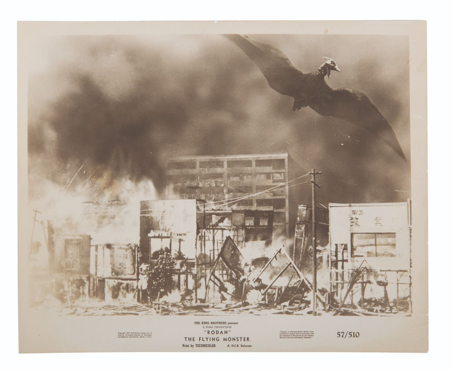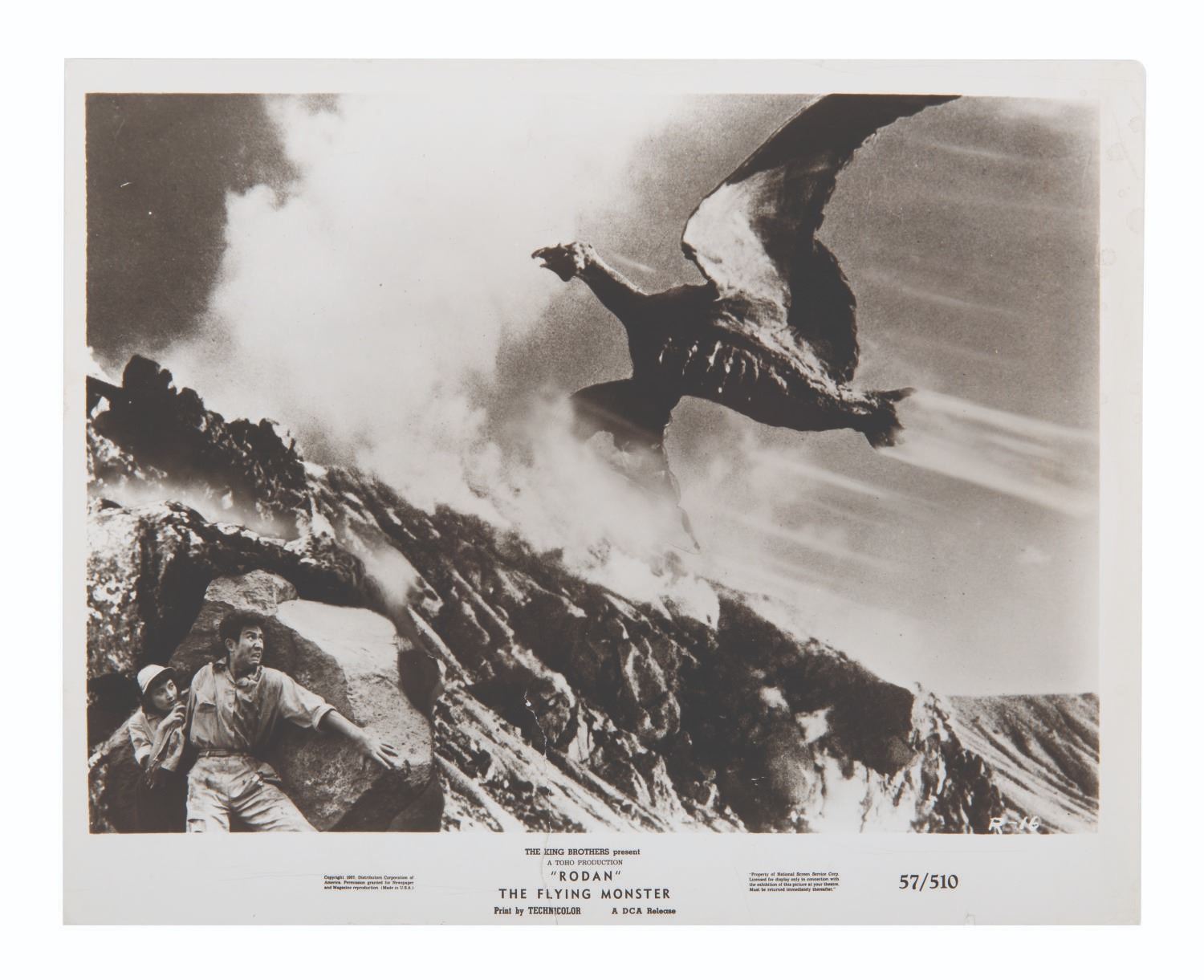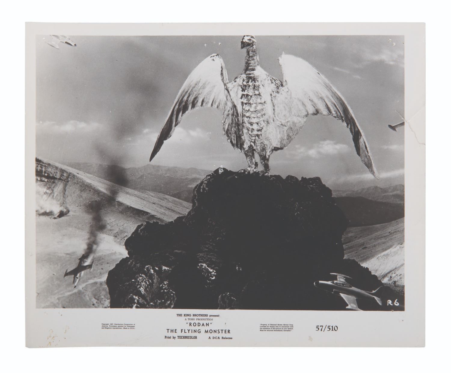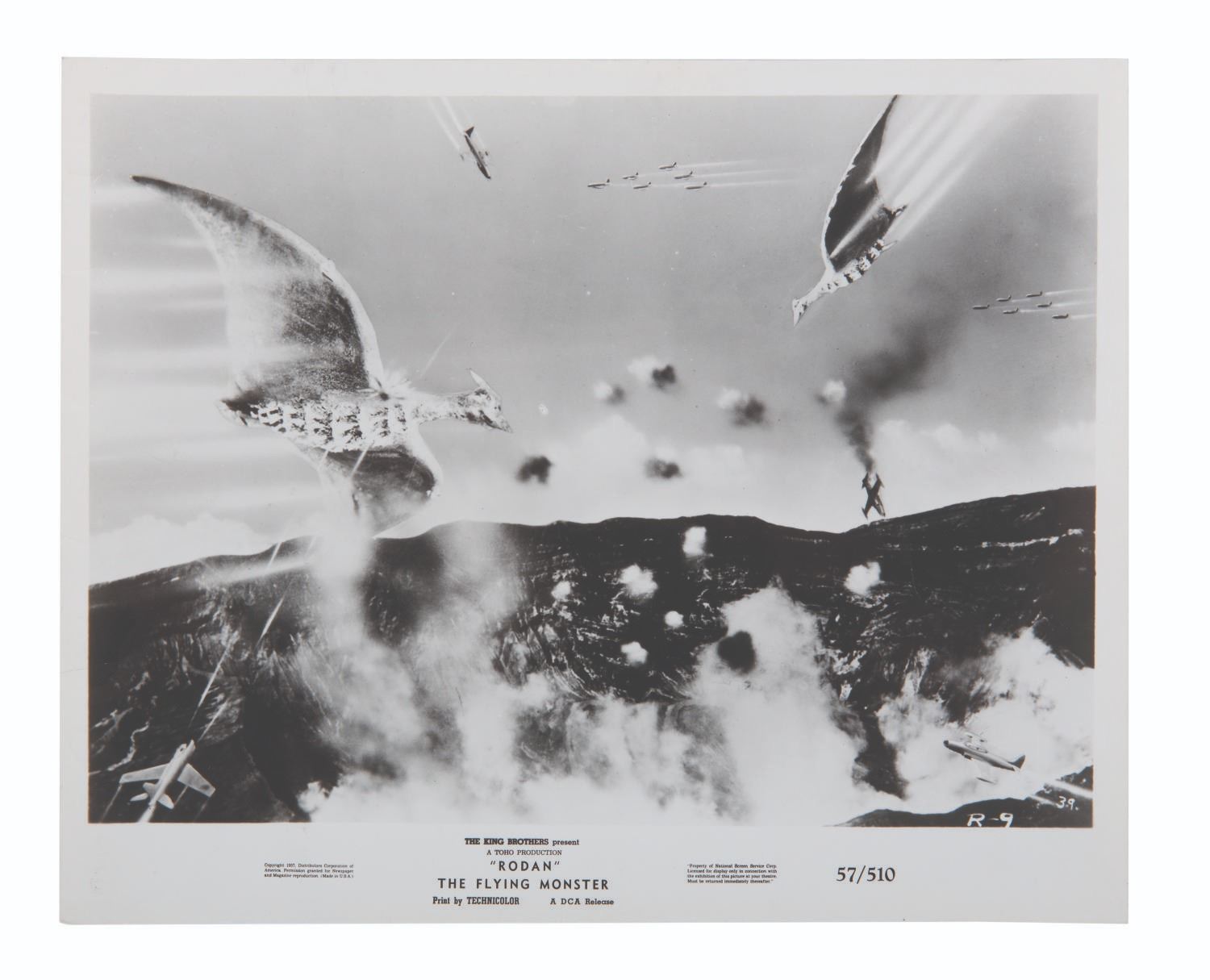 (Toho, 1957) A collection of 12 publicity photos, with two duplicates, for the American release of the Japanese kaiju film"Rodan." Measuring 8" x 10" each, the photos are in fair to good condition with discoloration from age, stains, scratches, creases, folds, writing, edge tears up to 2.25" long, and glue residue on the reverse of two.