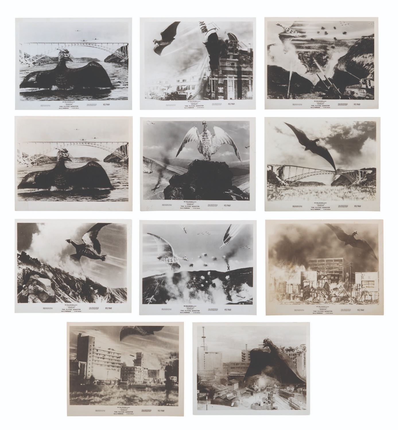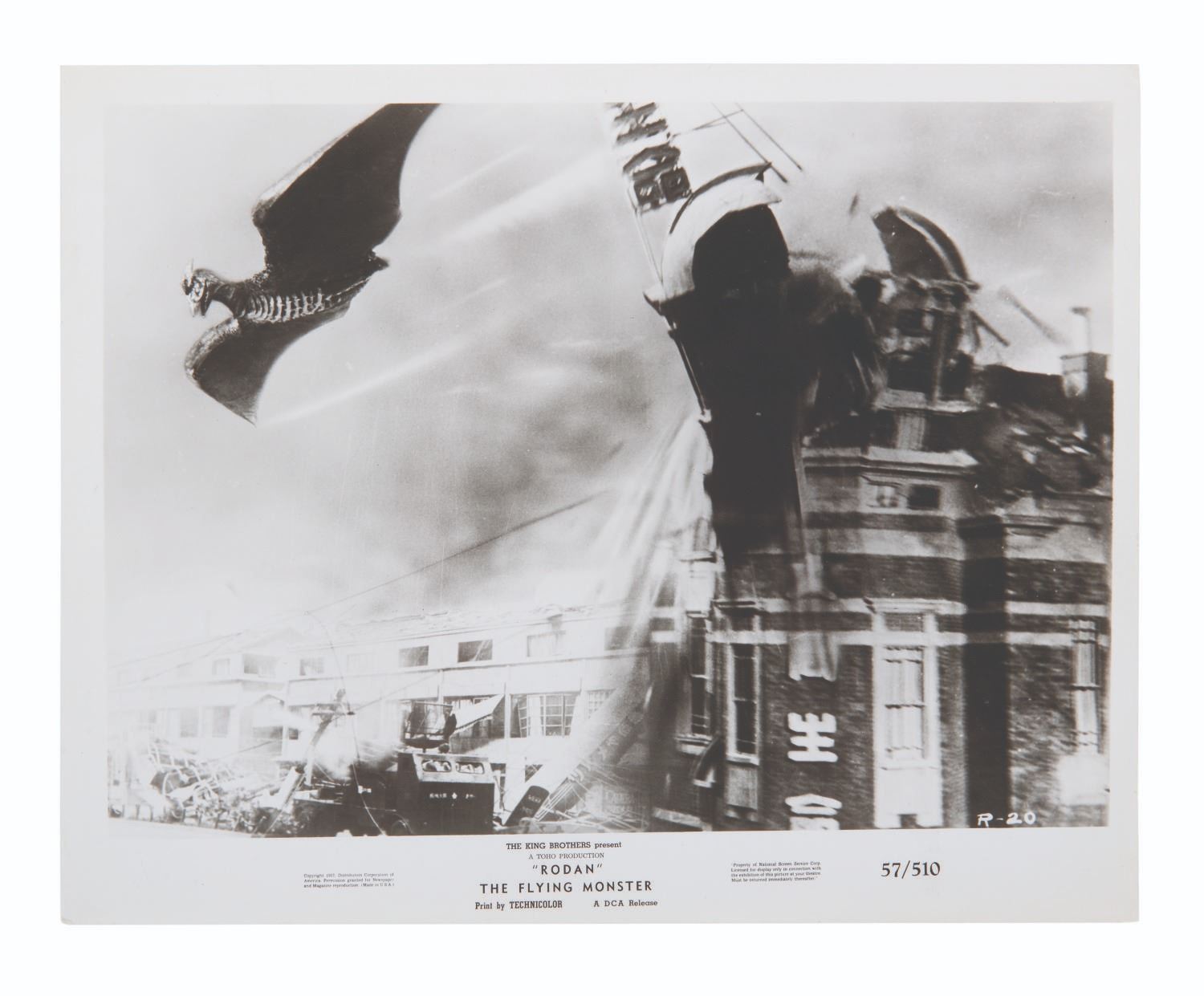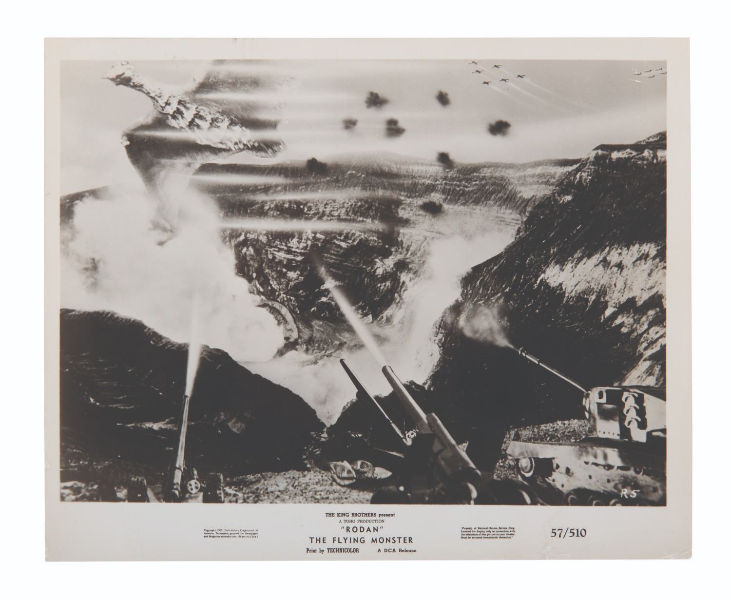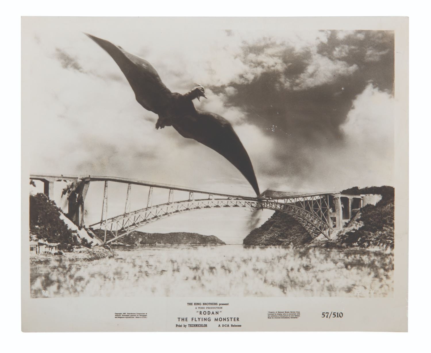 (Toho, 1957) A collection of 12 publicity photos, with two duplicates, for the American release of the Japanese kaiju film"Rodan." Measuring 8" x 10" each, the photos are in fair to good condition with discoloration from age, stains, scratches, creases, folds, writing, edge tears up to 2.25" long, and glue residue on the reverse of two.