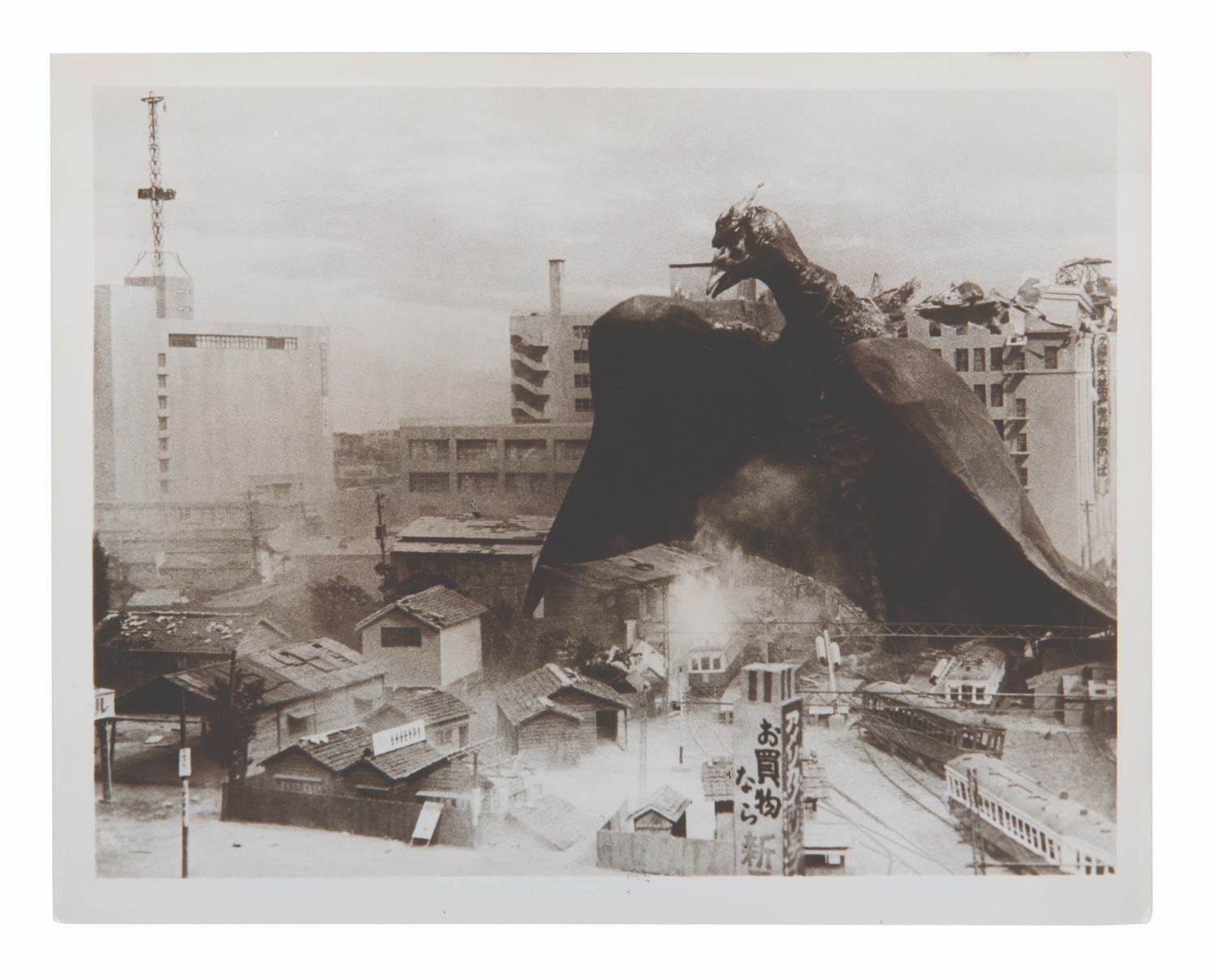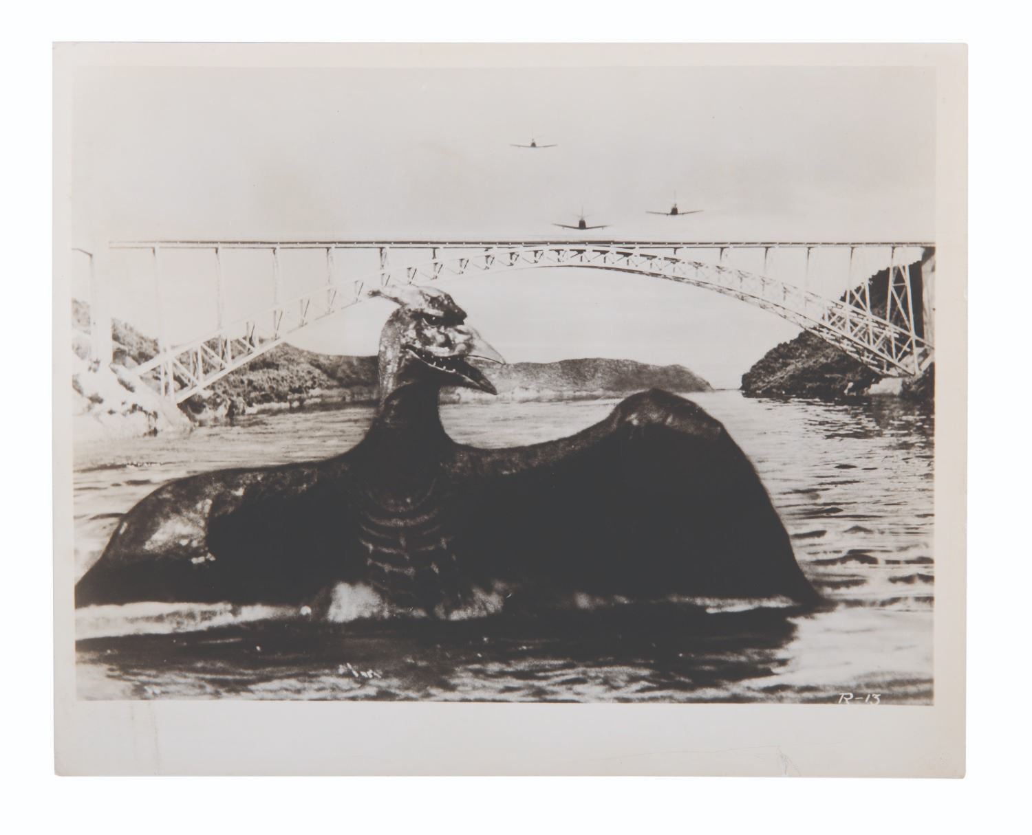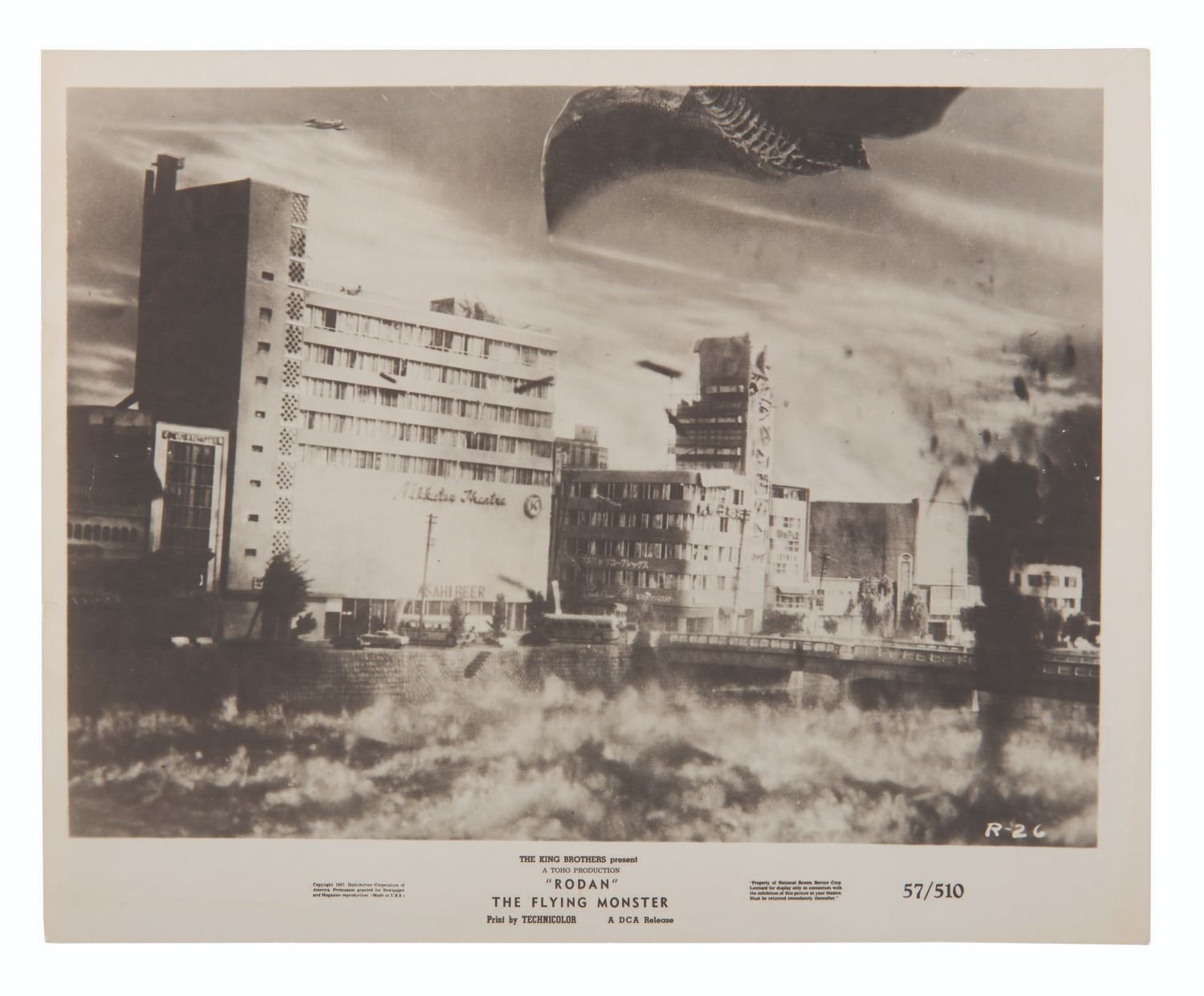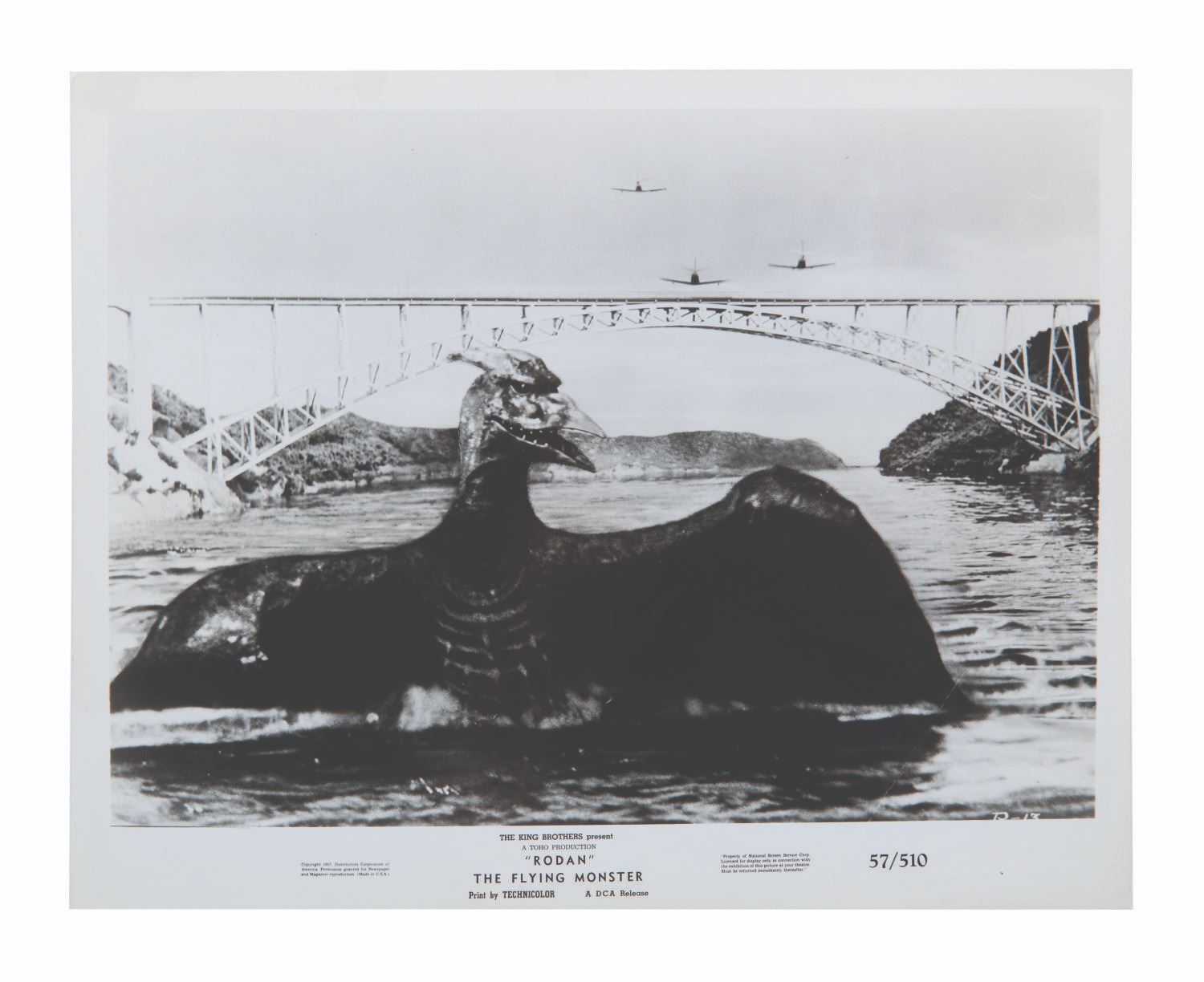 (Toho, 1957) A collection of 12 publicity photos, with two duplicates, for the American release of the Japanese kaiju film"Rodan." Measuring 8" x 10" each, the photos are in fair to good condition with discoloration from age, stains, scratches, creases, folds, writing, edge tears up to 2.25" long, and glue residue on the reverse of two.