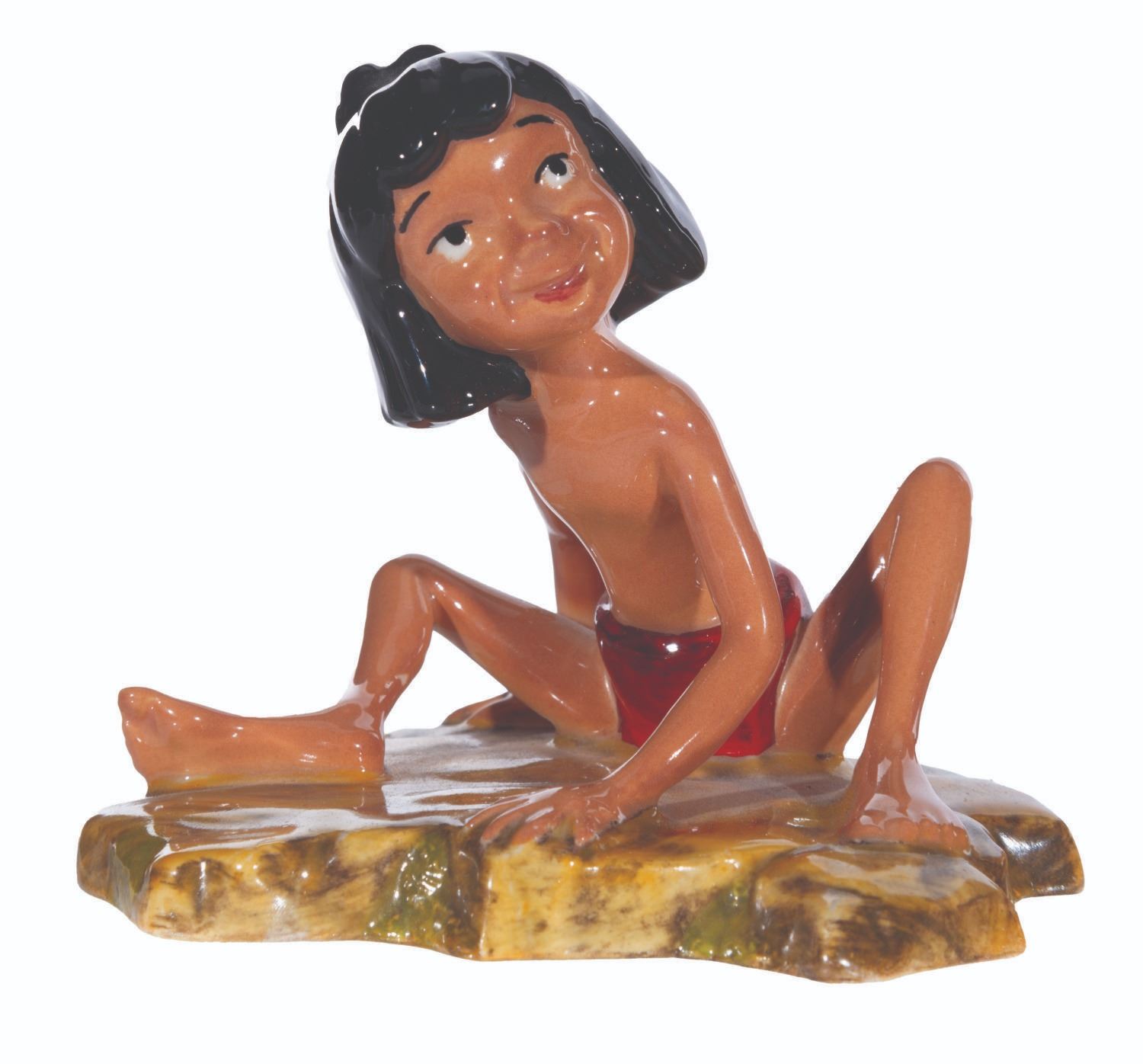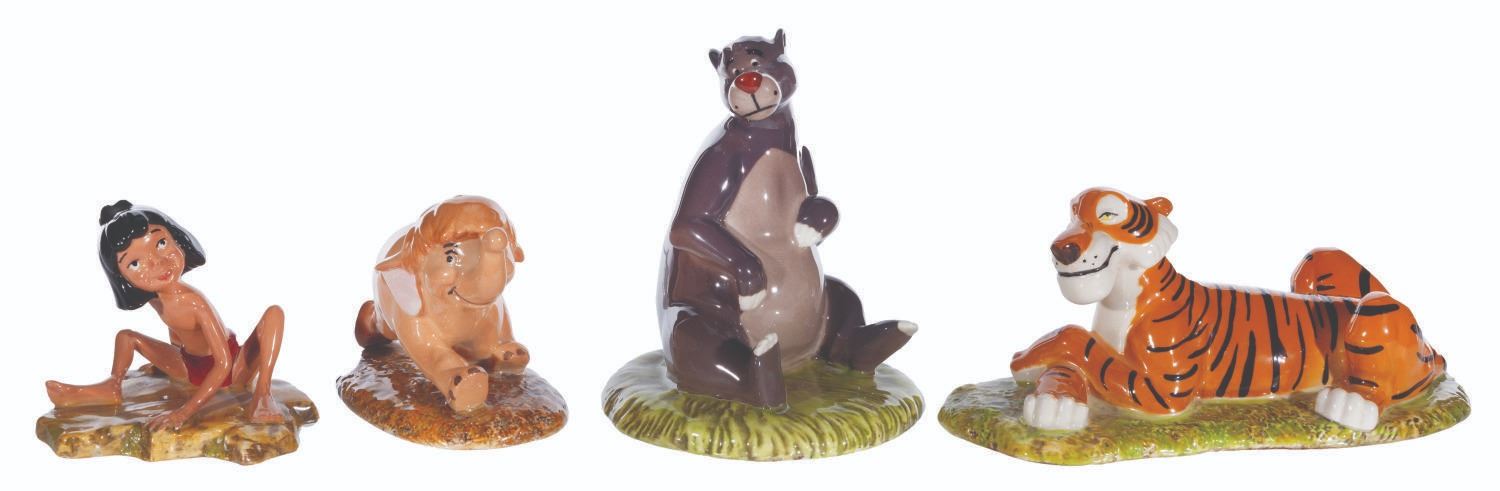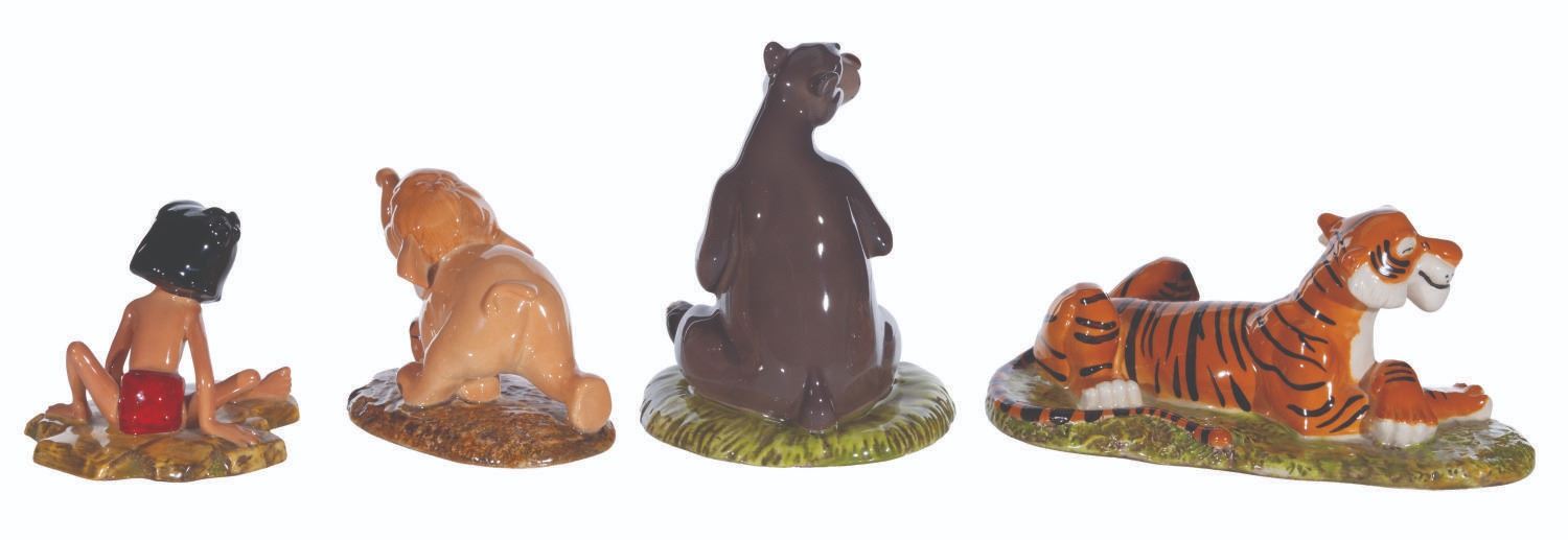 (Royal Doulton, 2000) Four Disney Showcase Collection ceramic figurines of Mowgli, Baloo, Shere Khan, and Hathi Jr. from "The Jungle Book," manufactured by Royal Doulton. Measuring 3.5" to 4.75" tall, the figures are in very good condition with light soiling from display and age.