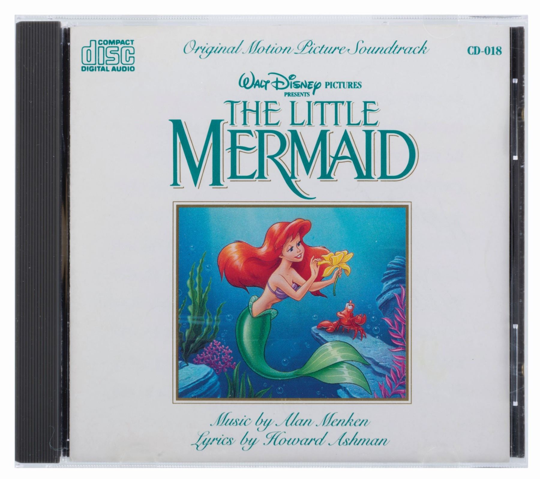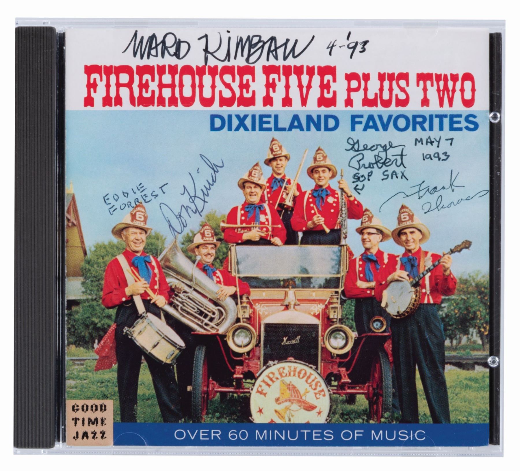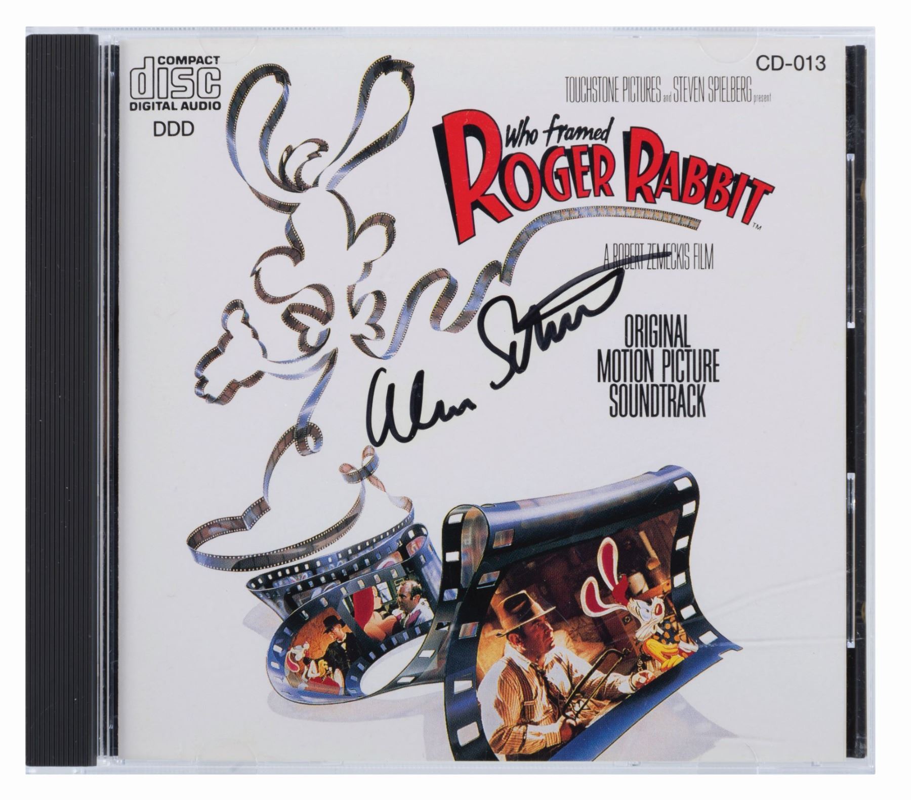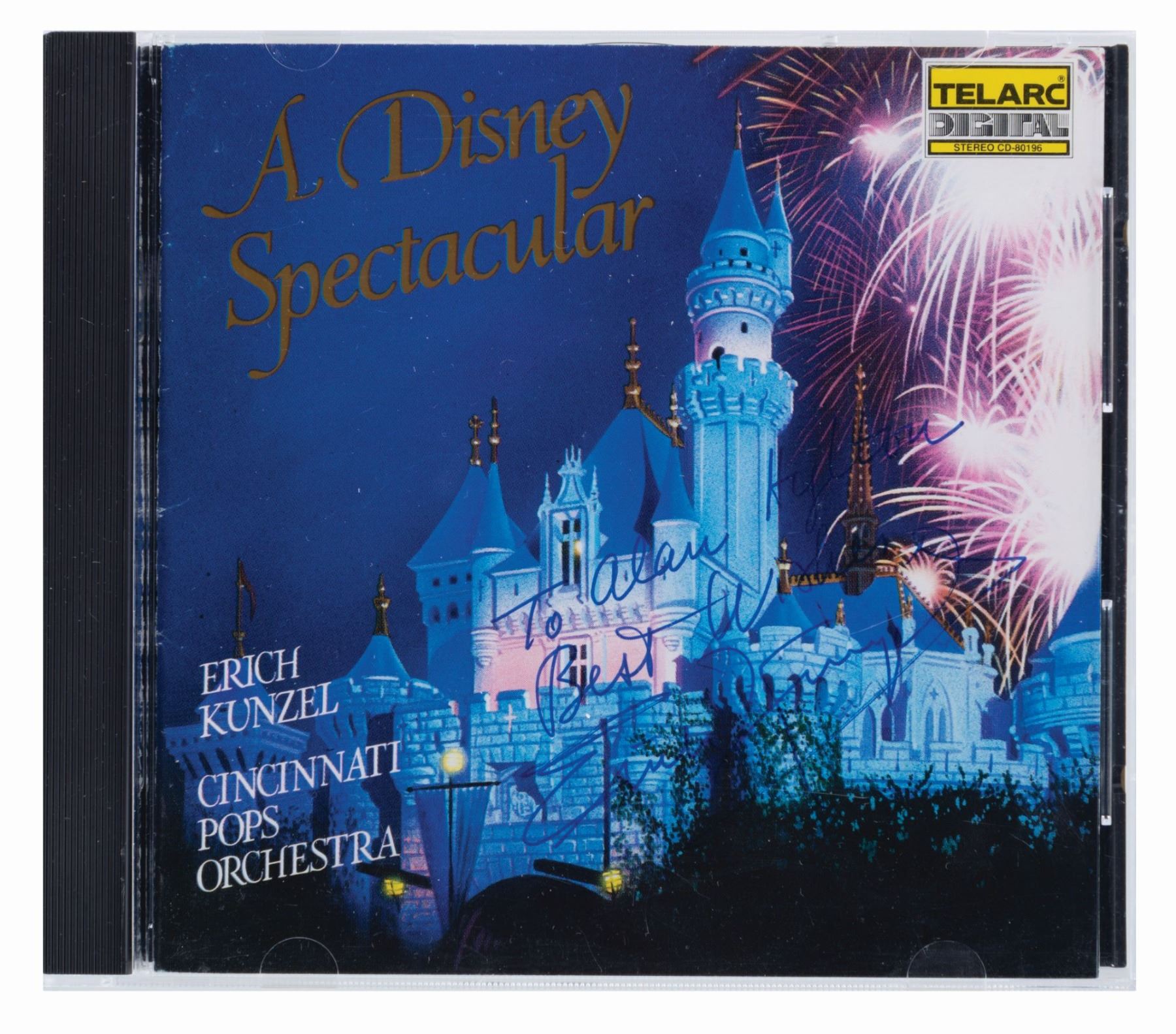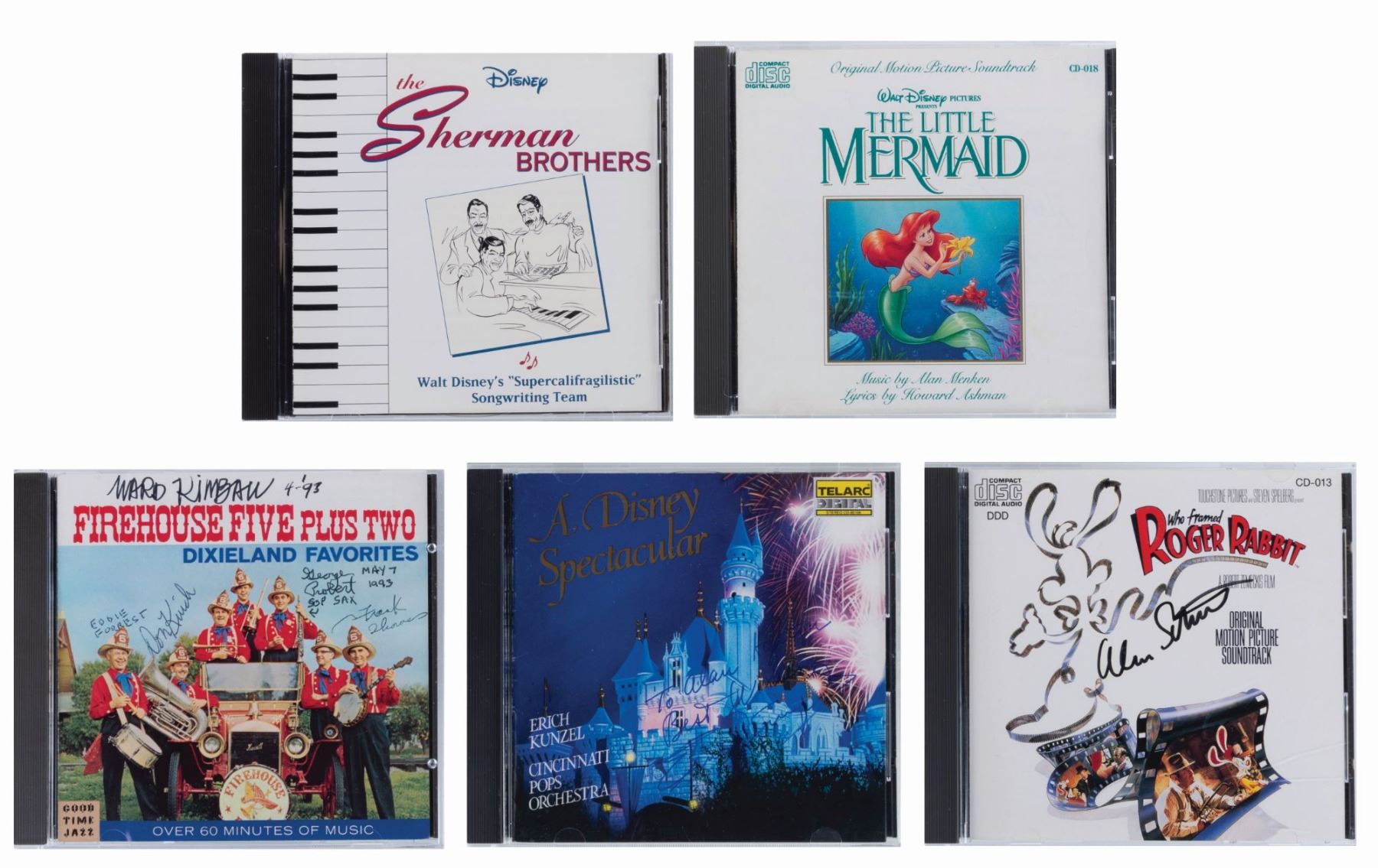 (Disney/Good Time Jazz, 1986-1993) Five Disney music CDs, four of which have inserts signed by the talent. Included are a “Who Framed Roger Rabbit” CD signed by Alan Silvestri, “The Little Mermaid” soundtrack signed by Howard Ashman, Alan Menken, Sherri Stoner, Pat Caroll, and Buddy Hackett, a Disney Spectacular CD signed twice with a dedication by Erich Kunzel, a Firehouse Five Plus Two Dixieland Favourites CD signed by members Ward Kimball, Frank Thomas, George Probert, Don Kinch, and Eddie Forest, and an unsigned The Sherman Brothers CD. Measuring 4.75” in diameter each in their 5” x 5.75” cases, the CDs are in good to very good condition with scratches, smudges, edge wear, cracks in the cases, and creases in the inserts.