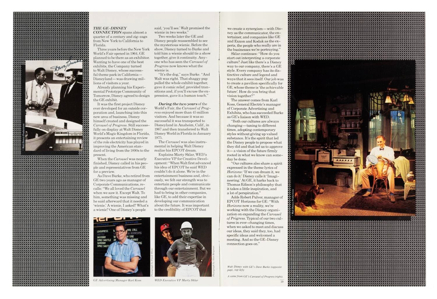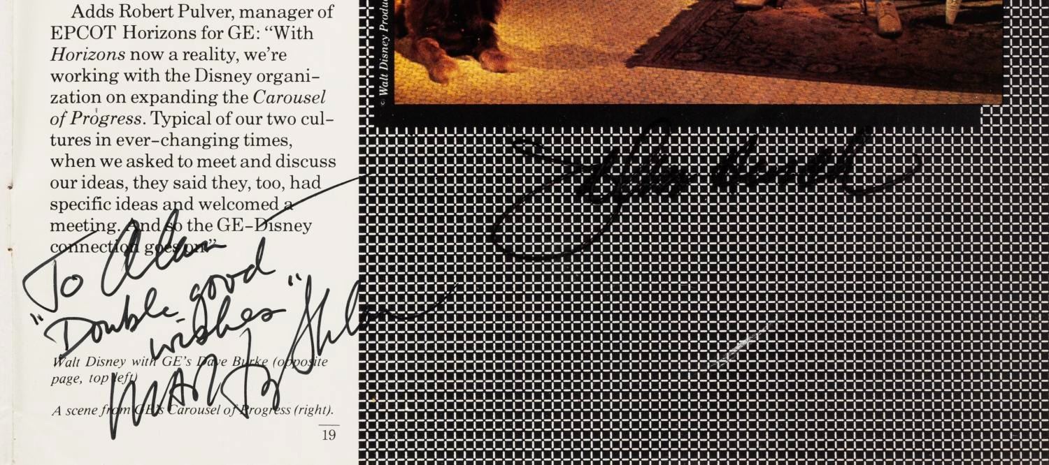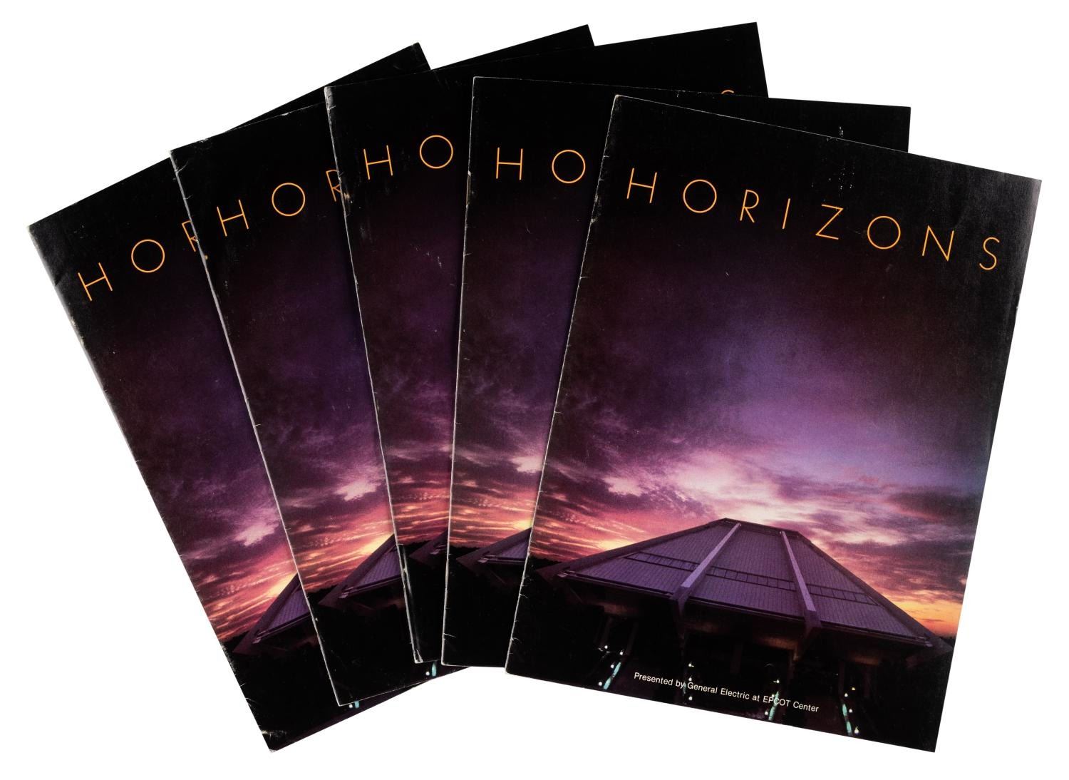 (EPCOT Center, 1983) A collection of five magazines signed by Walt Disney Imagineers, highlighting the new Horizons attraction. Across the five issues are signatures with personalized dedications by Tom Fitzgerald, Marty Sklar, John Hench, Ned Landon (twice), Robert McCall, and Dave Burke. Measuring 8.25” x 11” each, the magazines are in good condition with creases and wear from use.