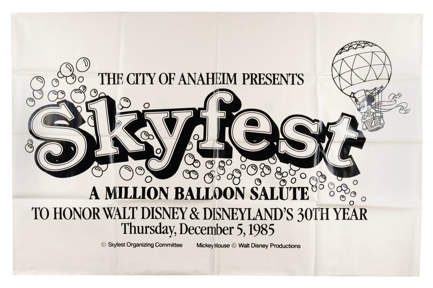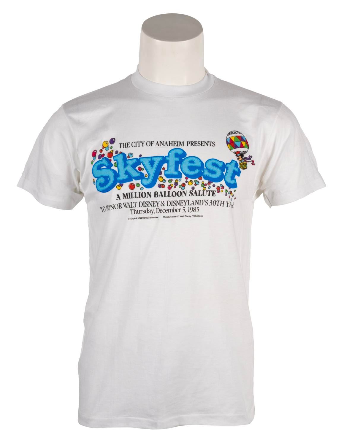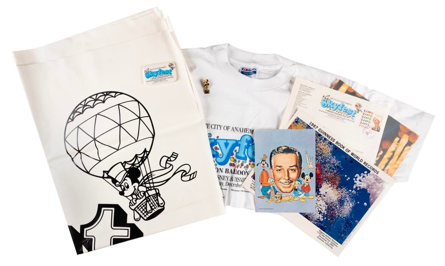 (Disneyland, 1985) A collection of Cast Member souvenirs from "Skyfest," an event celebrating Disneyland's 30th anniversary by releasing a million balloons above Anaheim. Included in this collection is a large T-shirt, a pinback button, a banner, a pin, an invitation letter, a copy of "Disneyland Line" magazine from July 1985, and a postcard. Measuring from 1.25" x 5" to 52" x 33.5", the items are in very good condition with some handling wear to the documents, including folds, creasing and edge wear, the banner has some folds from storage and light scuffing, and the pin is lightly bent with some staining, and the button has some oxidation and scuffing.