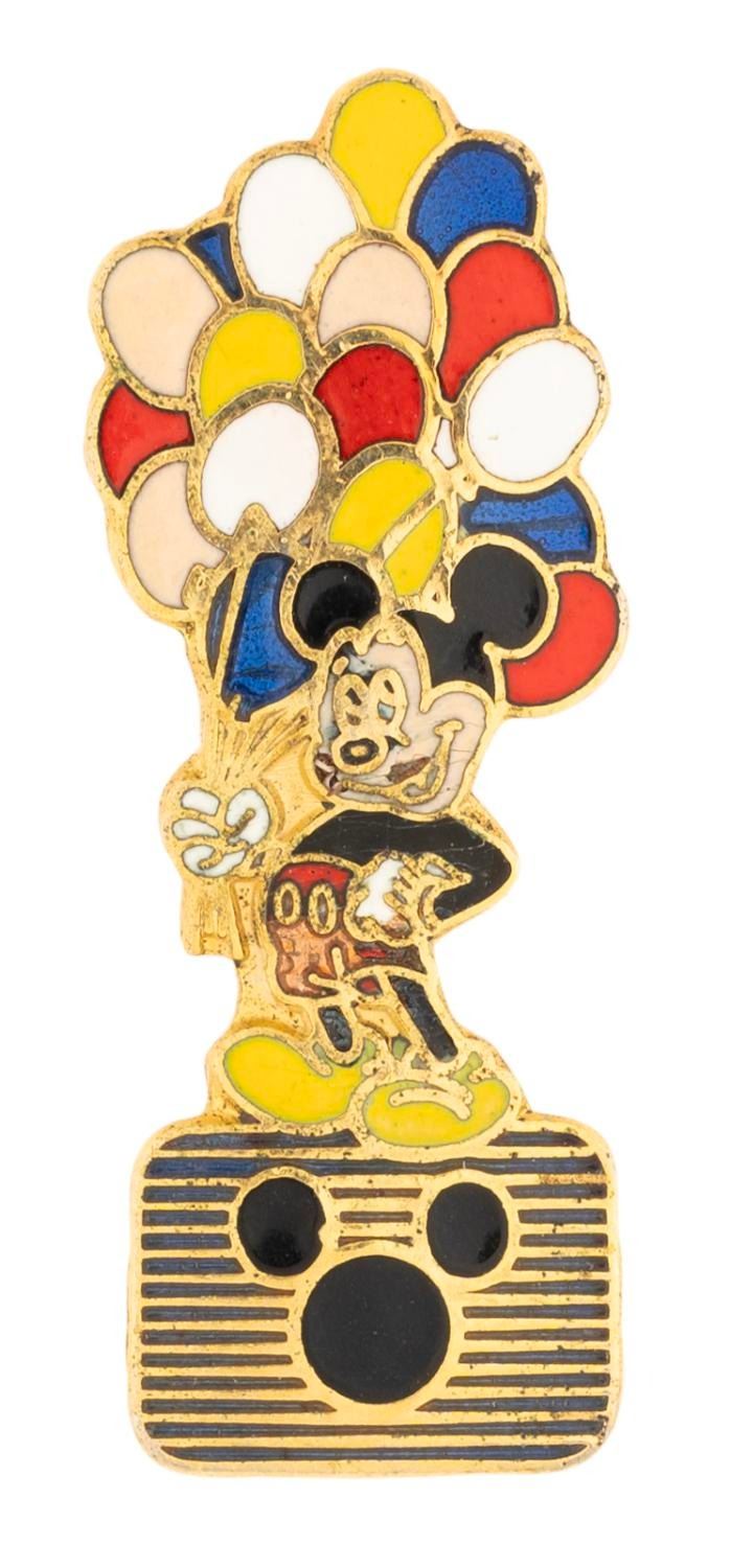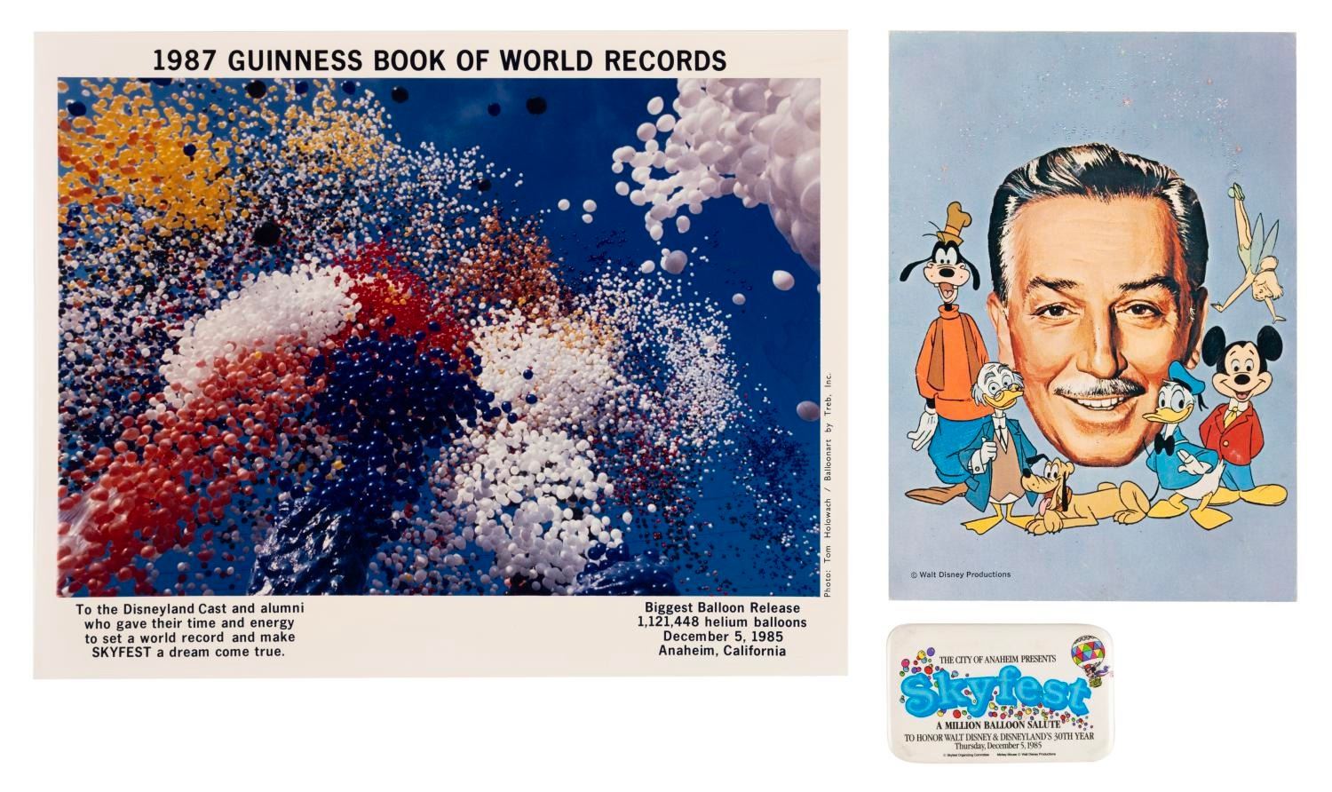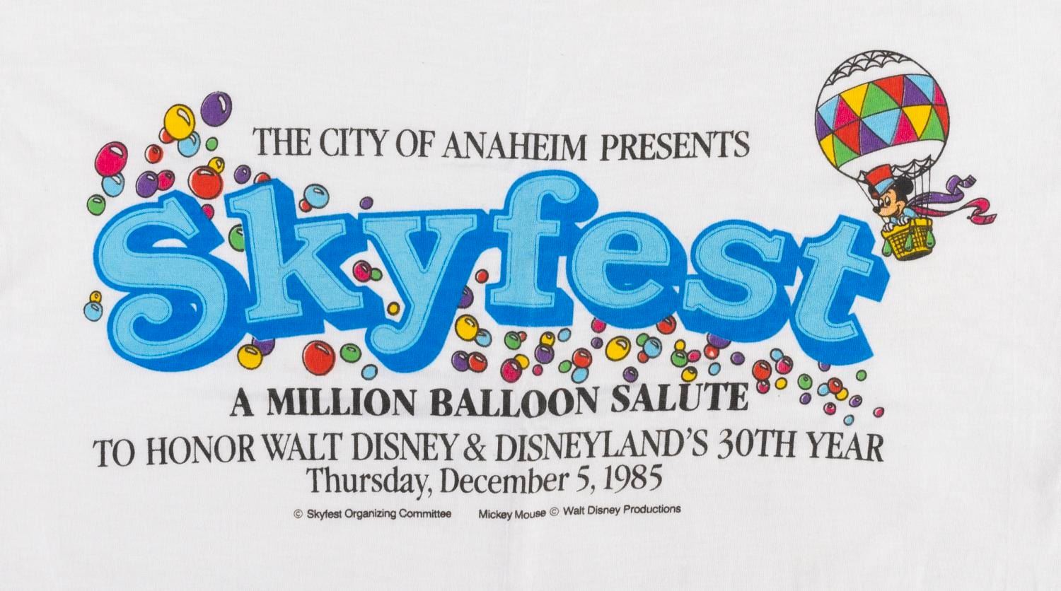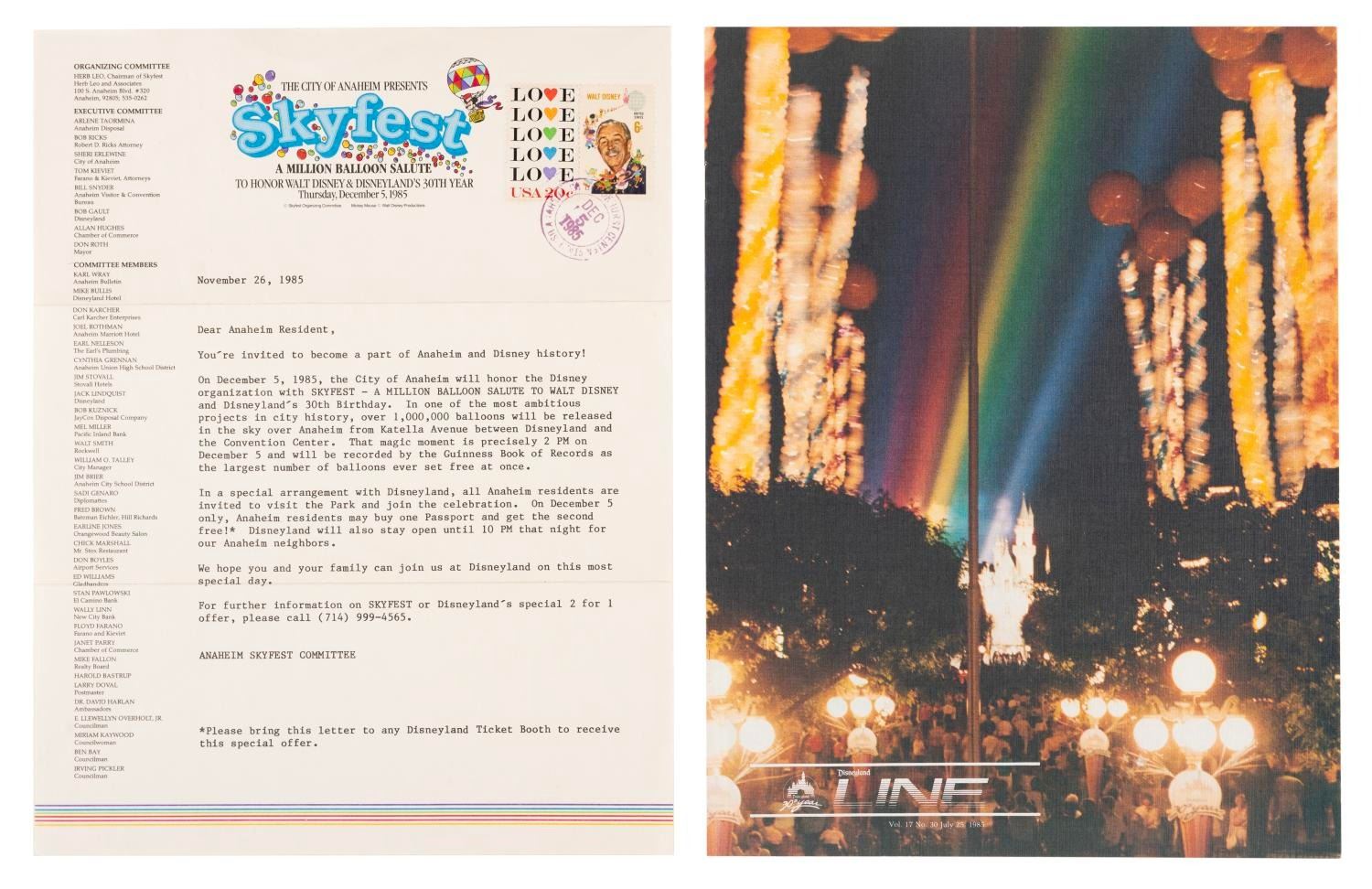 (Disneyland, 1985) A collection of Cast Member souvenirs from "Skyfest," an event celebrating Disneyland's 30th anniversary by releasing a million balloons above Anaheim. Included in this collection is a large T-shirt, a pinback button, a banner, a pin, an invitation letter, a copy of "Disneyland Line" magazine from July 1985, and a postcard. Measuring from 1.25" x 5" to 52" x 33.5", the items are in very good condition with some handling wear to the documents, including folds, creasing and edge wear, the banner has some folds from storage and light scuffing, and the pin is lightly bent with some staining, and the button has some oxidation and scuffing.