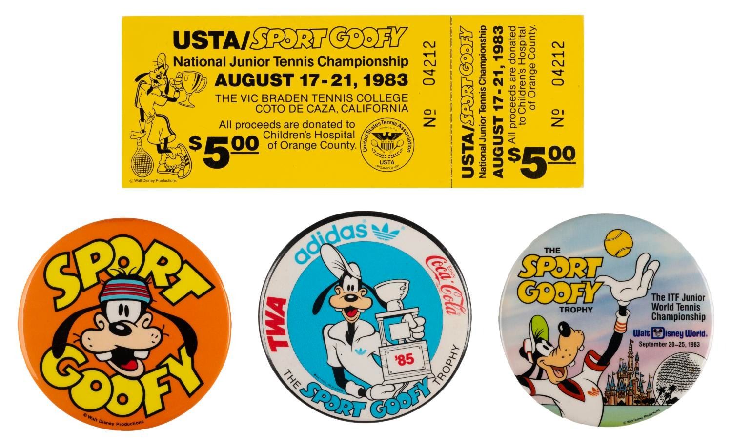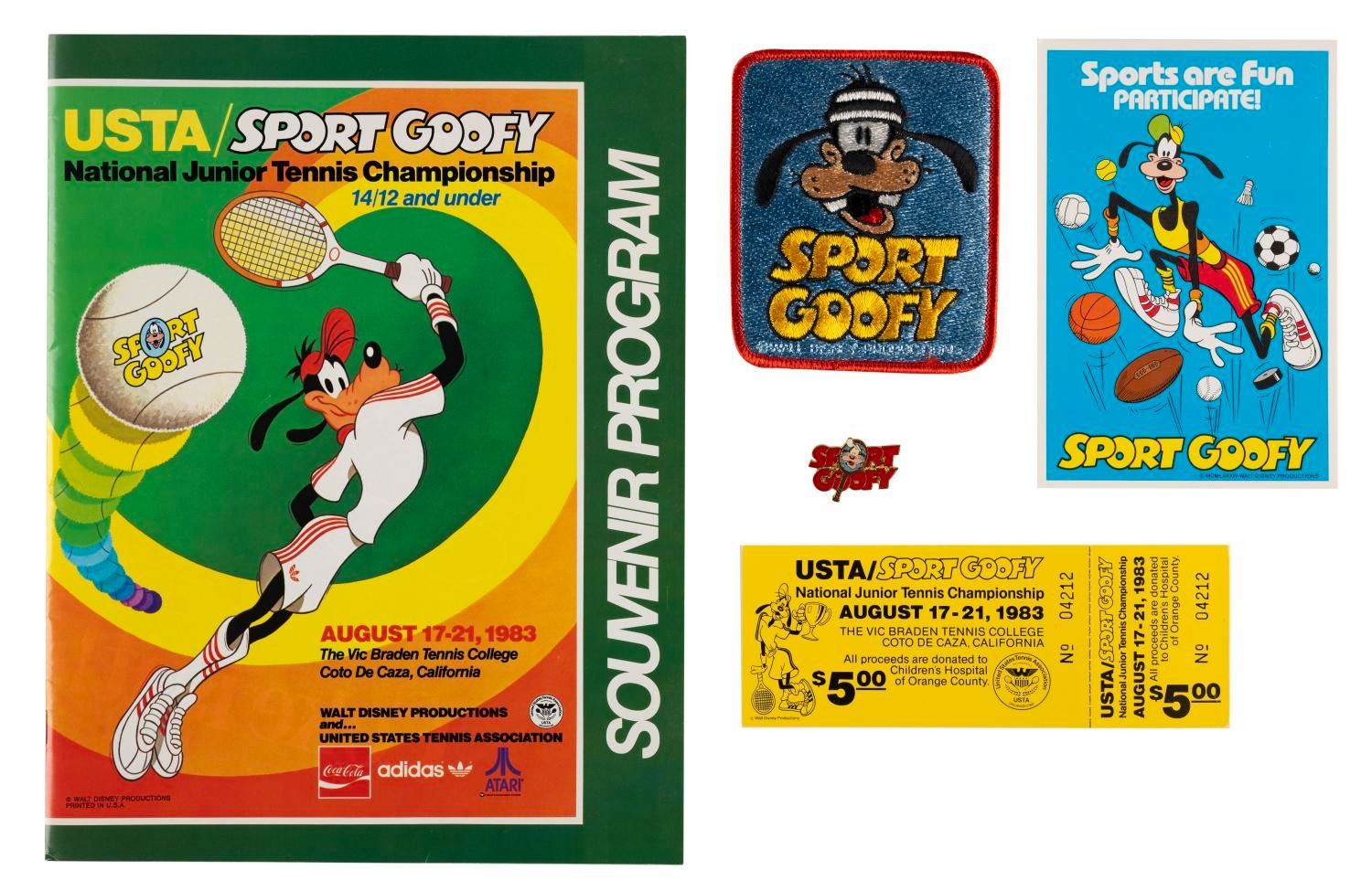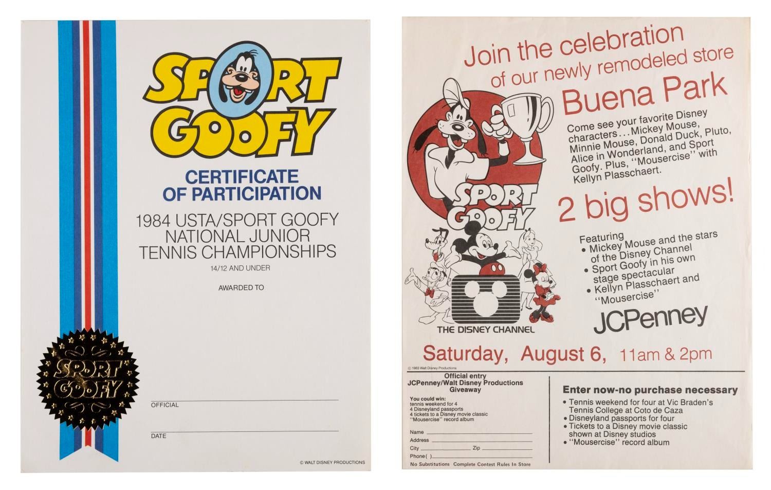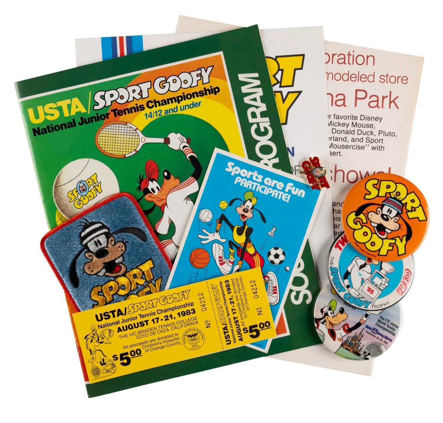 (Disney, 1983-1985) A collection of Sport Goofy items created for the junior tennis championships including a souvenir program, a certificate of participation, three buttons, a patch, a pin, a ticket, a card, and a flyer advertising a chance to win a trip to Buena Park sponsored by Disney and JCPenney. Measuring from 0.75" x 1.25" to 8.5" x 11", these items are in very good condition with some scratches on the buttons and typical handling wear to the program.