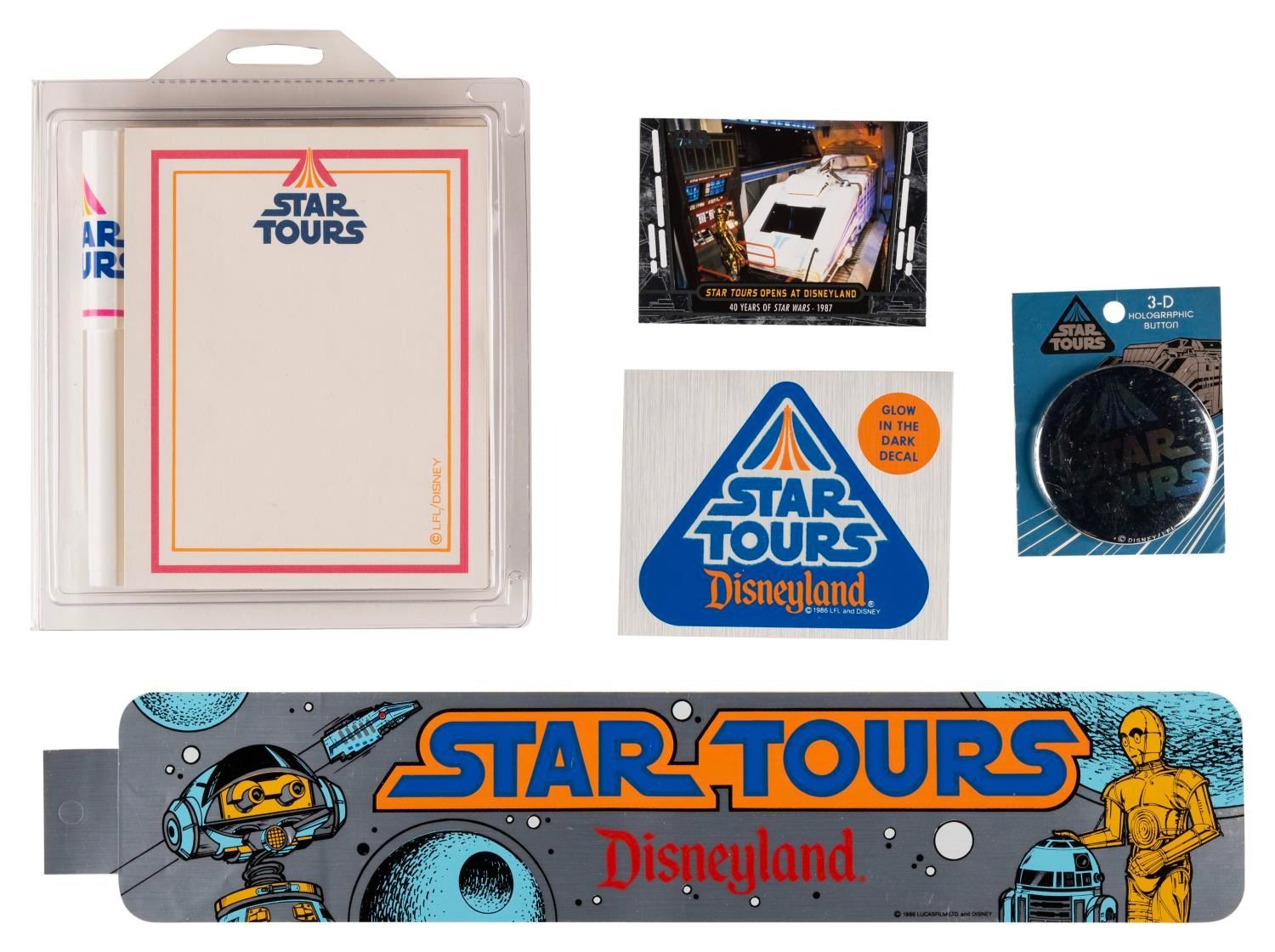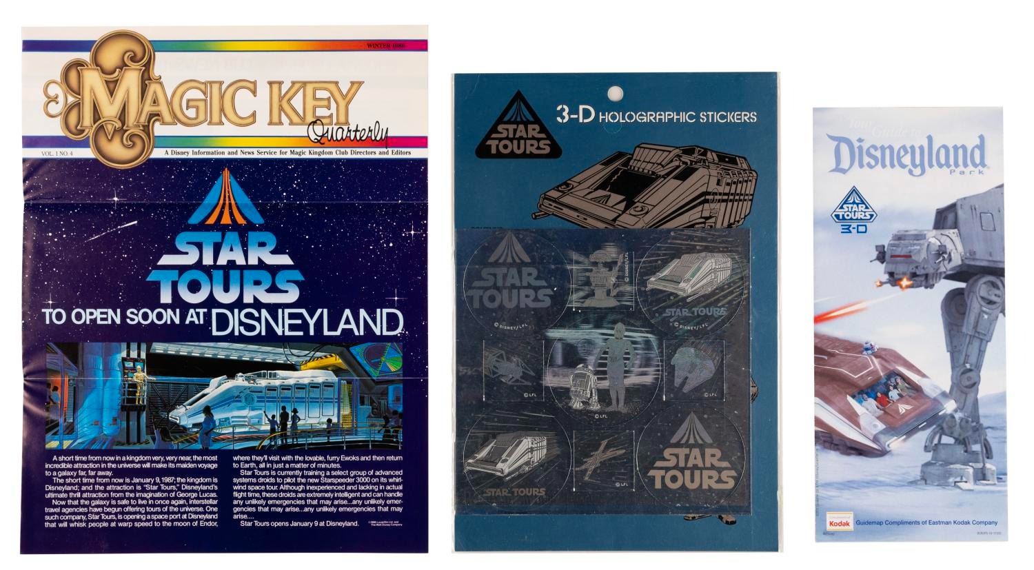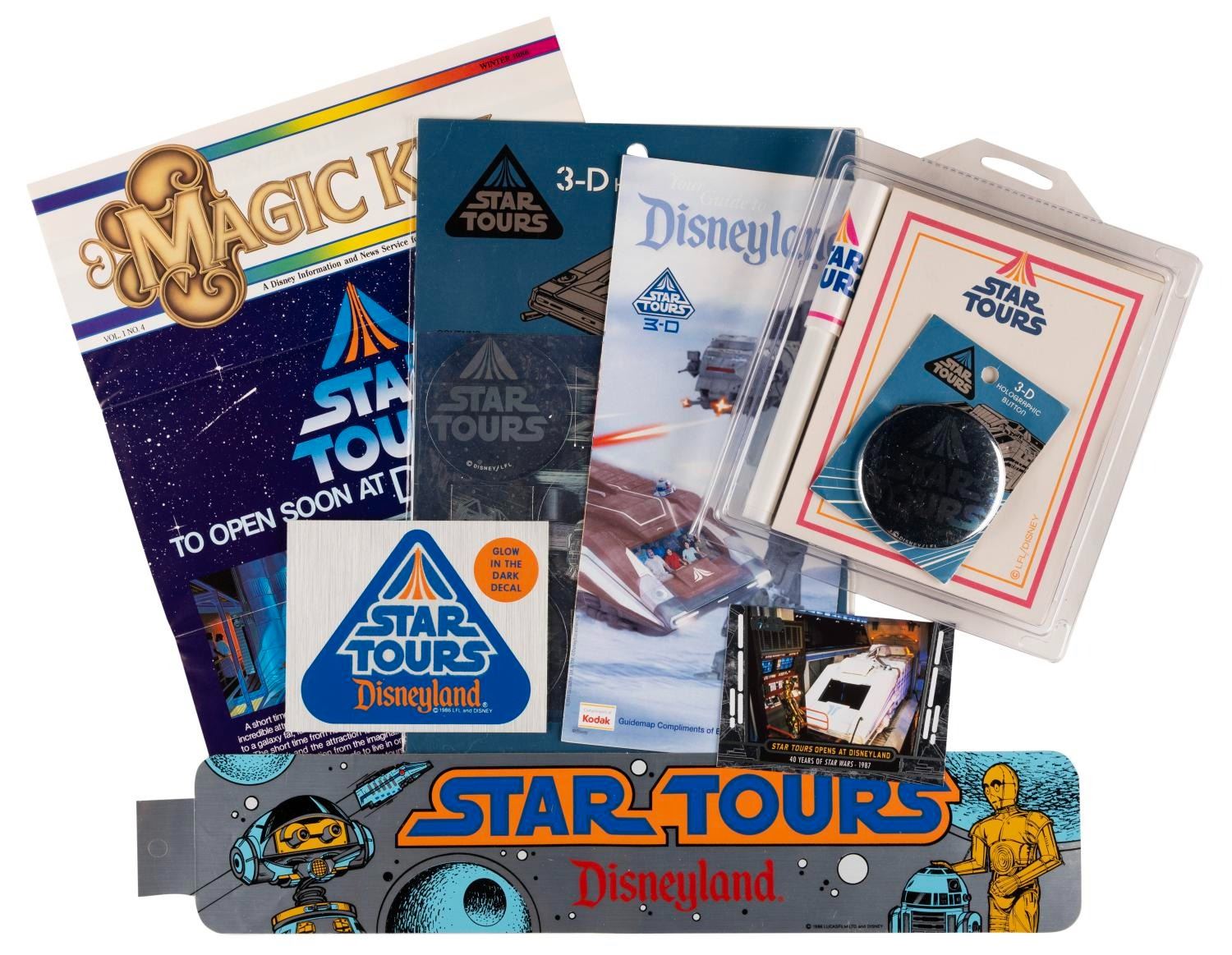 (Disneyland, 1986-2011) A collection of nine Star Tours souvenirs including a holographic button, a notepad, a pen, a bumper sticker, a holographic sticker set, a Park guide, a glow-in-the-dark decal, a trading card, and a Magic Key Quarterly magazine. Measuring from 2.25" in diameter to 8.5" x 11", the souvenirs are in fine to good condition with soft folds and scratches on the bumper sticker, scratches and a crease on the top left corner of the sticker set, light indenting and scratches to the guide and trading card, and edge wear to the magazine from handling.
