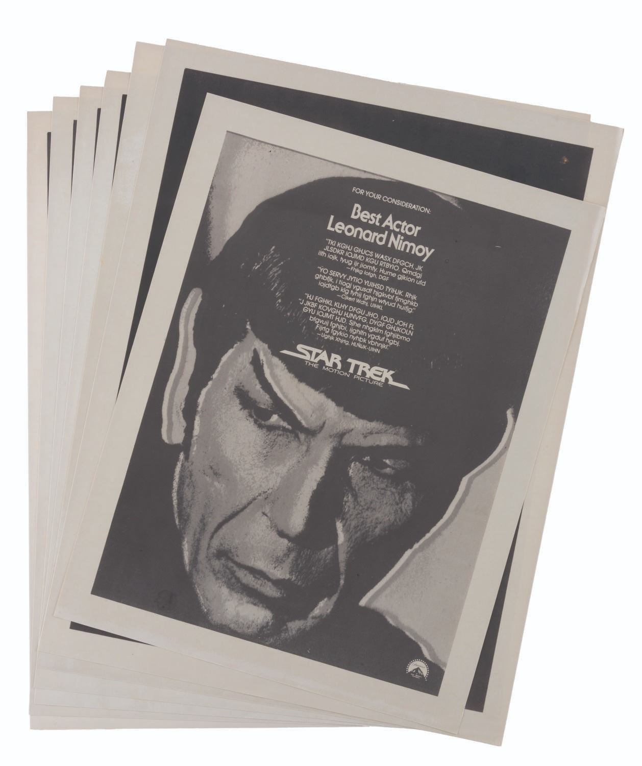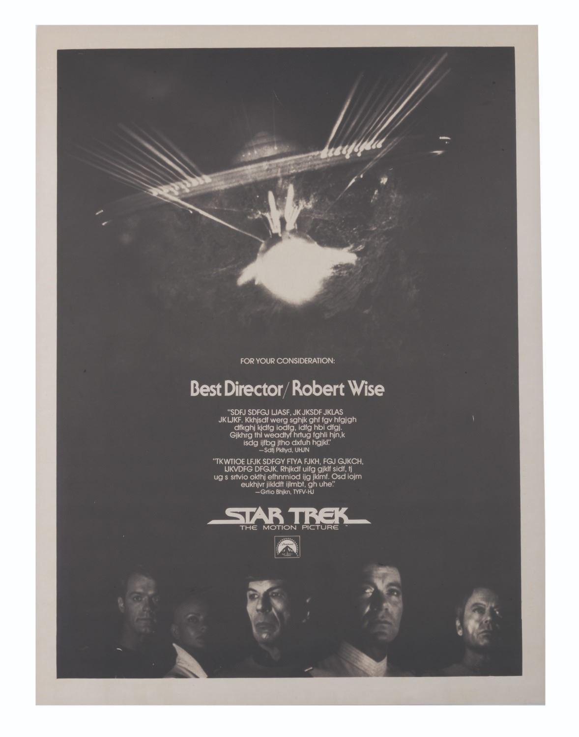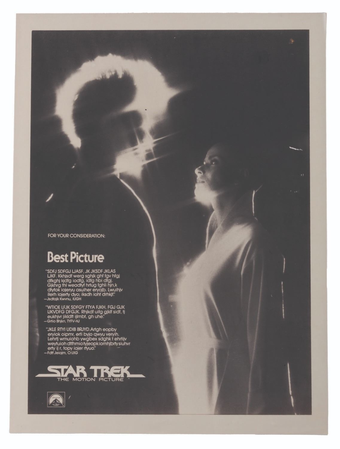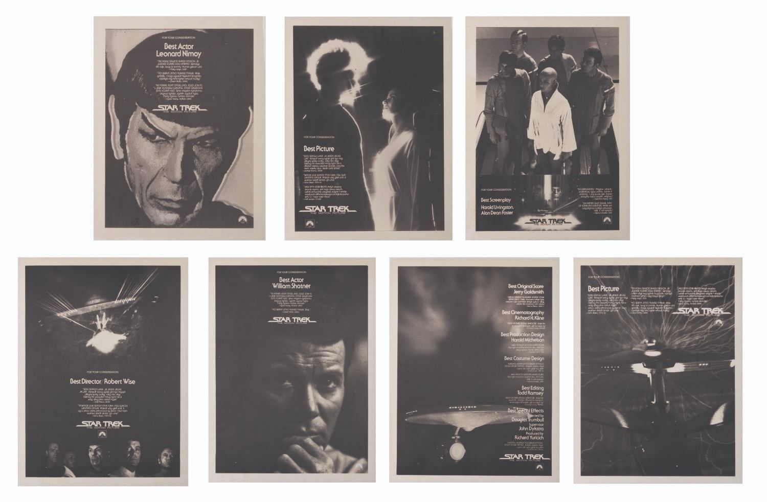 (Paramount, 1979) A collection of seven For Your Consideration ad layouts for"Star Trek: The Motion Picture." The ads have the names of cast and crew members, including Leonard Nimoy and William Shatner, with the suggested nomination and dummy copy underneath. Ranging in size from 10.25" x 13.25" to 11.5" x 15.5", the prints are in good condition with creases, spots of discoloration, soiling on the Best Screenplay ad, and wear from production use.