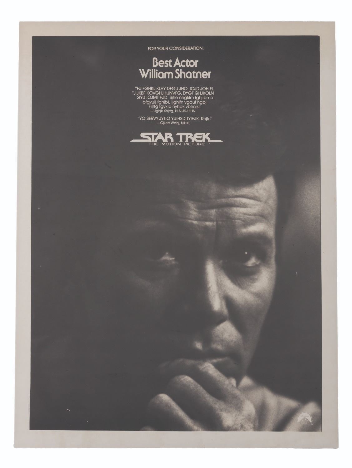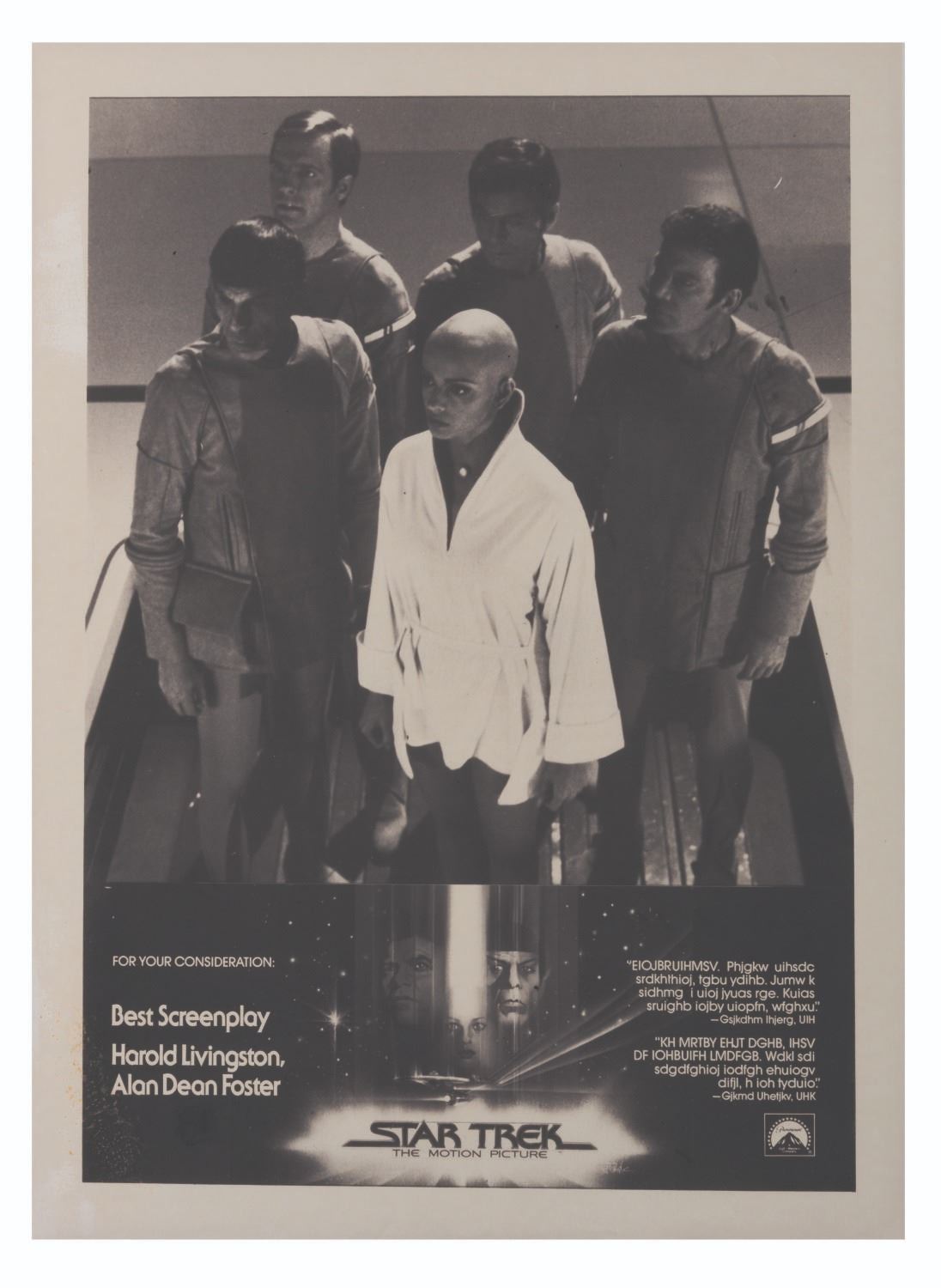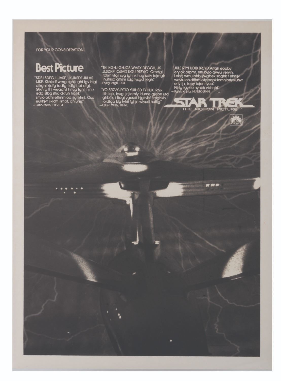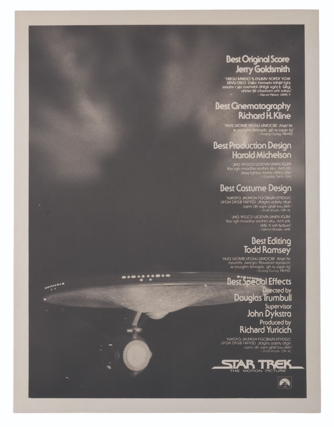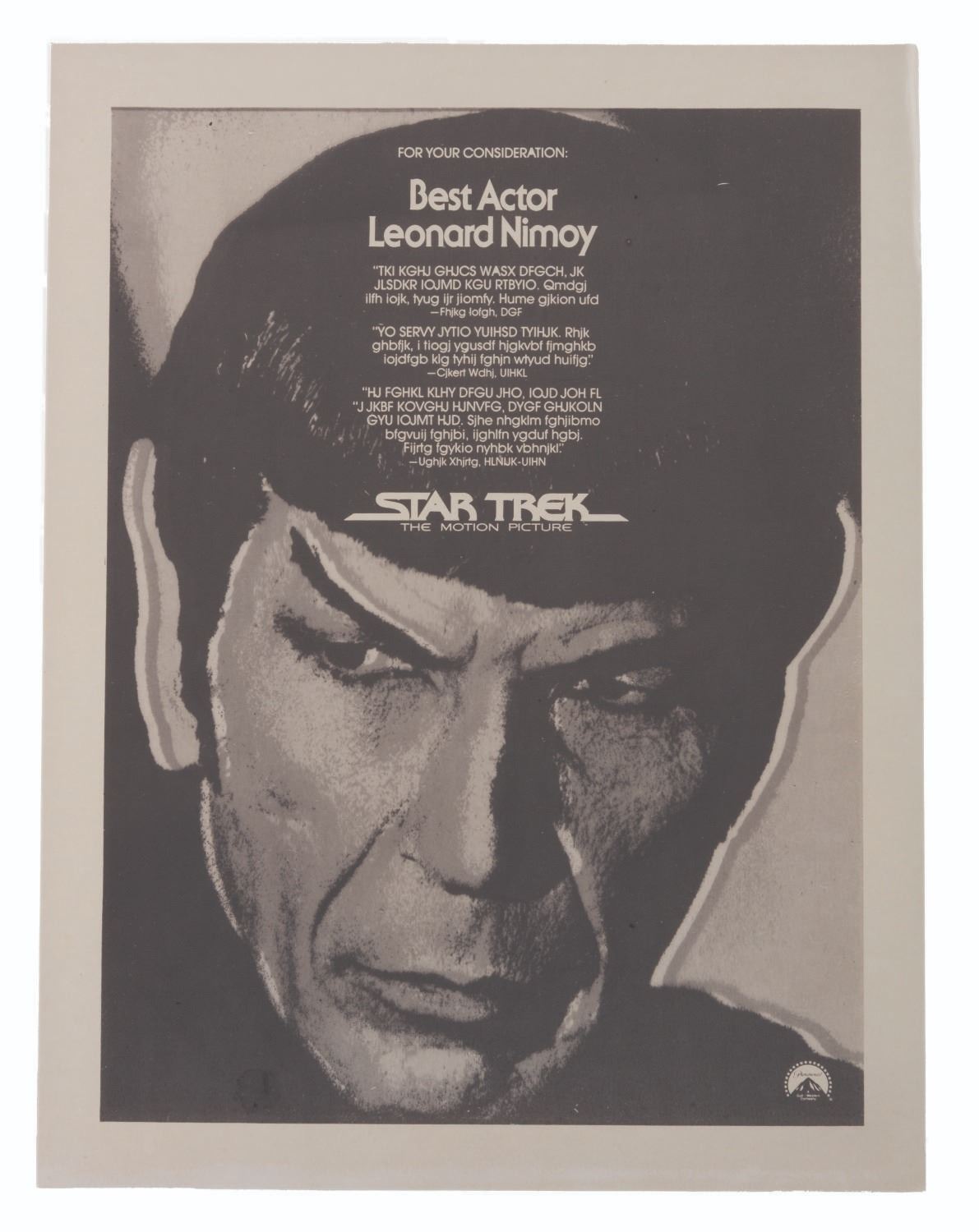 (Paramount, 1979) A collection of seven For Your Consideration ad layouts for"Star Trek: The Motion Picture." The ads have the names of cast and crew members, including Leonard Nimoy and William Shatner, with the suggested nomination and dummy copy underneath. Ranging in size from 10.25" x 13.25" to 11.5" x 15.5", the prints are in good condition with creases, spots of discoloration, soiling on the Best Screenplay ad, and wear from production use.