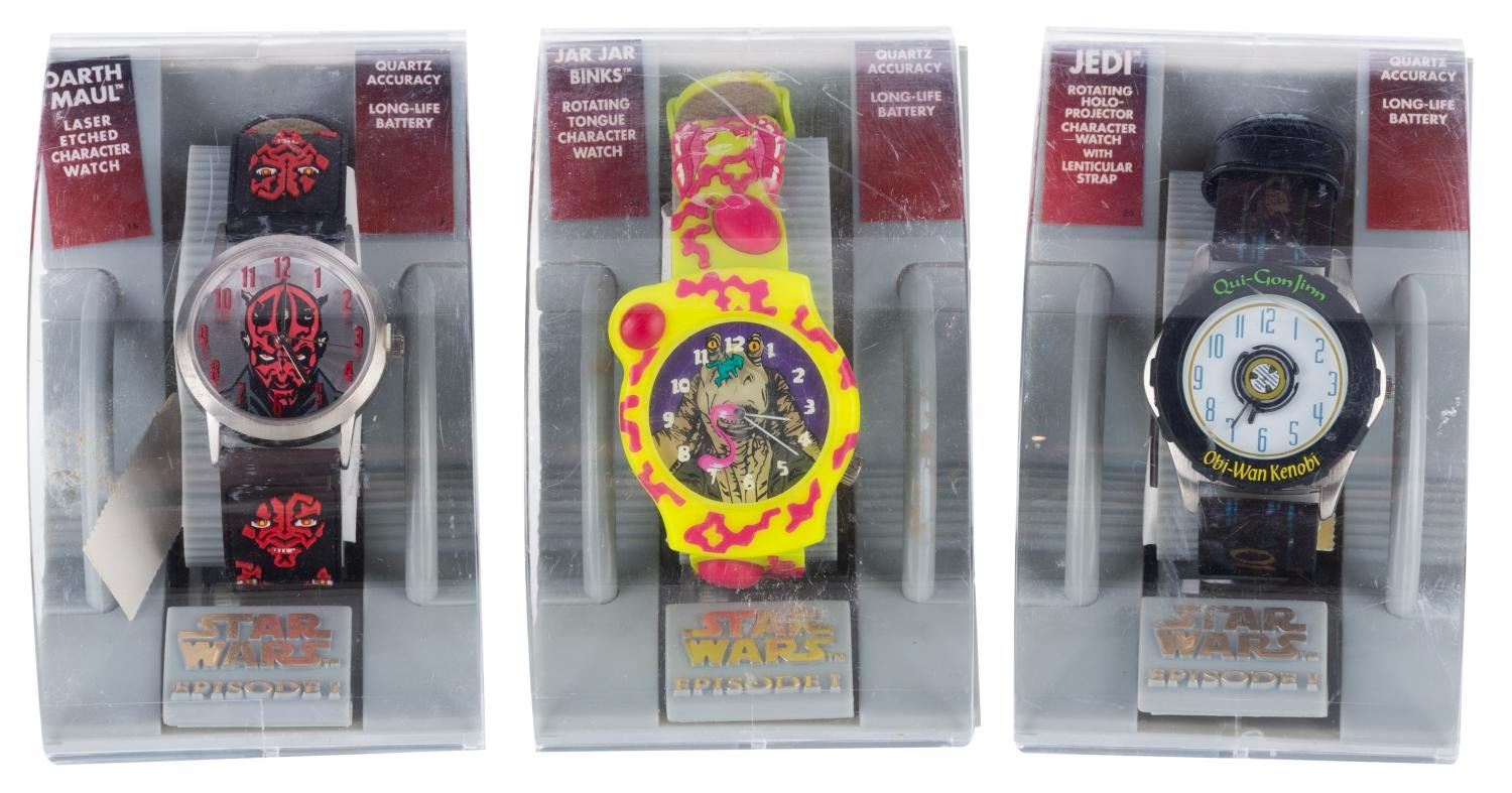 (Nelsonic, 1999) A collection of three unique “Star Wars: Episode I” watches. Included are a laser-etched Darth Maul watch, a Qui-Gon and Obi-Wan watch with a lenticular strap, and a striking Jar Jar Binks watch with a rotating tongue for the second hand. The watches are in fine unused condition, requiring batteries and possibly service to function. The original cases are in good condition with several scratches and scuffs.