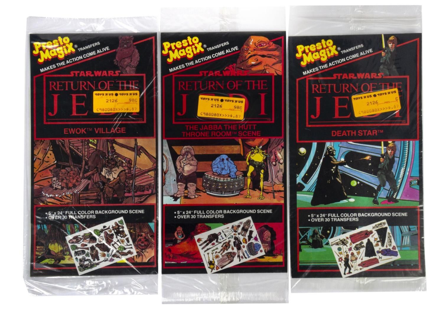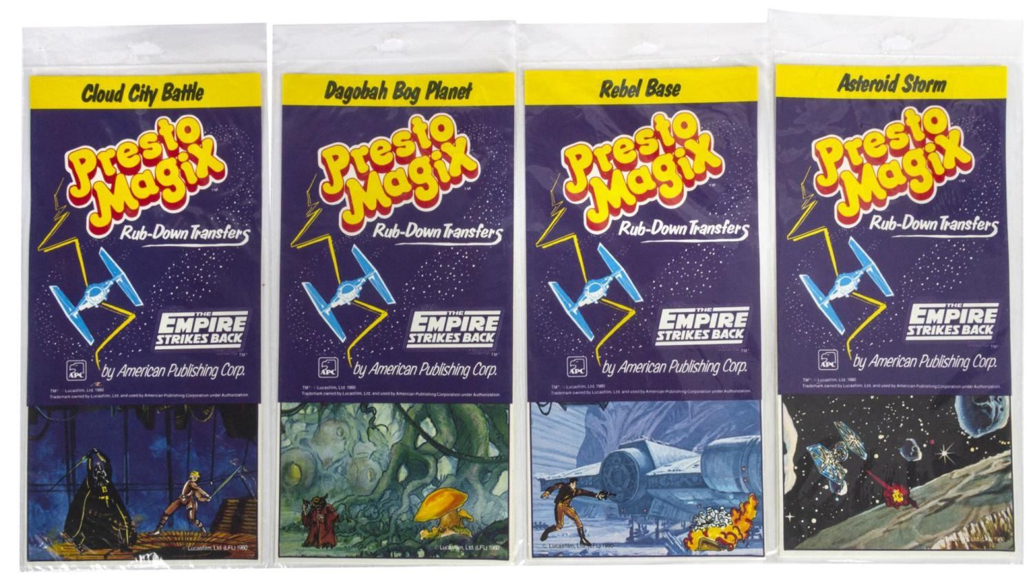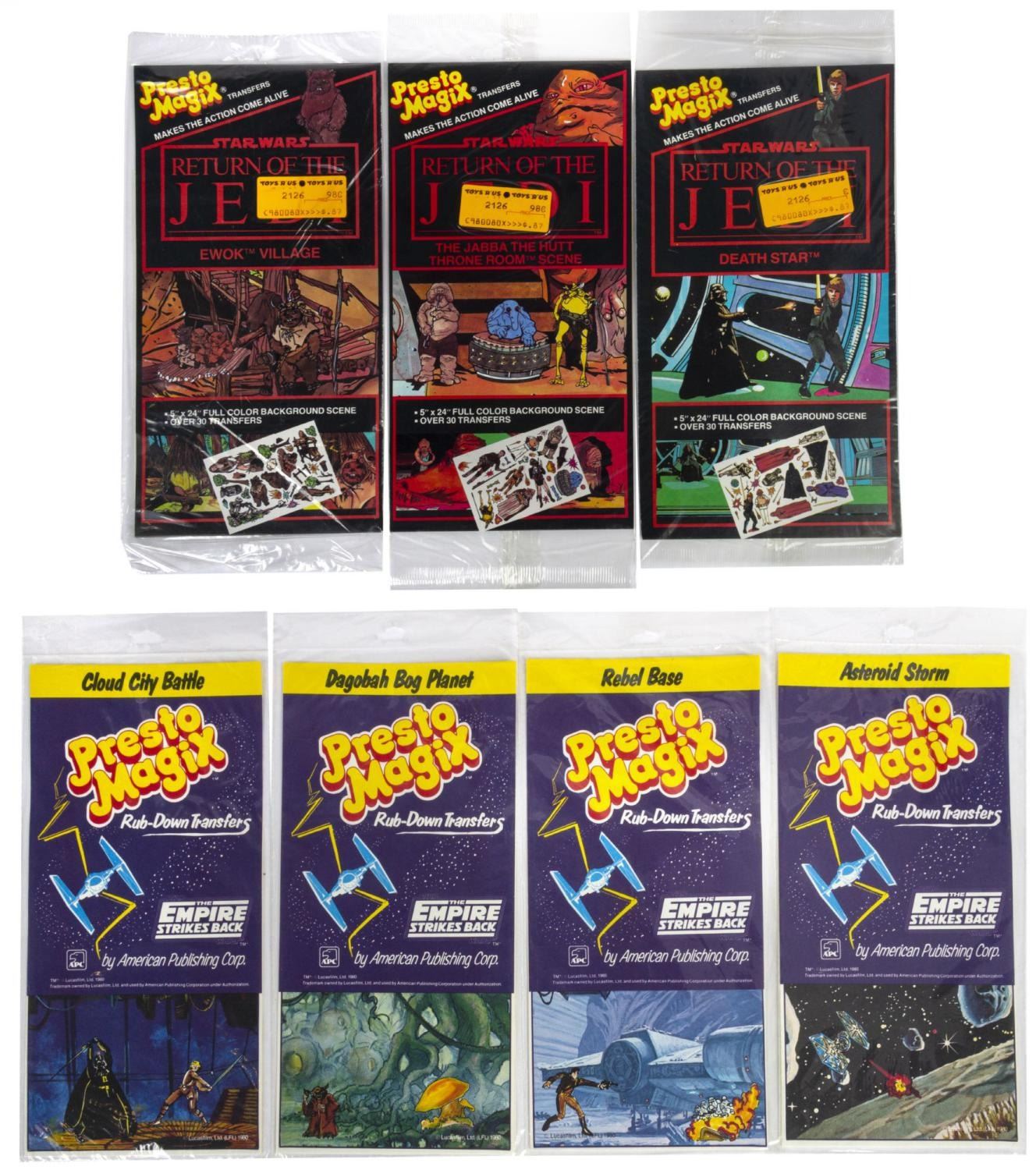 (APC, 1980/83) A collection of seven Star Wars rub-down transfer sets, including 4 from "The Empire Strikes Back" and 3 from "Return of the Jedi,” all sealed in their original packages. Each measuring 11.5" x 4.75", they are in fine condition.