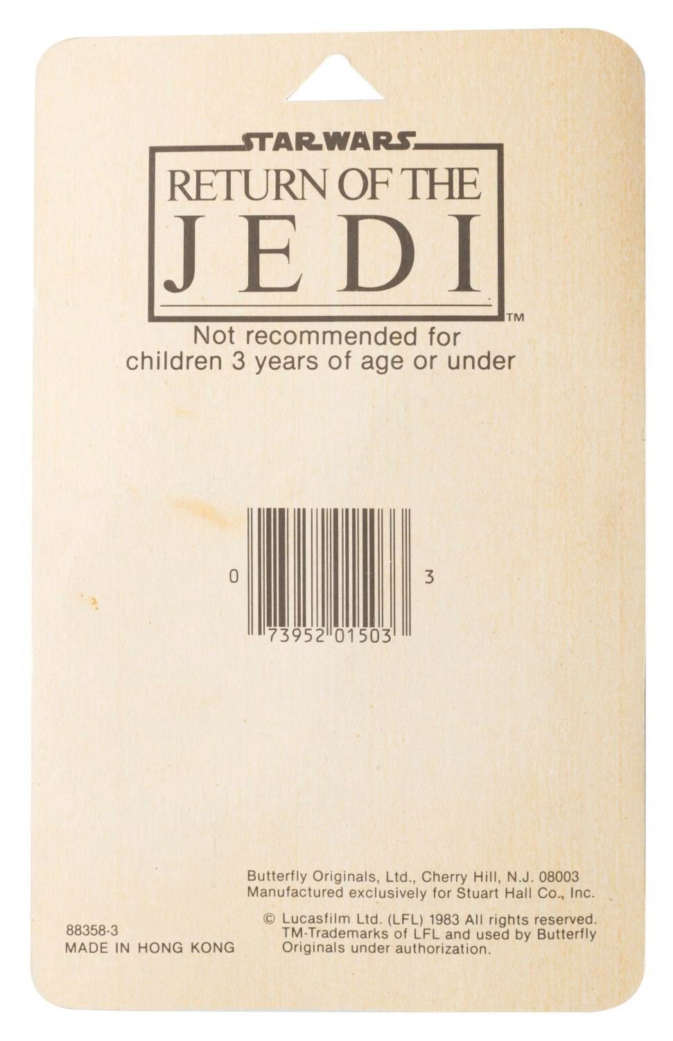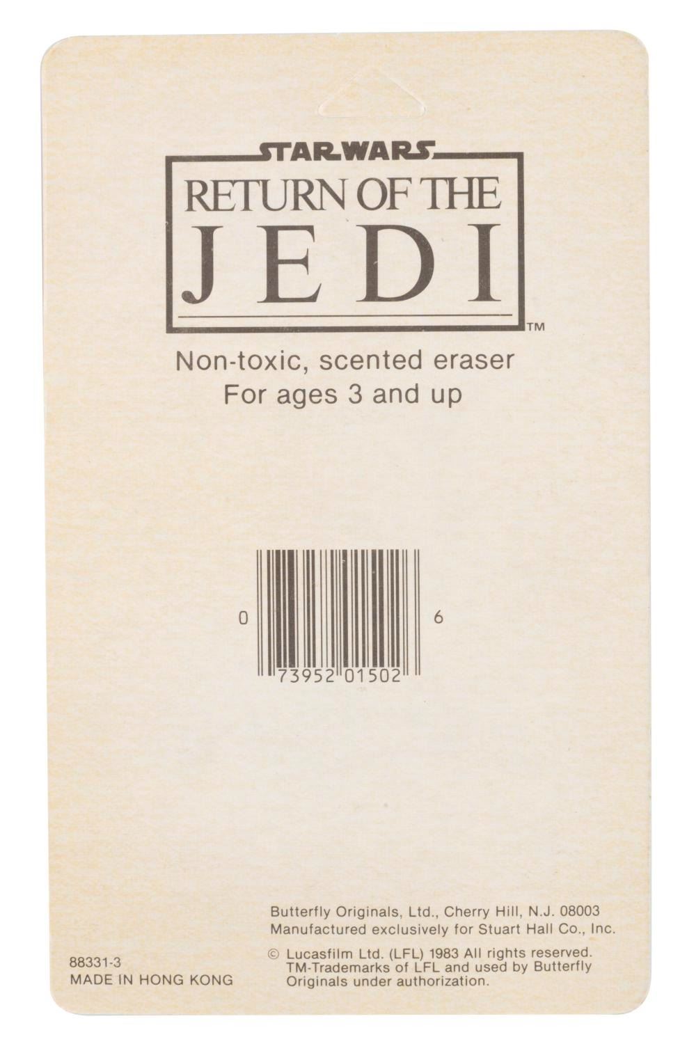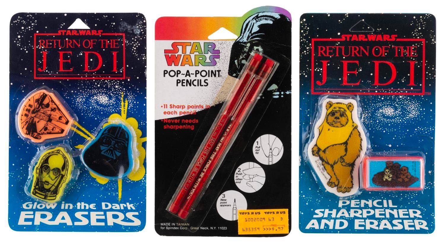 (Butterfly Originals, 1983) A collection of three carded "Return of the Jedi” school supplies including including four erasers - three of which glow in the dark - a pencil sharpener, and two "pop-a-point” pencils. The school supplies are in presumed fine condition, sealed on the original very good condition cards.