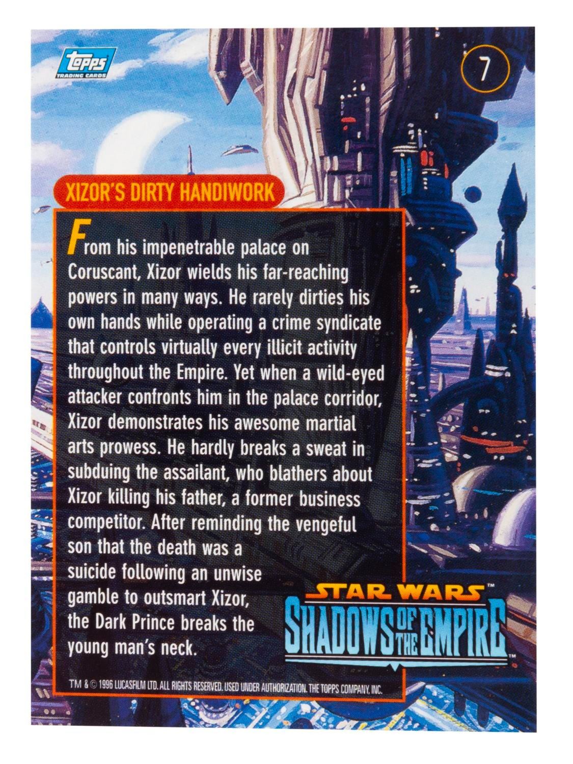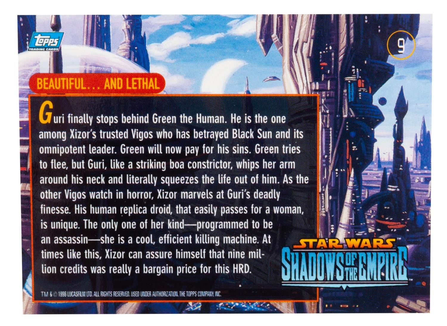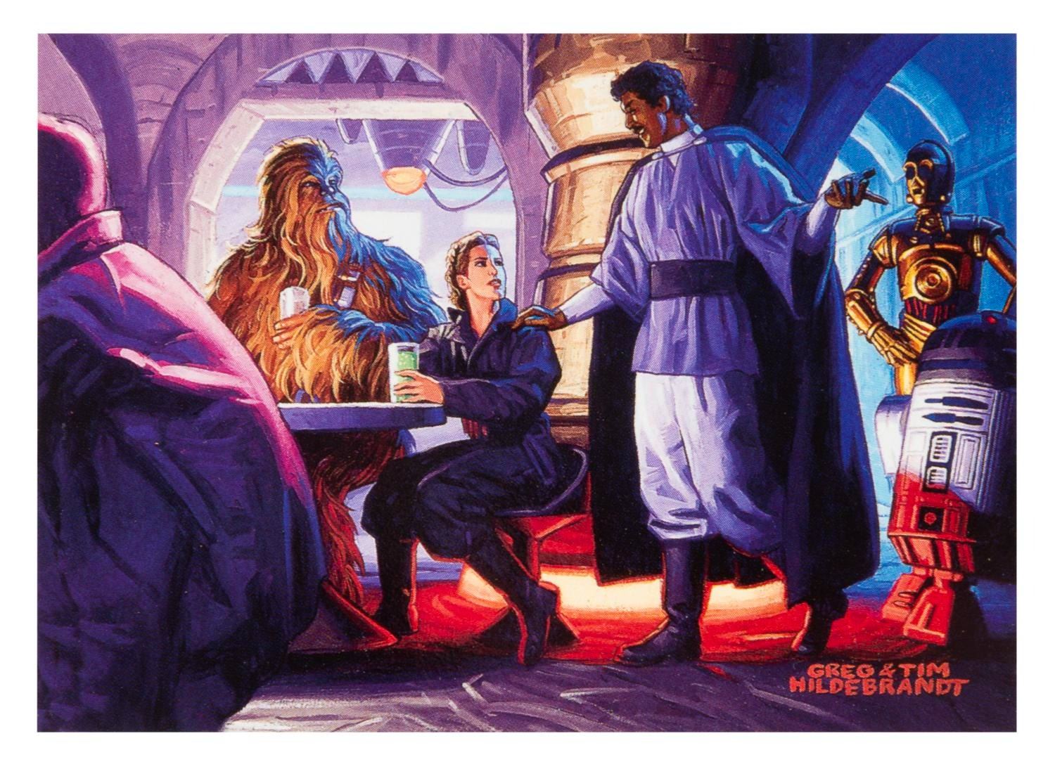 (Topps, 1996) A complete standard set of 90 Star Wars: Shadows of the Empire trading cards, missing only the very rare chase cards numbered 73 through 82 out of the full run of 100. Each card features an original color illustration by artists Greg and Tim Hildebrandt, and is in very good to fine condition with very light corner dings.