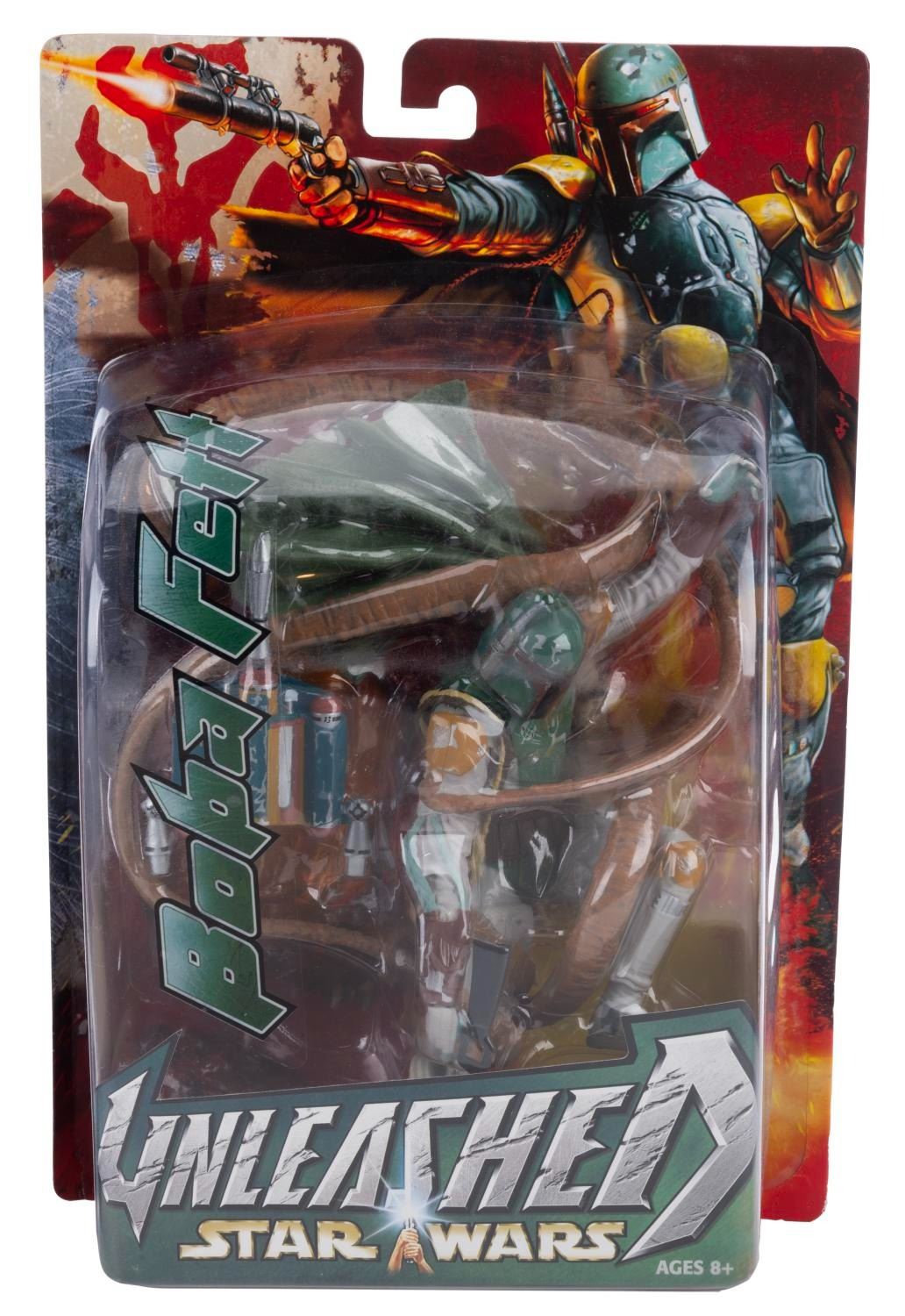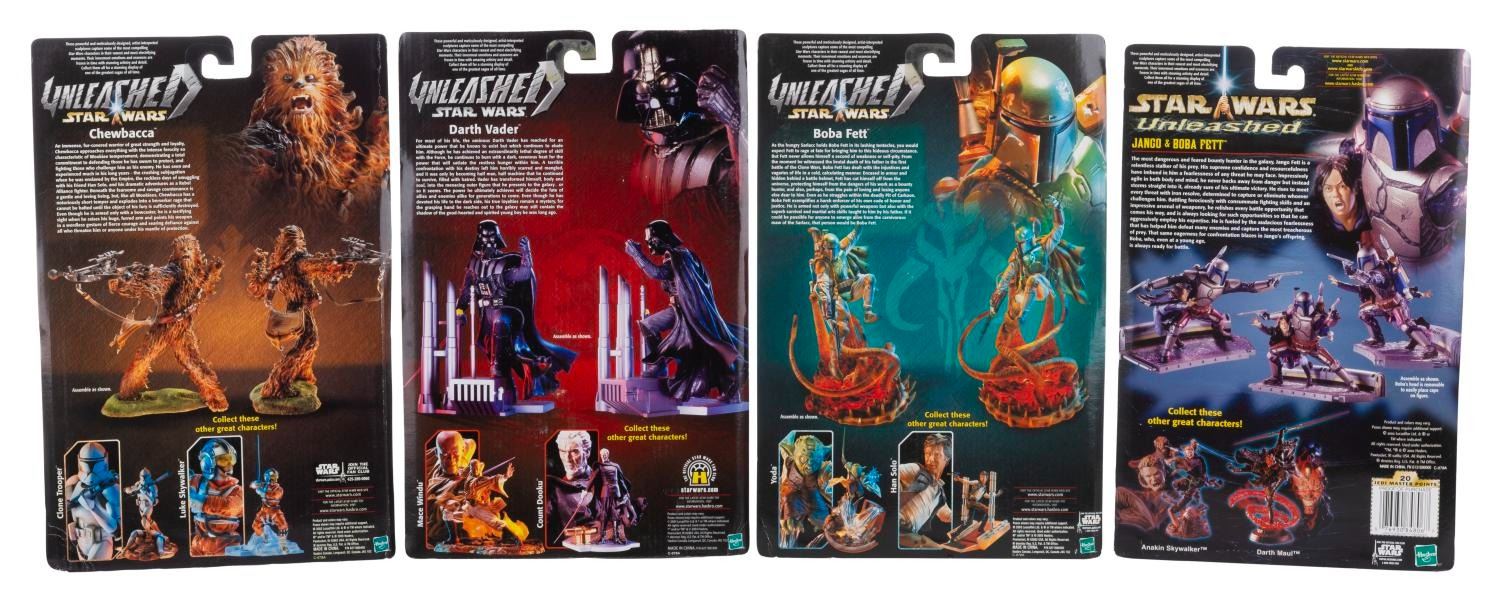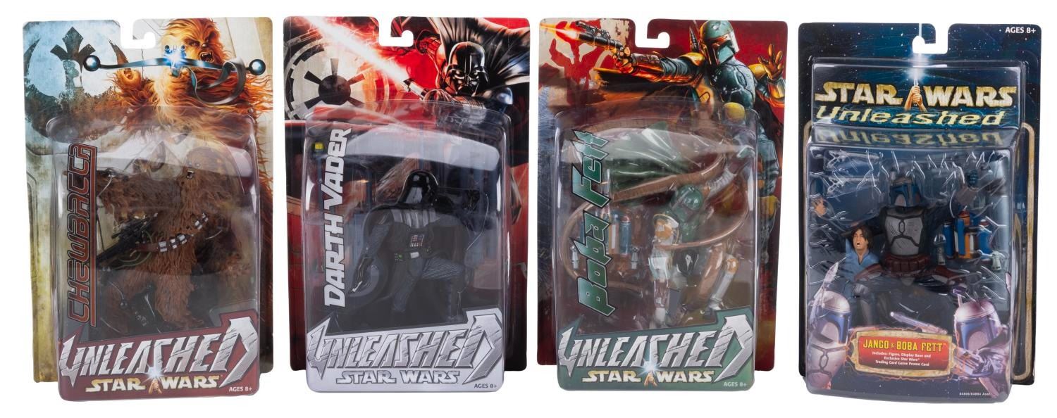 (Hasbro, 2002-2004) A collection of four unopened Star Wars Unleashed figures including Darth Vader, Boba Fett, Chewbacca, and Jango with a young Boba Fett. Measuring 8.75” x 3.75” x 13.75”, the figures display in good condition with wear and creasing to the backing cards.